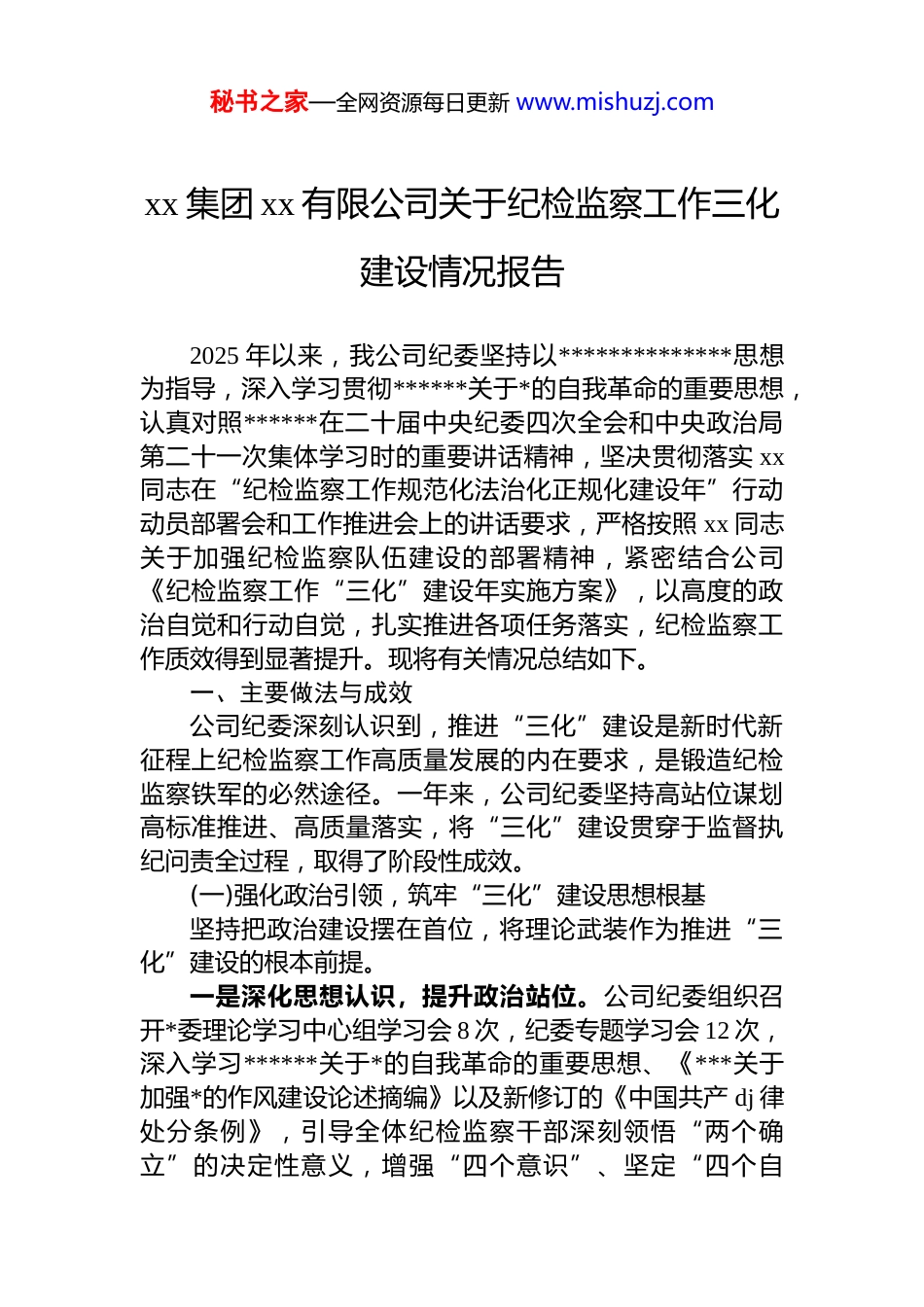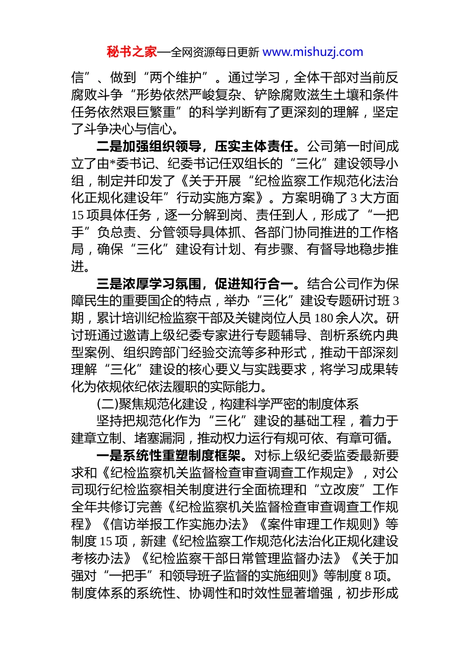 秘书之家—全网资源每日更新 www.mishuzj.comxx 集团 xx 有限公司关于纪检监察工作三化建设情况报告2025 年以来,我公司纪委坚持以**************思想为指导,深入学习贯彻******关于*的自我革命的重要思想,认真对照******在二十届中央纪委四次全会和中央政治局第二十一次集体学习时的重要讲话精神,坚决贯彻落实 xx同志在“纪检监察工作规范化法治化正规化建设年”行动动员部署会和工作推进会上的讲话要求,严格按照 xx 同志关于加强纪检监察队伍建设的部署精神,紧密结合公司《纪检监察工作“三化”建设年实施方案》,以高度的政治自觉和行动自觉,扎实推进各项任务落实,纪检监察工作质效得到显著提升。现将有关情况总结如下。一、主要做法与成效公司纪委深刻认识到,推进“三化”建设是新时代新征程上纪检监察工作高质量发展的内在要求,是锻造纪检监察铁军的必然途径。一年来,公司纪委坚持高站位谋划高标准推进、高质量落实,将“三化”建设贯穿于监督执纪问责全过程,取得了阶段性成效。(一)强化政治引领,筑牢“三化”建设思想根基坚持把政治建设摆在首位,将理论武装作为推进“三化”建设的根本前提。一是深化思想认识,提升政治站位。公司纪委组织召开*委理论学习中心组学习会 8 次,纪委专题学习会 12 次,深入学习******关于*的自我革命的重要思想、《***关于加强*的作风建设论述摘编》以及新修订的《中国共产 dj 律处分条例》,引导全体纪检监察干部深刻领悟“两个确立”的决定性意义,增强“四个意识”、坚定“四个自秘书之家—全网资源每日更新 www.mishuzj.com信”、做到“两个维护”。通过学习,全体干部对当前反腐败斗争“形势依然严峻复杂、铲除腐败滋生土壤和条件任务依然艰巨繁重”的科学判断有了更深刻的理解,坚定了斗争决心与信心。二是加强组织领导,压实主体责任。公司第一时间成立了由*委书记、纪委书记任双组长的“三化”建设领导小组,制定并印发了《关于开展“纪检监察工作规范化法治化正规化建设年”行动实施方案》。方案明确了 3 大方面15 项具体任务,逐一分解到岗、责任到人,形成了“一把手”负总责、分管领导具体抓、各部门协同推进的工作格局,确保“三化”建设有计划、有步骤、有督导地稳步推进。三是浓厚学习氛围,促进知行合一。结合公司作为保障民生的重要国企的特点,举办“三化”建设专题研讨班 3期,累计培训纪检监察干部及关键岗位人员 180 余人次。研讨班通过邀请上级纪委专家进行专题辅导、剖析系统内典型案例、组织跨部门经验交流等多种形式,推动干部深刻理解“三化”建设的核心要义与实践要求,将学习成果转化为依规依纪依法履职的实际能力。(二)聚焦规范化建设,构建科学严密的制度体系坚持把规范化作为“三化”建设的基础工程,着力于建章立制、堵塞漏洞,推动权力运行有规可依、有章可循。一是系统性重塑制度框架。对标上级纪委监委最新要求和《纪检监察机关监督检查审查调查工作规定》,对公司现行纪检监察相关制度进行全面梳理和“立改废”工作全年共修订完善《纪检监察机关监督检查审查调查工作规程》《信访举报工作实施办法》《案件审理工作规则》等制度 15 项,新建《纪检监察工作规范化法治化正规化建设考核办法》《纪检监察干部日常管理监督办法》《关于加强对“一把手”和领导班子监督的实施细则》等制度 8 项。制度体系的系统性、协调性和时效性显著增强,初步形成秘书之家—全网资源每日更新 www.mishuzj.com了覆盖监督检查、线索处置、审查调查、案件审理、队伍建设全流程的制度闭环。二是精细化管理工作流程。针对监督执纪权力运行的关键环节,制定了《监督检查工作指引》和《审查调查工作手册》,将复杂的业务流程分解为 35 个具体工作环节,明确每个环节的标准程序、操作规范和文书模板,实现了关键节点全程留痕、可追溯、可核查。同时,建立问题线索“集中管理、集体研判、动态清零”机制,制定《问题线索处置工作规范》,确保线索受理、分流、核查、处置反馈等环节规范有序,做到“件件有着落、事事有回音”截至 2025 年 11 月 27 日,公司纪委共处置问题线索 327 件...