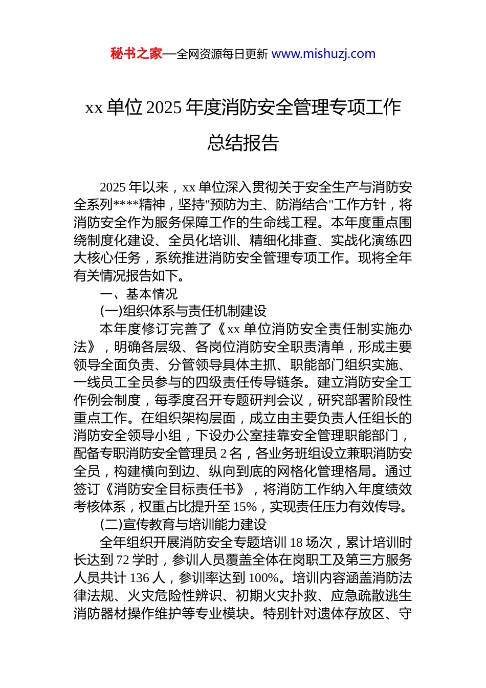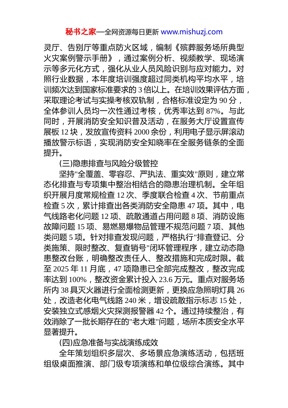 秘书之家—全网资源每日更新 www.mishuzj.comxx 单位 2025 年度消防安全管理专项工作总结报告2025 年以来,xx 单位深入贯彻关于安全生产与消防安全系列****精神,坚持"预防为主、防消结合"工作方针,将消防安全作为服务保障工作的生命线工程。本年度重点围绕制度化建设、全员化培训、精细化排查、实战化演练四大核心任务,系统推进消防安全管理专项工作。现将全年有关情况报告如下。一、基本情况(一)组织体系与责任机制建设本年度修订完善了《xx 单位消防安全责任制实施办法》,明确各层级、各岗位消防安全职责清单,形成主要领导全面负责、分管领导具体主抓、职能部门组织实施、一线员工全员参与的四级责任传导链条。建立消防安全工作例会制度,每季度召开专题研判会议,研究部署阶段性重点工作。在组织架构层面,成立由主要负责人任组长的消防安全领导小组,下设办公室挂靠安全管理职能部门,配备专职消防安全管理员 2 名,各业务班组设立兼职消防安全员,构建横向到边、纵向到底的网格化管理格局。通过签订《消防安全目标责任书》,将消防工作纳入年度绩效考核体系,权重占比提升至 15%,实现责任压力有效传导。(二)宣传教育与培训能力建设全年组织开展消防安全专题培训 18 场次,累计培训时长达到 72 学时,参训人员覆盖全体在岗职工及第三方服务人员共计 136 人,参训率达到 100%。培训内容涵盖消防法律法规、火灾危险性辨识、初期火灾扑救、应急疏散逃生消防器材操作维护等专业模块。特别针对遗体存放区、守秘书之家—全网资源每日更新 www.mishuzj.com灵厅、告别厅等重点防火区域,编制《殡葬服务场所典型火灾案例警示手册》,通过案例分析、视频教学、现场演示等多元化方式,强化从业人员风险识别与应对能力。对照行业数据,本年度培训强度超过同类机构平均水平,培训频次达到国家标准要求的 3 倍以上。在培训效果评估方面,采取理论考试与实操考核双轨制,合格标准设定为 90 分,全体参训人员均一次性通过考核,优秀率达到 87%。与此同时,开展消防安全知识普及活动,在服务大厅设置宣传展板 12 块,发放宣传资料 2000 余份,利用电子显示屏滚动播放警示标语,实现消防安全知晓率在全服务链条的全面提升。(三)隐患排查与风险分级管控坚持"全覆盖、零容忍、严执法、重实效"原则,建立常态化排查与专项集中整治相结合的隐患治理机制。全年组织开展月度常规检查 12 次、季度联合检查 4 次、节前重点检查 5 次,累计排查出各类消防安全隐患 47 项。其中,电气线路老化问题 12 项、疏散通道占用问题 8 项、消防设施故障问题 15 项、易燃易爆物品管理不规范问题 7 项、其他类问题 5 项。针对排查发现问题,严格执行"排查登记、分类施策、限时整改、复查销号"闭环管理程序,建立动态隐患整改台账,明确整改责任人、整改措施和完成时限。截至 2025 年 11 月底,47 项隐患已全部完成整改,整改完成率达到 100%,整改资金累计投入 23.6 万元。重点对服务场所内 38 具灭火器进行全面检测更新,更换应急照明灯具 26处,改造老化电气线路 240 米,增设疏散指示标志 15 处,安装独立式感烟火灾探测报警器 42 个。通过持续整治,有效消除了一批长期存在的"老大难"问题,场所本质安全水平显著提升。(四)应急准备与实战演练成效全年策划组织多层次、多场景应急演练活动,包括班组级桌面推演、部门级专项演练和单位级综合演练。其中秘书之家—全网资源每日更新 www.mishuzj.com组织消防灭火实战演练 6 次,应急疏散演练 4 次,夜间突发火情专项演练 2 次,累计参与演练人员达到 324 人次。演练科目设置紧密结合殡葬服务场所实际,重点模拟守灵厅电器短路引发火灾、遗体存放区易燃气体泄漏等高风险场景每次演练均按照预案启动、信息报告、人员疏散、火灾扑救、善后处置全流程实施,演练全过程影像记录并存档备查。通过反复演练,全体从业人员熟练掌握"提、拔、握、压"灭火器操作要领和"弯腰、低姿、捂口鼻"疏散逃生规范,初期火灾扑救成功率提升至 95%以上,应急疏散平均时间缩短至 3 分钟以内。特别针对特殊群体...