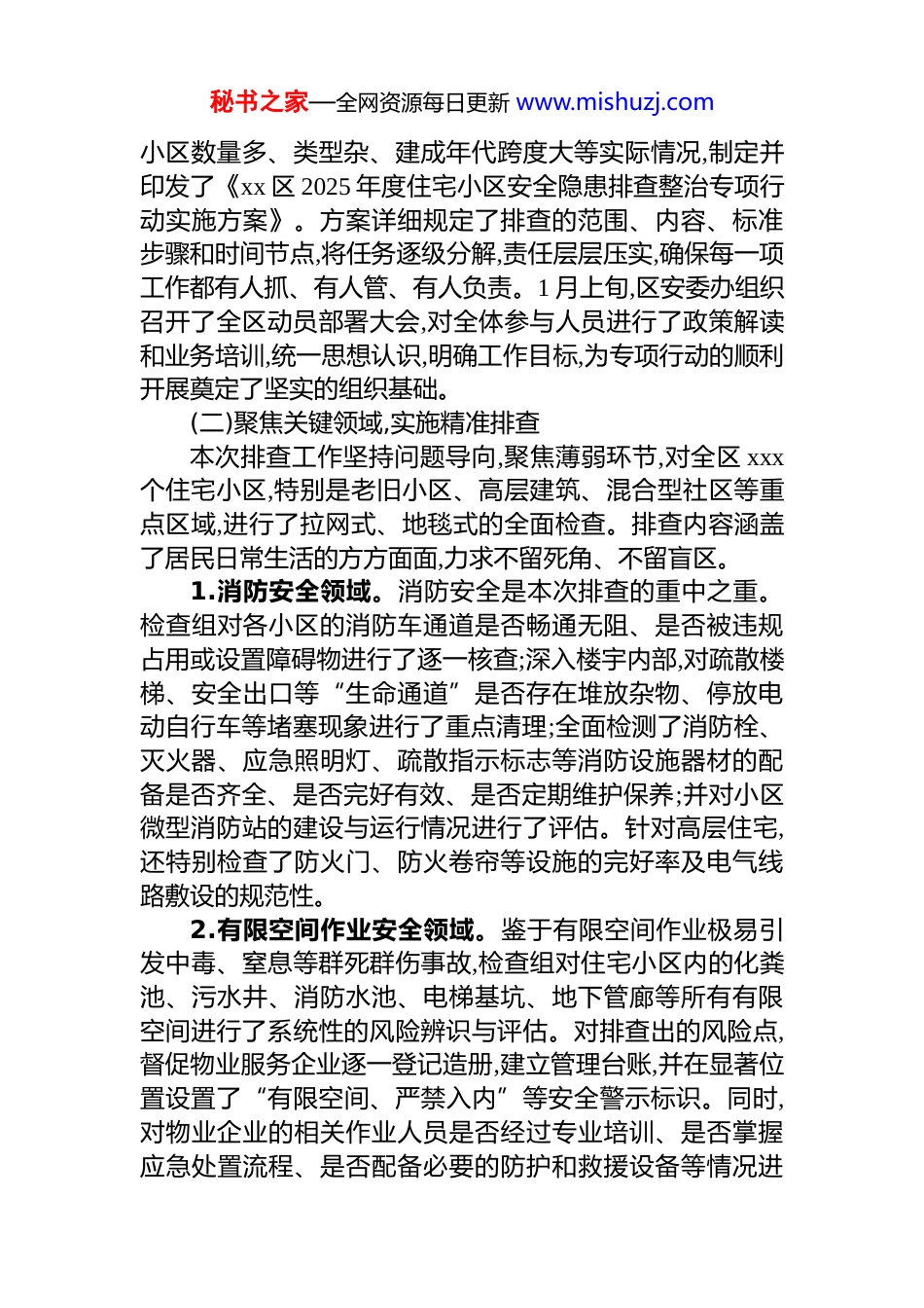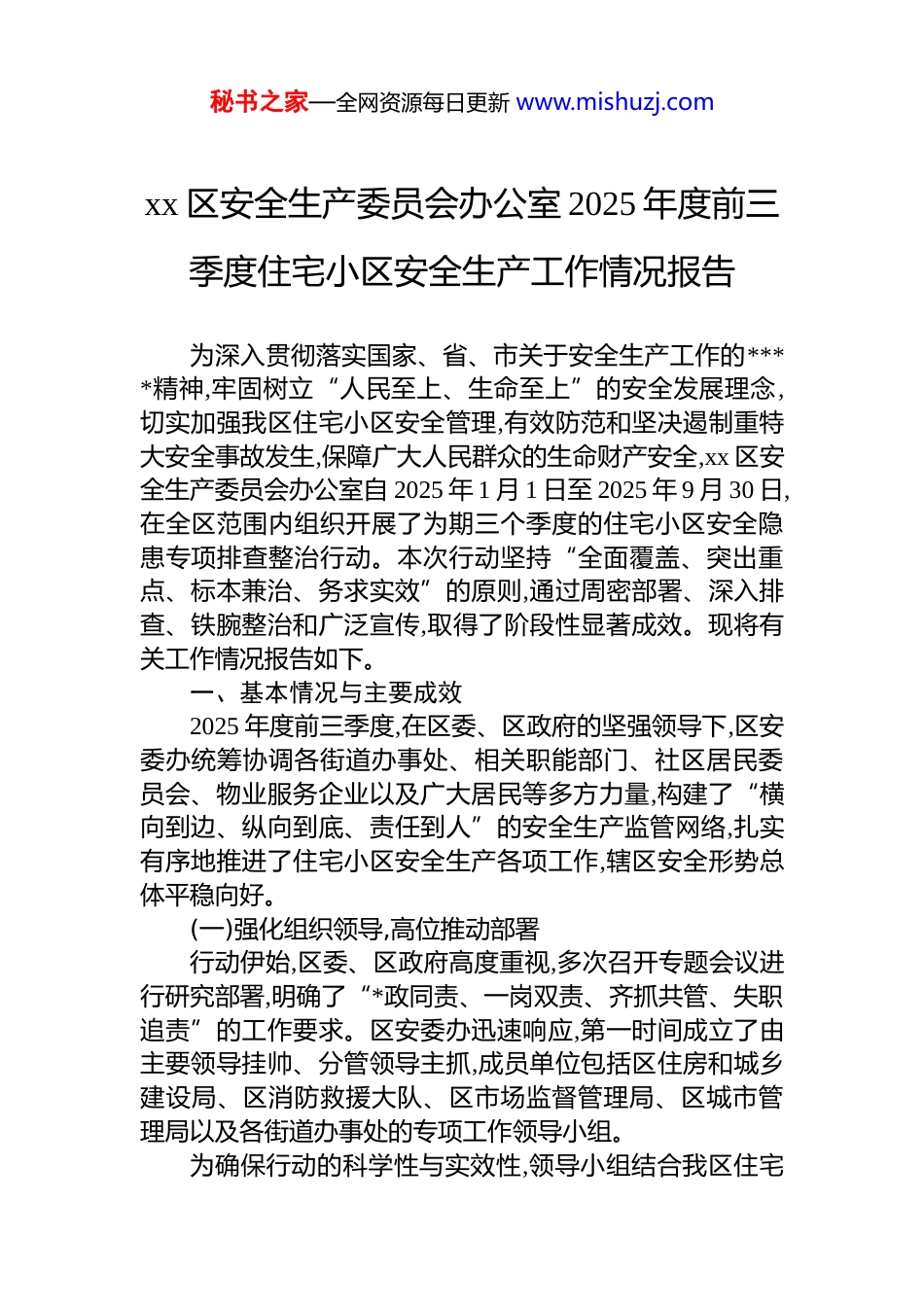 秘书之家—全网资源每日更新 www.mishuzj.comxx 区安全生产委员会办公室 2025 年度前三季度住宅小区安全生产工作情况报告为深入贯彻落实国家、省、市关于安全生产工作的****精神,牢固树立“人民至上、生命至上”的安全发展理念,切实加强我区住宅小区安全管理,有效防范和坚决遏制重特大安全事故发生,保障广大人民群众的生命财产安全,xx 区安全生产委员会办公室自 2025 年 1 月 1 日至 2025 年 9 月 30 日,在全区范围内组织开展了为期三个季度的住宅小区安全隐患专项排查整治行动。本次行动坚持“全面覆盖、突出重点、标本兼治、务求实效”的原则,通过周密部署、深入排查、铁腕整治和广泛宣传,取得了阶段性显著成效。现将有关工作情况报告如下。一、基本情况与主要成效2025 年度前三季度,在区委、区政府的坚强领导下,区安委办统筹协调各街道办事处、相关职能部门、社区居民委员会、物业服务企业以及广大居民等多方力量,构建了“横向到边、纵向到底、责任到人”的安全生产监管网络,扎实有序地推进了住宅小区安全生产各项工作,辖区安全形势总体平稳向好。(一)强化组织领导,高位推动部署行动伊始,区委、区政府高度重视,多次召开专题会议进行研究部署,明确了“*政同责、一岗双责、齐抓共管、失职追责”的工作要求。区安委办迅速响应,第一时间成立了由主要领导挂帅、分管领导主抓,成员单位包括区住房和城乡建设局、区消防救援大队、区市场监督管理局、区城市管理局以及各街道办事处的专项工作领导小组。为确保行动的科学性与实效性,领导小组结合我区住宅秘书之家—全网资源每日更新 www.mishuzj.com小区数量多、类型杂、建成年代跨度大等实际情况,制定并印发了《xx 区 2025 年度住宅小区安全隐患排查整治专项行动实施方案》。方案详细规定了排查的范围、内容、标准步骤和时间节点,将任务逐级分解,责任层层压实,确保每一项工作都有人抓、有人管、有人负责。1 月上旬,区安委办组织召开了全区动员部署大会,对全体参与人员进行了政策解读和业务培训,统一思想认识,明确工作目标,为专项行动的顺利开展奠定了坚实的组织基础。(二)聚焦关键领域,实施精准排查本次排查工作坚持问题导向,聚焦薄弱环节,对全区 xxx个住宅小区,特别是老旧小区、高层建筑、混合型社区等重点区域,进行了拉网式、地毯式的全面检查。排查内容涵盖了居民日常生活的方方面面,力求不留死角、不留盲区。1.消防安全领域。消防安全是本次排查的重中之重。检查组对各小区的消防车通道是否畅通无阻、是否被违规占用或设置障碍物进行了逐一核查;深入楼宇内部,对疏散楼梯、安全出口等“生命通道”是否存在堆放杂物、停放电动自行车等堵塞现象进行了重点清理;全面检测了消防栓、灭火器、应急照明灯、疏散指示标志等消防设施器材的配备是否齐全、是否完好有效、是否定期维护保养;并对小区微型消防站的建设与运行情况进行了评估。针对高层住宅,还特别检查了防火门、防火卷帘等设施的完好率及电气线路敷设的规范性。2.有限空间作业安全领域。鉴于有限空间作业极易引发中毒、窒息等群死群伤事故,检查组对住宅小区内的化粪池、污水井、消防水池、电梯基坑、地下管廊等所有有限空间进行了系统性的风险辨识与评估。对排查出的风险点,督促物业服务企业逐一登记造册,建立管理台账,并在显著位置设置了“有限空间、严禁入内”等安全警示标识。同时,对物业企业的相关作业人员是否经过专业培训、是否掌握应急处置流程、是否配备必要的防护和救援设备等情况进秘书之家—全网资源每日更新 www.mishuzj.com行了严格审查,严防无知者无畏、冒险作业。3.居民用电用气及冬季供暖安全领域。结合季节性特点,检查组加大了对居民家庭用电用气安全的宣传和检查力度。通过入户走访、发放宣传单、举办知识讲座等形式,积极向居民普及安全用电用气常识,引导居民养成“三清三关”的良好习惯。重点排查了私拉乱接电线、电动自行车违规入户充电、燃气软管老化、使用不合格燃气灶具等突出问题,对发现的隐患,现场进行劝导和教育,并协助居民联系专业人员进行整改。4.基础设施与公共设施安全领域。基础设施的安全状态直接关系到居民的出行与活动安...