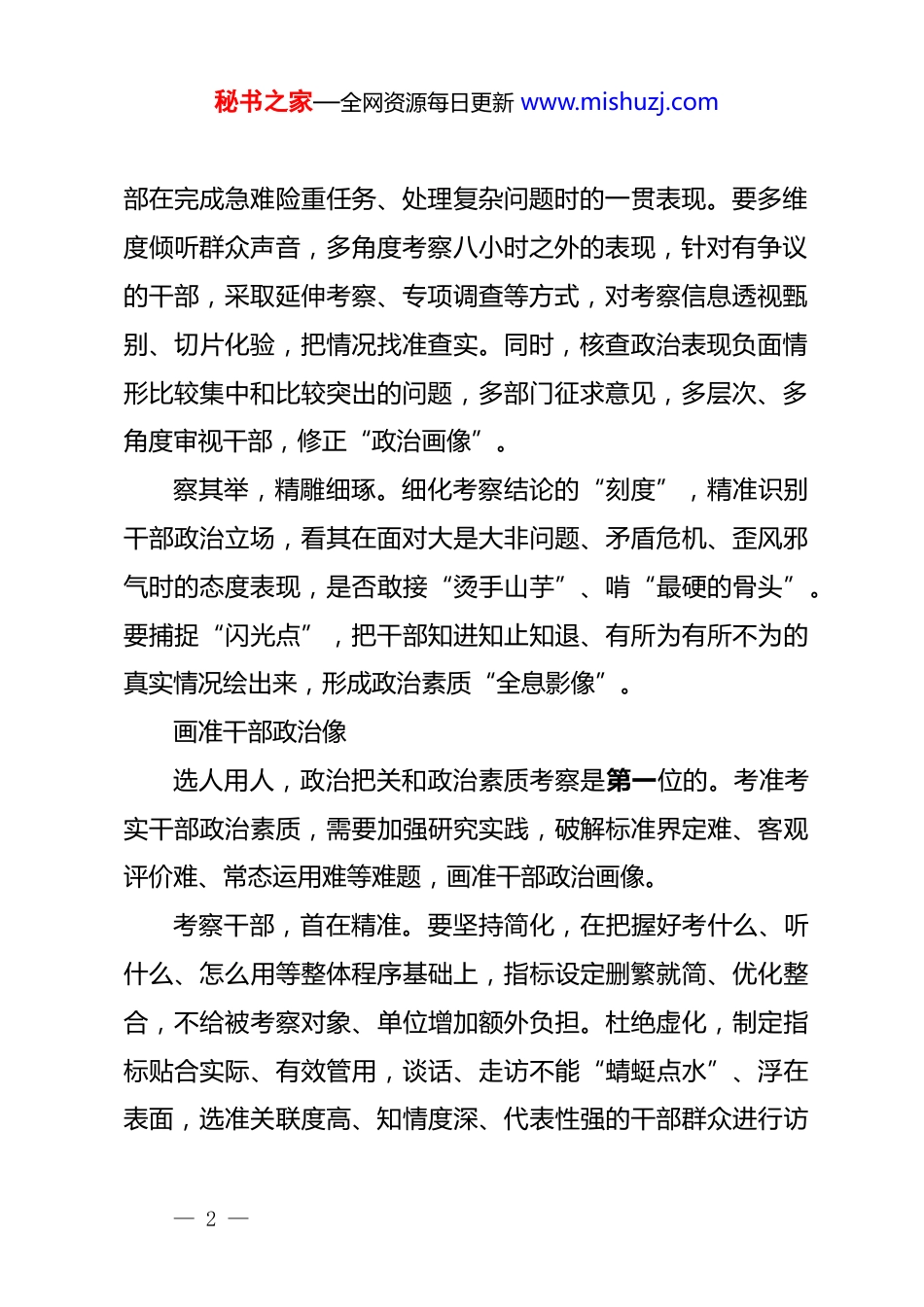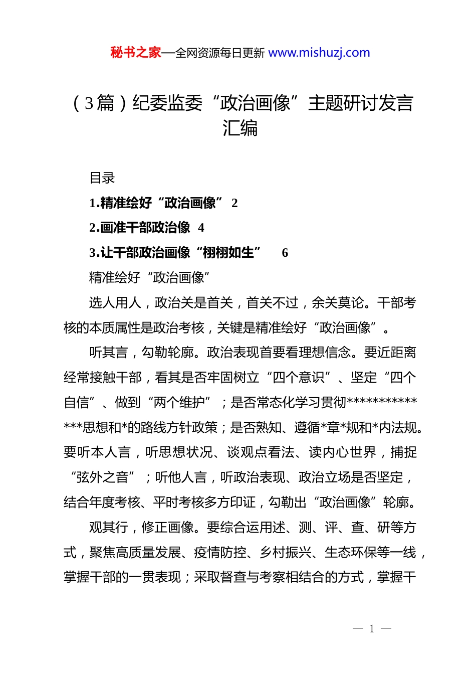 秘书之家—全网资源每日更新 www.mishuzj.com(3 篇)纪委监委“政治画像”主题研讨发言汇编目录1.精准绘好“政治画像” 22.画准干部政治像 43.让干部政治画像“栩栩如生”6精准绘好“政治画像”选人用人,政治关是首关,首关不过,余关莫论。干部考核的本质属性是政治考核,关键是精准绘好“政治画像”。听其言,勾勒轮廓。政治表现首要看理想信念。要近距离经常接触干部,看其是否牢固树立“四个意识”、坚定“四个自信”、做到“两个维护”;是否常态化学习贯彻**************思想和*的路线方针政策;是否熟知、遵循*章*规和*内法规。要听本人言,听思想状况、谈观点看法、读内心世界,捕捉“弦外之音”;听他人言,听政治表现、政治立场是否坚定,结合年度考核、平时考核多方印证,勾勒出“政治画像”轮廓。观其行,修正画像。要综合运用述、测、评、查、研等方式,聚焦高质量发展、疫情防控、乡村振兴、生态环保等一线,掌握干部的一贯表现;采取督查与考察相结合的方式,掌握干— 1 —秘书之家—全网资源每日更新 www.mishuzj.com部在完成急难险重任务、处理复杂问题时的一贯表现。要多维度倾听群众声音,多角度考察八小时之外的表现,针对有争议的干部,采取延伸考察、专项调查等方式,对考察信息透视甄别、切片化验,把情况找准查实。同时,核查政治表现负面情形比较集中和比较突出的问题,多部门征求意见,多层次、多角度审视干部,修正“政治画像”。察其举,精雕细琢。细化考察结论的“刻度”,精准识别干部政治立场,看其在面对大是大非问题、矛盾危机、歪风邪气时的态度表现,是否敢接“烫手山芋”、啃“最硬的骨头”。要捕捉“闪光点”,把干部知进知止知退、有所为有所不为的真实情况绘出来,形成政治素质“全息影像”。画准干部政治像选人用人,政治把关和政治素质考察是第一位的。考准考实干部政治素质,需要加强研究实践,破解标准界定难、客观评价难、常态运用难等难题,画准干部政治画像。考察干部,首在精准。要坚持简化,在把握好考什么、听什么、怎么用等整体程序基础上,指标设定删繁就简、优化整合,不给被考察对象、单位增加额外负担。杜绝虚化,制定指标贴合实际、有效管用,谈话、走访不能“蜻蜓点水”、浮在表面,选准关联度高、知情度深、代表性强的干部群众进行访— 2 —秘书之家—全网资源每日更新 www.mishuzj.com谈测评,确保评价有人佐证、有事印证,切实让干部的政治素质看得见、可衡量。谨防泛化,要深入考察干部贯彻落实**********批示精神和*中央决策部署的政治态度和实际成效,看是否增强“四个意识”、坚定“四个自信”、做到“两个维护”,是否自觉增强政治判断力、政治领悟力、政治执行力,是否严守政治纪律和政治规矩等,同时结合干部岗位性质、职责要求等,设置个性化考察指标,推动政治素质考察落于微观、体现具体。评价干部,重在全面。要避免以偏概全,提前制定谈话提纲,让被谈话对象有的放矢、言之有物,并对谈话中了解到的重大任务、重要事项、重点工作进行实地察看,与“面对面”的情况比对验证,确保科学准确、客观公正。设定一定数量的正反指标,明确被谈话对象根据实际情况选填一定比例、最具特色的指标,改变干部考察“讲好话多、谈问题少”的情况,把政治忠诚、政治定力、政治担当、政治能力、政治自律等方面的表现看清楚、察明白,画清画准干部政治“画像”。了解干部,贵在常态。既看干部一朝一夕、一时一事的表现,更看不同时期、不同岗位的一贯作风。察在平时,不搞急拿现用、不求一时之功,结合年度考核、走访调研,嵌入式开展日常政治素质考察,看干部急难险重问题处置、个人进退留— 3 —秘书之家—全网资源每日更新 www.mishuzj.com转态度以及违纪违法、组织处理、信访等情况,作为检验干部政治表现的“第一手资料”。管在长远,开展任前、年度、专项等政治素质考察,建立政治素质档案。用在实处,在干部人事调整、评先评优时用好政治素质档案,选人用人政治上不合格的一票否决,切实选出过得硬、靠得住的干部。让干部政治画像“栩栩如生”******指出,坚持正确选人用人导向,要把政治标准放在第一...