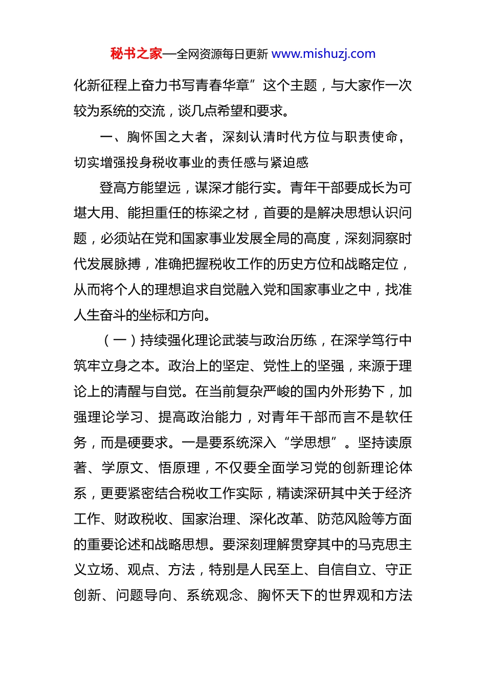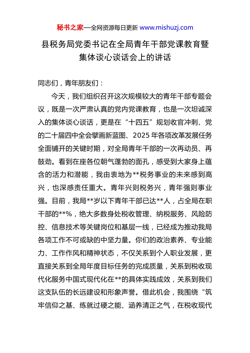 秘书之家—全网资源每日更新 www.mishuzj.com县税务局党委书记在全局青年干部党课教育暨集体谈心谈话会上的讲话 同志们,青年朋友们:今天,我们组织召开这次规模较大的青年干部专题会议,既是一次严肃认真的党内党课教育,也是一次坦诚深入的集体谈心谈话,更是在“十四五”规划收官冲刺、党的二十届四中全会擘画新蓝图、2025 年各项改革发展任务全面铺开的关键时期,对全局青年干部的一次再动员、再鼓劲。看到在座各位朝气蓬勃的面孔,感受到大家身上蕴含的活力和潜能,我由衷地为**税务事业的未来感到高兴,也深感责任重大。青年兴则税务兴,青年强则事业强。目前,我局**岁以下青年干部已达**人,占全局在职干部的**%,绝大多数身处税收管理、纳税服务、风险防控、信息技术等关键岗位和基层一线,已经成为推动我局各项工作不可或缺的中坚力量。你们的政治素养、专业能力、工作作风和精神状态,不仅关系到个人职业发展,更直接关系到全局年度目标任务的完成质量,关系到税收现代化服务中国式现代化在**的具体实践成效,关系到我们这支队伍的长远建设和形象声誉。借此机会,我围绕“筑牢信仰之基、练就过硬之能、涵养清正之气,在税收现代秘书之家—全网资源每日更新 www.mishuzj.com化新征程上奋力书写青春华章”这个主题,与大家作一次较为系统的交流,谈几点希望和要求。一、胸怀国之大者,深刻认清时代方位与职责使命,切实增强投身税收事业的责任感与紧迫感登高方能望远,谋深才能行实。青年干部要成长为可堪大用、能担重任的栋梁之材,首要的是解决思想认识问题,必须站在党和国家事业发展全局的高度,深刻洞察时代发展脉搏,准确把握税收工作的历史方位和战略定位,从而将个人的理想追求自觉融入党和国家事业之中,找准人生奋斗的坐标和方向。(一)持续强化理论武装与政治历练,在深学笃行中筑牢立身之本。政治上的坚定、党性上的坚强,来源于理论上的清醒与自觉。在当前复杂严峻的国内外形势下,加强理论学习、提高政治能力,对青年干部而言不是软任务,而是硬要求。一是要系统深入“学思想”。坚持读原著、学原文、悟原理,不仅要全面学习党的创新理论体系,更要紧密结合税收工作实际,精读深研其中关于经济工作、财政税收、国家治理、深化改革、防范风险等方面的重要论述和战略思想。要深刻理解贯穿其中的马克思主义立场、观点、方法,特别是人民至上、自信自立、守正创新、问题导向、系统观念、胸怀天下的世界观和方法秘书之家—全网资源每日更新 www.mishuzj.com论,努力掌握其精髓要义,做到知其言更知其义、知其然更知其所以然。二是要及时跟进“悟思想”。密切关注党中央的最新精神、重大决策部署以及上级党委政府、税务总局的工作要求。要深刻领会 2025 年中央经济工作会议提出的“稳中求进、以进促稳、先立后破”核心要求,深入理解关于“因地制宜发展新质生产力”、“深化重点领域改革”、“扩大高水平对外开放”、“持续有效防范化解重点领域风险”等一系列战略谋划。要结合省委、市委全会确定的本地化落实方案,思考税收工作在其中扮演的角色和发力点,确保思想跟得上党中央要求、跟得上时代步伐。三是要融会贯通“用思想”。大力弘扬理论联系实际的优良学风,坚决反对本本主义和空对空。要带着问题学、联系实际思、投身实践用。将学习成果与**县情税情紧密结合,与组织收入、落实政策、优化服务、强化监管、队伍建设等具体工作深度融合,聚焦当前面临的突出矛盾和问题,例如如何更精准落实结构性减税降费政策激发市场主体活力,如何运用税收大数据服务地方党委政府科学决策,如何在智慧税务建设中提升干部数字素养和治理能力等,开展前瞻性思考和研究,努力把学习成效转化为谋划工作的科学思路、破解难题的务实举措、推动发展的实际能力,切实克服学用脱节、知行不一的问题。秘书之家—全网资源每日更新 www.mishuzj.com(二)自觉站位全局服务大局,在洞察大势中明晰履职之要。税收从来不是孤立存在的,它是连接国家政策与微观市场主体的重要纽带,是观察经济运行的“晴雨表”,也是实施宏观调控的重要工具。青年干部必须具备开阔的视野和全局的...