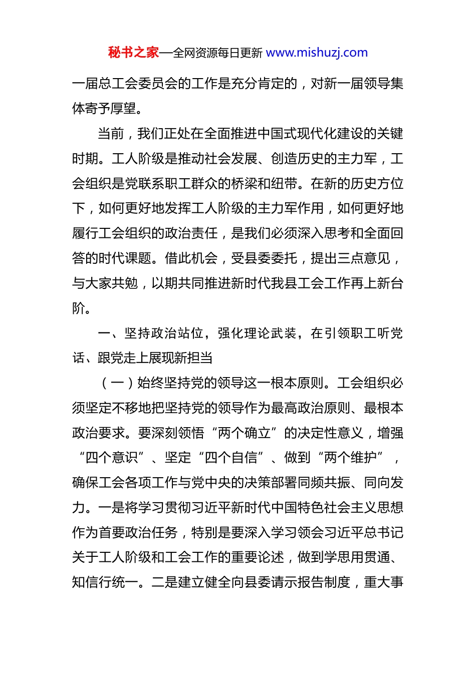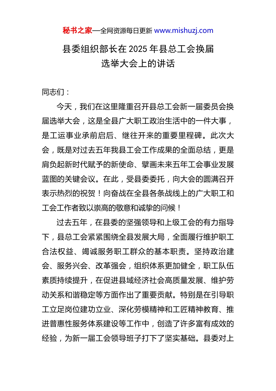秘书之家—全网资源每日更新 www.mishuzj.com县委组织部长在 2025 年县总工会换届选举大会上的讲话 同志们:今天,我们在这里隆重召开县总工会新一届委员会换届选举大会,这是全县广大职工政治生活中的一件大事,是工运事业承前启后、继往开来的重要里程碑。此次大会,既是对过去五年我县工会工作成果的全面总结,更是肩负起新时代赋予的新使命、擘画未来五年工会事业发展蓝图的关键会议。在此,受县委委托,向大会的圆满召开表示热烈的祝贺!向奋战在全县各条战线上的广大职工和工会工作者致以崇高的敬意和诚挚的问候!过去五年,在县委的坚强领导和上级工会的有力指导下,县总工会紧紧围绕全县发展大局,全面履行维护职工合法权益、竭诚服务职工群众的基本职责。坚持政治建会、服务兴会、改革强会,组织体系更加健全,职工队伍素质持续提升,在促进县域经济社会高质量发展、维护劳动关系和谐稳定等方面作出了重要贡献。特别是在引导职工立足岗位建功立业、深化劳模精神和工匠精神教育、推进普惠性服务体系建设等工作中,创造了许多富有成效的经验,为新一届工会领导班子打下了坚实基础。县委对上秘书之家—全网资源每日更新 www.mishuzj.com一届总工会委员会的工作是充分肯定的,对新一届领导集体寄予厚望。当前,我们正处在全面推进中国式现代化建设的关键时期。工人阶级是推动社会发展、创造历史的主力军,工会组织是党联系职工群众的桥梁和纽带。在新的历史方位下,如何更好地发挥工人阶级的主力军作用,如何更好地履行工会组织的政治责任,是我们必须深入思考和全面回答的时代课题。借此机会,受县委委托,提出三点意见,与大家共勉,以期共同推进新时代我县工会工作再上新台阶。一、坚持政治站位,强化理论武装,在引领职工听党话、跟党走上展现新担当(一)始终坚持党的领导这一根本原则。工会组织必须坚定不移地把坚持党的领导作为最高政治原则、最根本政治要求。要深刻领悟“两个确立”的决定性意义,增强“四个意识”、坚定“四个自信”、做到“两个维护”,确保工会各项工作与党中央的决策部署同频共振、同向发力。一是将学习贯彻习近平新时代中国特色社会主义思想作为首要政治任务,特别是要深入学习领会习近平总书记关于工人阶级和工会工作的重要论述,做到学思用贯通、知信行统一。二是建立健全向县委请示报告制度,重大事秘书之家—全网资源每日更新 www.mishuzj.com项、重要工作必须主动请示汇报,确保工会工作在县委统一领导下进行。三是把党建工作融入工会建设全过程,以高质量的党建引领保障工会工作高质量发展,严把政治关、廉洁关,确保工会干部队伍的纯洁性和先进性。(二)全面深化思想政治引领这一核心任务。工会组织担负着团结引导广大职工群众的政治责任。新一届工会要创新方式方法,抓好职工的思想政治教育工作,使广大职工群众深刻认识自身肩负的历史使命。一是围绕县域经济社会发展目标,开展多形式、分层次的宣传教育活动,引导职工将个人理想融入国家发展和县域建设的大局之中。二是弘扬主旋律,讲好劳模故事、劳动故事、工匠故事,通过榜样的力量激励广大职工爱岗敬业、拼搏奉献。要利用好“五一”国际劳动节、全国两会等重要时间节点,广泛宣传党的政策,切实将党的声音传递到车间、工地、班组,真正实现思想政治工作走深走实。三是加强对职工的人文关怀和心理疏导,针对新业态劳动者、青年职工等群体的特点,开展精准化的思想引导,帮助他们解决思想困惑,增强对党组织的信任和归属感。(三)着力构建“大宣传”工作格局。工会作为重要宣传阵地,要善于运用各类媒体平台,特别是新媒体技术,提升宣传的覆盖面和影响力。一是强化工会媒体矩阵秘书之家—全网资源每日更新 www.mishuzj.com建设,充分利用微信公众号、短视频等平台,打造一批职工喜闻乐见的宣传产品,增强宣传的亲和力、感染力。二是注重提炼基层工会工作的特色亮点,通过生动的案例展示工会组织在服务发展、服务职工中的实际成效,营造全社会尊重劳动、崇尚技能、关爱职工的良好氛围。三是深化理想信念教育和爱国主义教育,引导职工群众牢固树立正确的历史观、民族观、文化...