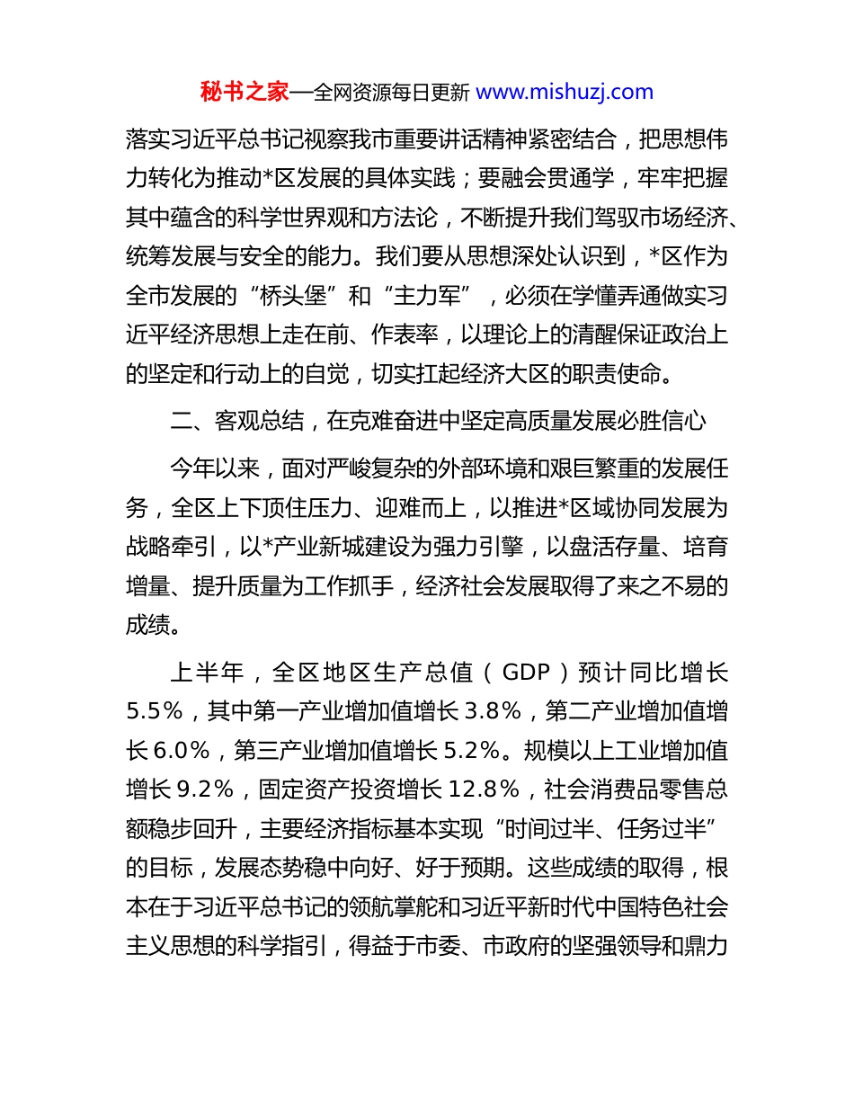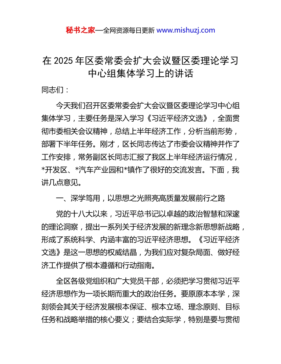 秘书之家—全网资源每日更新 www.mishuzj.com在 2025 年区委常委会扩大会议暨区委理论学习中心组集体学习上的讲话同志们:今天我们召开区委常委会扩大会议暨区委理论学习中心组集体学习,主要任务是深入学习《习近平经济文选》,全面贯彻市委相关会议精神,总结上半年经济工作,分析当前形势,部署下半年任务。刚才,区长同志传达了市委会议精神并作了工作安排,常务副区长同志汇报了我区上半年经济运行情况,*开发区、*汽车产业园和*镇作了很好的交流发言。下面,我讲几点意见。一、深学笃用,以思想之光照亮高质量发展前行之路党的十八大以来,习近平总书记以卓越的政治智慧和深邃的理论洞察,提出一系列关于经济发展的新理念新思想新战略,形成了系统科学、内涵丰富的习近平经济思想。《习近平经济文选》是这一思想的权威结晶,为我们应对复杂局面、做好经济工作提供了根本遵循和行动指南。全区各级党组织和广大党员干部,必须把学习贯彻习近平经济思想作为一项长期而重大的政治任务。要原原本本学,深刻领会其关于经济发展根本保证、根本立场、理念原则、目标任务和战略举措的核心要义;要结合实际学,特别是要与贯彻秘书之家—全网资源每日更新 www.mishuzj.com落实习近平总书记视察我市重要讲话精神紧密结合,把思想伟力转化为推动*区发展的具体实践;要融会贯通学,牢牢把握其中蕴含的科学世界观和方法论,不断提升我们驾驭市场经济、统筹发展与安全的能力。我们要从思想深处认识到,*区作为全市发展的“桥头堡”和“主力军”,必须在学懂弄通做实习近平经济思想上走在前、作表率,以理论上的清醒保证政治上的坚定和行动上的自觉,切实扛起经济大区的职责使命。二、客观总结,在克难奋进中坚定高质量发展必胜信心今年以来,面对严峻复杂的外部环境和艰巨繁重的发展任务,全区上下顶住压力、迎难而上,以推进*区域协同发展为战略牵引,以*产业新城建设为强力引擎,以盘活存量、培育增量、提升质量为工作抓手,经济社会发展取得了来之不易的成绩。上半年,全区地区生产总值( GDP)预计同比增长5.5%,其中第一产业增加值增长 3.8%,第二产业增加值增长 6.0%,第三产业增加值增长 5.2%。规模以上工业增加值增长 9.2%,固定资产投资增长 12.8%,社会消费品零售总额稳步回升,主要经济指标基本实现“时间过半、任务过半”的目标,发展态势稳中向好、好于预期。这些成绩的取得,根本在于习近平总书记的领航掌舵和习近平新时代中国特色社会主义思想的科学指引,得益于市委、市政府的坚强领导和鼎力秘书之家—全网资源每日更新 www.mishuzj.com支持,更凝结着全区广大干部群众的辛勤汗水和不懈奋斗。在此,我代表区委,向大家表示衷心的感谢!在肯定成绩的同时,我们也要清醒地看到,经济运行中仍存在一些突出矛盾和问题,部分行业恢复基础尚不牢固,企业经营仍面临不少困难,风险隐患不容忽视。做好下半年工作,我们必须坚定信心、乘势而上,抓住一切有利时机,用好一切政策举措,挖掘一切潜力资源,以最大努力争取全年最好结果。三、聚焦重点,以精准务实之举开创高质量发展崭新局面下半年是决定“十四五”能否圆满收官的关键时期,也是谋划“十五五”良好开局的重要节点。全区工作千头万绪,必须纲举目张,集中力量抓好几件大事、实事、难事、要事。(一)保障国际活动,展现区域新形象。服务保障重大国际活动是重要政治任务,更是展示*区形象的绝佳机遇。需以最高标准、最严要求,从严从细从实做好各领域工作。安全生产上,对大型场馆、交通枢纽等重点场所全面排查,整改各类隐患,坚决守住安全底线;社会稳定方面,强化防控,及时化解矛盾,确保社会秩序井然;网络安全领域,筑牢防线,严防数据泄露和网络攻击。同时,持续提升城市精细化管理水平,对主次干道进行改造升级,优化市容环境,塑造整洁优美、文明有序的城市面貌。借活动东风,主动加强与海外地区的经贸秘书之家—全网资源每日更新 www.mishuzj.com联系,举办经贸交流活动,推动合作项目落地;深化人文交流,让世界领略*奋发向上、锐意创新、开放包容的新风貌。(二)紧盯发展目标,筑牢经济硬支...