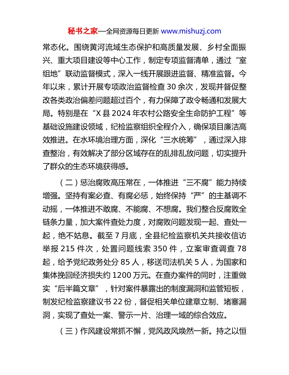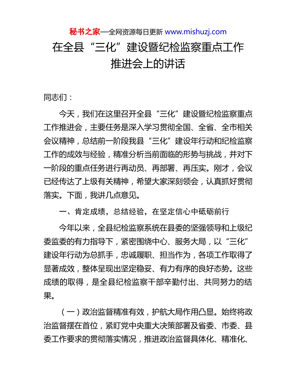 秘书之家—全网资源每日更新 www.mishuzj.com在全县“三化”建设暨纪检监察重点工作推进会上的讲话同志们:今天,我们在这里召开全县“三化”建设暨纪检监察重点工作推进会,主要任务是深入学习贯彻全国、全省、全市相关会议精神,总结前一阶段我县“三化”建设年行动和纪检监察工作的成效与经验,精准分析当前面临的形势与挑战,并对下一阶段的重点任务进行再动员、再部署、再压实。刚才,会议已经传达了上级有关精神,希望大家深刻领会,认真抓好贯彻落实。下面,我讲几点意见。一、肯定成绩,总结经验,在坚定信心中砥砺前行今年以来,全县纪检监察系统在县委的坚强领导和上级纪委监委的有力指导下,紧密围绕中心、服务大局,以“三化”建设年行动为总抓手,忠诚履职、担当作为,各项工作取得了显著成效,整体呈现出坚定稳妥、有力有序的良好态势。这些成绩的取得,是全县纪检监察干部辛勤付出、共同努力的结果。(一)政治监督精准有效,护航大局作用凸显。始终将政治监督摆在首位,紧盯党中央重大决策部署及省委、市委、县委工作要求的贯彻落实情况,推进政治监督具体化、精准化、秘书之家—全网资源每日更新 www.mishuzj.com常态化。围绕黄河流域生态保护和高质量发展、乡村全面振兴、重大项目建设等中心工作,制定专项监督清单,通过“室组地”联动监督模式,深入一线开展跟进监督、精准监督。今年以来,累计开展专项政治监督检查 30 余次,发现并督促整改各类政治偏差问题超过百个,有力保障了政令畅通和发展大局。特别是在“X 县 2024 年农村公路安全生命防护工程”等基础设施建设领域,纪检监察组织全程介入,确保项目廉洁高效推进。在水环境治理方面,深化“三水统筹”,通过深入排查整治,有效解决了部分区域存在的乱排乱放问题,切实提升了群众的生态环境获得感。(二)惩治腐败高压常在,一体推进“三不腐”能力持续增强。坚持有案必查、有腐必惩,始终保持“严”的主基调不动摇,一体推进不敢腐、不能腐、不想腐。我们整合反腐败全链条力量,加大案件查处力度,对腐败问题发现一起、查处一起,绝不姑息。截至 7 月底,全县纪检监察机关共接收信访举报 215 件次,处置问题线索 350 件,立案审查调查 78起,给予党纪政务处分 85 人,移送司法机关 5 人,为国家和集体挽回经济损失约 1200 万元。在查办案件的同时,注重做实“后半篇文章”,针对案件暴露出的制度漏洞和监管短板,制发纪检监察建议书 22 份,督促相关单位建章立制、堵塞漏洞,实现了查处一案、警示一片、治理一域的综合效应。(三)作风建设常抓不懈,党风政风焕然一新。持之以恒秘书之家—全网资源每日更新 www.mishuzj.com落实中央八项规定及其实施细则精神,对“四风”问题露头就打、寸步不让。紧盯重要节点、重点领域和“关键少数”,创新监督方式,综合运用日常监督、集中检查、明察暗访、交叉互查等手段,形成监督合力。今年以来,已累计组织各类专项检查和明察暗访 46 次,严肃查处了违反中央八项规定精神问题 15 起,处理 22 人,其中给予党纪政务处分 12 人。我们还加大了通报曝光力度,对 6 起典型案例进行点名道姓通报,持续释放越往后执纪越严的强烈信号,有效发挥了警示震慑作用,推动作风建设向纵深发展。(四)集中整治动真碰硬,群众急难愁盼问题有效解决。坚持人民至上,将整治群众身边不正之风和腐败问题作为工作的重中之重。聚焦乡村振兴领域的项目资金使用、惠民政策落实等环节,严肃查处了一批虚报冒领、截留挪用、优亲厚友等问题。例如,我们针对群众反映强烈的农村集体“三资”管理不规范问题,开展专项治理,清查核实集体资产资源,推动建立健全村级“小微权力”清单制度,让群众的知情权、参与权、监督权得到更好保障。在教育医疗、养老社保、生态环保等民生领域,共推动解决群众反映强烈的突出问题 130 余个,查处相关违纪违法案件 25 件,让人民群众在正风肃纪反腐中感受到更多的公平正义。(五)队伍建设从严从实,纪检监察铁军形象更加彰显。坚持打铁必须自身硬,以更高标准、更严纪律要求纪检监察干秘书之家—全网资源每日更新 ww...