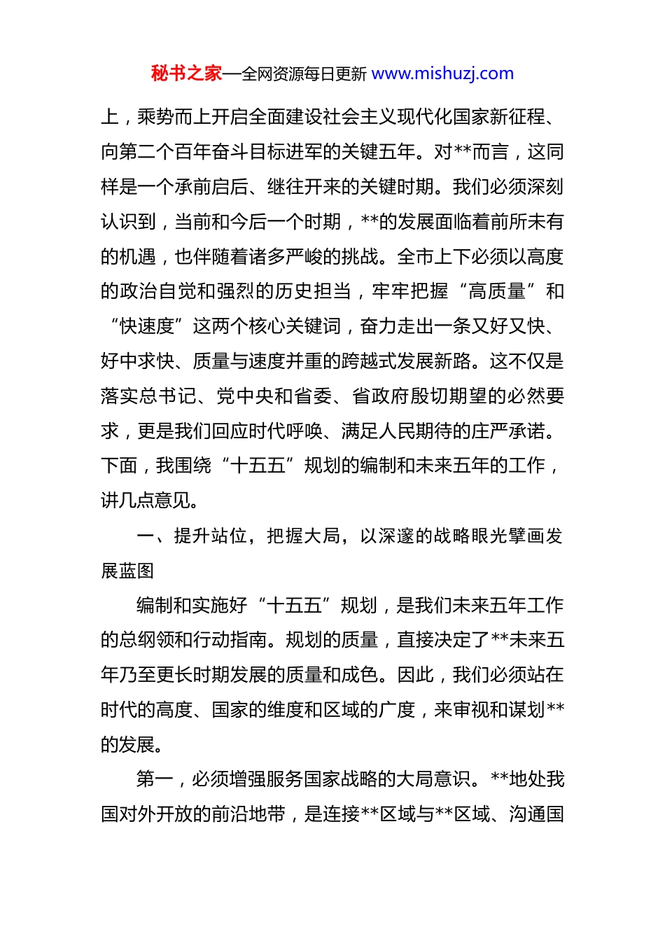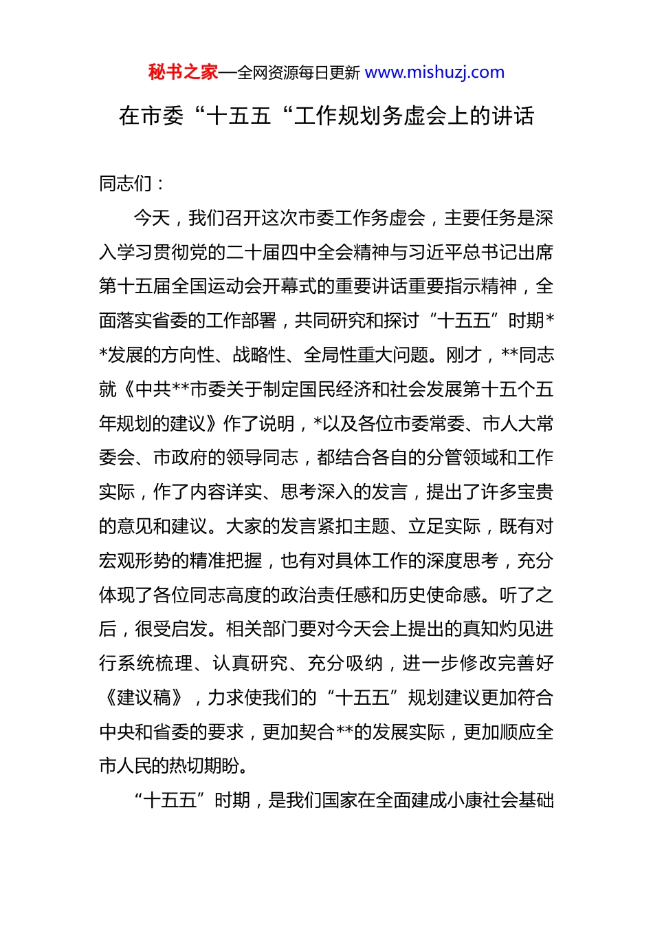 秘书之家—全网资源每日更新 www.mishuzj.com在市委“十五五“工作规划务虚会上的讲话 同志们:今天,我们召开这次市委工作务虚会,主要任务是深入学习贯彻党的二十届四中全会精神与习近平总书记出席第十五届全国运动会开幕式的重要讲话重要指示精神,全面落实省委的工作部署,共同研究和探讨“十五五”时期**发展的方向性、战略性、全局性重大问题。刚才,**同志就《中共**市委关于制定国民经济和社会发展第十五个五年规划的建议》作了说明,*以及各位市委常委、市人大常委会、市政府的领导同志,都结合各自的分管领域和工作实际,作了内容详实、思考深入的发言,提出了许多宝贵的意见和建议。大家的发言紧扣主题、立足实际,既有对宏观形势的精准把握,也有对具体工作的深度思考,充分体现了各位同志高度的政治责任感和历史使命感。听了之后,很受启发。相关部门要对今天会上提出的真知灼见进行系统梳理、认真研究、充分吸纳,进一步修改完善好《建议稿》,力求使我们的“十五五”规划建议更加符合中央和省委的要求,更加契合**的发展实际,更加顺应全市人民的热切期盼。“十五五”时期,是我们国家在全面建成小康社会基础秘书之家—全网资源每日更新 www.mishuzj.com上,乘势而上开启全面建设社会主义现代化国家新征程、向第二个百年奋斗目标进军的关键五年。对**而言,这同样是一个承前启后、继往开来的关键时期。我们必须深刻认识到,当前和今后一个时期,**的发展面临着前所未有的机遇,也伴随着诸多严峻的挑战。全市上下必须以高度的政治自觉和强烈的历史担当,牢牢把握“高质量”和“快速度”这两个核心关键词,奋力走出一条又好又快、好中求快、质量与速度并重的跨越式发展新路。这不仅是落实总书记、党中央和省委、省政府殷切期望的必然要求,更是我们回应时代呼唤、满足人民期待的庄严承诺。下面,我围绕“十五五”规划的编制和未来五年的工作,讲几点意见。一、提升站位,把握大局,以深邃的战略眼光擘画发展蓝图编制和实施好“十五五”规划,是我们未来五年工作的总纲领和行动指南。规划的质量,直接决定了**未来五年乃至更长时期发展的质量和成色。因此,我们必须站在时代的高度、国家的维度和区域的广度,来审视和谋划**的发展。第一,必须增强服务国家战略的大局意识。**地处我国对外开放的前沿地带,是连接**区域与**区域、沟通国秘书之家—全网资源每日更新 www.mishuzj.com内大市场与国际大市场的重要节点。这一独特的区位优势,决定了我们不能仅仅着眼于**自身的一亩三分地,而必须将自身发展主动融入到国家重大战略布局之中。在谋划“十五五”发展时,要紧密对接粤港澳大湾区建设、**自由贸易港建设、西部陆海新通道、**湾城市群等国家级战略。我们要深入研究这些战略将为**带来哪些政策红利、产业机遇和要素流动,思考如何通过主动承接、精准对接,将国家战略势能转化为**自身的发展动能。例如,在服务融入大湾区建设方面,我们不仅要思考如何承接其产业转移,更要探索在科技创新、金融服务、人才交流等更高层次上实现协同发展;在对接**自贸港方面,要研究如何利用其高水平开放政策,发展离岸贸易、保税物流等新业态,共同打造对外开放的新高地。第二,必须强化系统观念和前瞻思维。“十五五”规划是一项复杂的系统工程,涉及经济、政治、文化、社会、生态文明建设的方方面面,绝不能头痛医头、脚痛医头。在编制过程中,要加强顶层设计和统筹协调。市级层面的规划要加强对各县(市、区)规划编制的指导和统筹,确保全市规划“一盘棋”,形成上下联动、协同推进的良好格局。同时,要积极向上对接,主动与国家和省级的规划编制部门沟通汇报,力争将更多事关**长远发展、秘书之家—全网资源每日更新 www.mishuzj.com具有全局性、带动性的重大项目、重大平台、重大政策纳入上级规划的“大盘子”,为未来发展争取更多的战略资源和政策支持。这需要我们拿出具有前瞻性、科学性和可操作性的高质量项目储备,用扎实的前期工作和充分的论证来说服上级部门,赢得支持。第三,必须坚持以人民为中心的发展思想。规划编制的过程,本质上是汇聚民智、凝聚共识的过程...