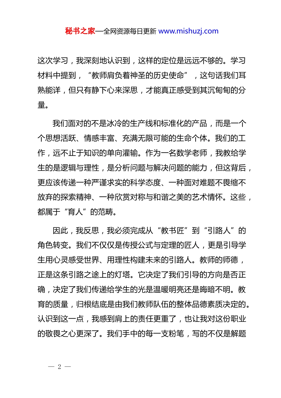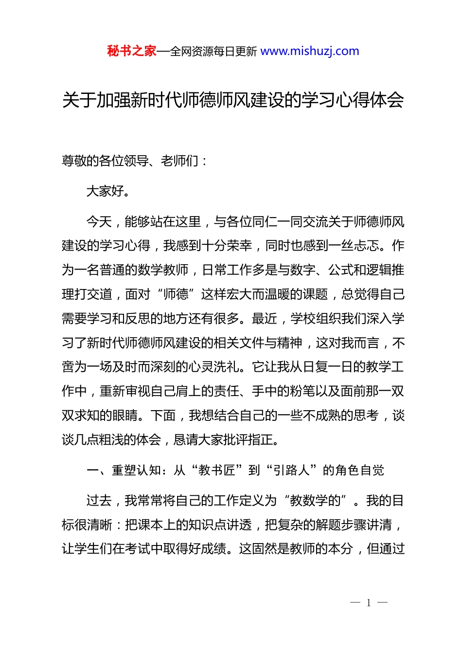 秘书之家—全网资源每日更新 www.mishuzj.com关于加强新时代师德师风建设的学习心得体会尊敬的各位领导、老师们:大家好。今天,能够站在这里,与各位同仁一同交流关于师德师风建设的学习心得,我感到十分荣幸,同时也感到一丝忐忑。作为一名普通的数学教师,日常工作多是与数字、公式和逻辑推理打交道,面对“师德”这样宏大而温暖的课题,总觉得自己需要学习和反思的地方还有很多。最近,学校组织我们深入学习了新时代师德师风建设的相关文件与精神,这对我而言,不啻为一场及时而深刻的心灵洗礼。它让我从日复一日的教学工作中,重新审视自己肩上的责任、手中的粉笔以及面前那一双双求知的眼睛。下面,我想结合自己的一些不成熟的思考,谈谈几点粗浅的体会,恳请大家批评指正。一、重塑认知:从“教书匠”到“引路人”的角色自觉过去,我常常将自己的工作定义为“教数学的”。我的目标很清晰:把课本上的知识点讲透,把复杂的解题步骤讲清,让学生们在考试中取得好成绩。这固然是教师的本分,但通过— 1 —秘书之家—全网资源每日更新 www.mishuzj.com这次学习,我深刻地认识到,这样的定位是远远不够的。学习材料中提到,“教师肩负着神圣的历史使命”,这句话我们耳熟能详,但只有静下心来深思,才能真正感受到其沉甸甸的分量。我们面对的不是冰冷的生产线和标准化的产品,而是一个个思想活跃、情感丰富、充满无限可能的生命个体。我们的工作,远不止于知识的单向灌输。作为一名数学老师,我教给学生的是逻辑与理性,是分析问题与解决问题的能力,但这背后,更应该传递一种严谨求实的科学态度、一种面对难题不畏缩不放弃的探索精神、一种欣赏对称与和谐之美的艺术情怀。这些,都属于“育人”的范畴。因此,我反思,我必须完成从“教书匠”到“引路人”的角色转变。我们不仅仅是传授公式与定理的匠人,更是引导学生用心灵感受世界、用理性构建未来的引路人。教师的师德,正是这条引路之途上的灯塔。它决定了我们引导的方向是否正确,决定了我们传递给学生的光是温暖明亮还是晦暗不明。教育的质量,归根结底是由我们教师队伍的整体品德素质决定的。认识到这一点,我感到肩上的责任更重了,也让我对这份职业的敬畏之心更深了。我们手中的每一支粉笔,写的不仅是解题— 2 —秘书之家—全网资源每日更新 www.mishuzj.com过程,更在无形中描绘着学生未来的品格轮廓。二、回归核心:以“爱”为原点,构建温暖的教育场域在这次学习中,有一个字被反复提及,那就是“爱”。学习材料中明确指出,“师德的核心问题是‘爱’,这种‘爱’必须是排除了私心和杂念的父母般温暖慈祥的爱,恩师般高尚纯洁的爱。”对此,我感触尤深。在数学的世界里,我们追求逻辑的严谨与答案的唯一。但在三尺讲台前,面对一个个鲜活、独特、思想各异的学生,我深刻地认识到,教育的方程式里,“爱”才是那个最关键、最不可或缺的常数。它不是一个可以量化的指标,却是一种可以被清晰感知的力量。这种爱,体现在日常工作的点点滴滴。当一个学生因为一道辅助线百思不得其解而眉头紧锁时,我的爱,是走下讲台,俯下身子,用温和的语气和引导式的提问,陪他一起“柳暗花明”;当一个孩子因为家庭变故或青春期的烦恼而情绪低落、成绩下滑时,我的爱,是课后找他谈谈心,给予他一份同情、关怀与支持,让他感受到除了家人之外,老师这里也是一个可以依靠的港湾;当课堂上有学生提出看似“离经叛道”的解题思路时,我的爱,是尊重他的奇思妙想,— 3 —秘书之家—全网资源每日更新 www.mishuzj.com保护他的创新火花,而不是简单粗暴地用“标准答案”来否定。我反思自己以往的工作,是否有时会因为追求教学进度而忽略了那些“慢一点”的学生?是否有时会因为急于求成而在言语中流露出不耐烦?是否真正做到了尊重每一个学生的人格,无论他的成绩优劣、性格内外。学习让我警醒,真正的教育,始于理解,成于关爱。我们必须把每一个学生都看作是独立的、值得尊重的主体,用严格的要求与慈祥的关爱相结合,帮助他们树立正确的世界观、人生观和价值观,将教书与育人这两项使命有机地统一起来,而不是割裂开来。一个充...