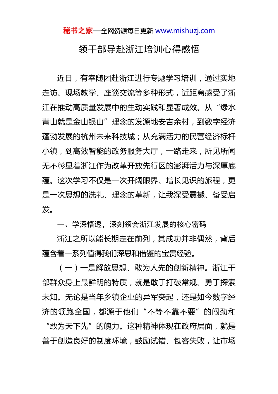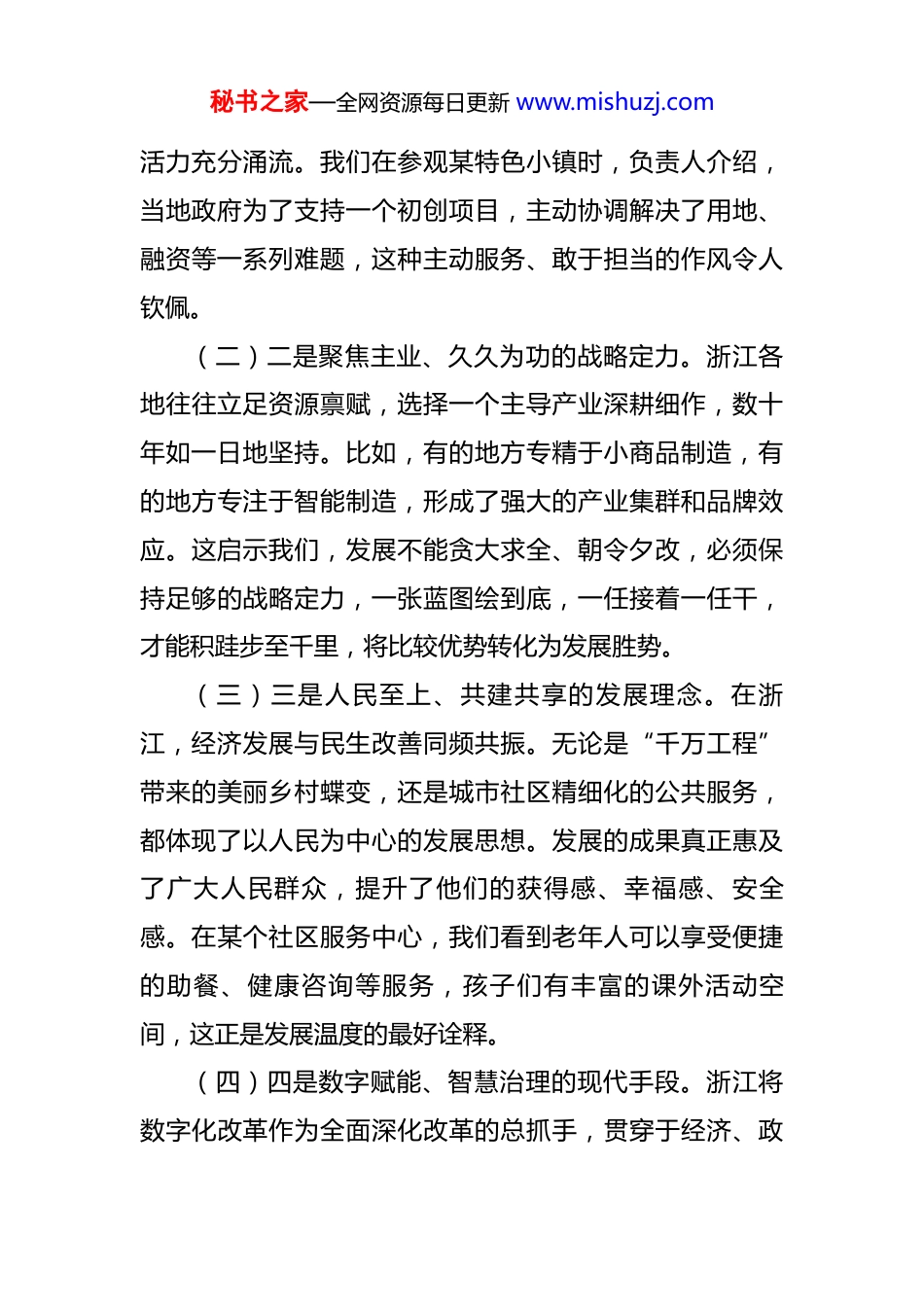 秘书之家—全网资源每日更新 www.mishuzj.com领干部导赴浙江培训心得感悟 近日,有幸随团赴浙江进行专题学习培训,通过实地走访、现场教学、座谈交流等多种形式,近距离感受了浙江在推动高质量发展中的生动实践和显著成效。从“绿水青山就是金山银山”理念的发源地安吉余村,到数字经济蓬勃发展的杭州未来科技城;从充满活力的民营经济标杆小镇,到高效智能的政务服务大厅,一路走来,所见所闻无不彰显着浙江作为改革开放先行区的澎湃活力与深厚底蕴。这次学习不仅是一次开阔眼界、增长见识的旅程,更是一次思想的洗礼、理念的革新,让我深受震撼、备受启发。一、学深悟透,深刻领会浙江发展的核心密码浙江之所以能长期走在前列,其成功并非偶然,背后蕴含着一系列值得我们深思和借鉴的宝贵经验。(一)一是解放思想、敢为人先的创新精神。浙江干部群众身上最鲜明的特质,就是敢于打破常规、勇于探索未知。无论是当年乡镇企业的异军突起,还是如今数字经济的领跑全国,都源于他们“不等不靠不要”的闯劲和“敢为天下先”的魄力。这种精神体现在政府层面,就是善于创造良好的制度环境,鼓励试错、包容失败,让市场秘书之家—全网资源每日更新 www.mishuzj.com活力充分涌流。我们在参观某特色小镇时,负责人介绍,当地政府为了支持一个初创项目,主动协调解决了用地、融资等一系列难题,这种主动服务、敢于担当的作风令人钦佩。(二)二是聚焦主业、久久为功的战略定力。浙江各地往往立足资源禀赋,选择一个主导产业深耕细作,数十年如一日地坚持。比如,有的地方专精于小商品制造,有的地方专注于智能制造,形成了强大的产业集群和品牌效应。这启示我们,发展不能贪大求全、朝令夕改,必须保持足够的战略定力,一张蓝图绘到底,一任接着一任干,才能积跬步至千里,将比较优势转化为发展胜势。(三)三是人民至上、共建共享的发展理念。在浙江,经济发展与民生改善同频共振。无论是“千万工程”带来的美丽乡村蝶变,还是城市社区精细化的公共服务,都体现了以人民为中心的发展思想。发展的成果真正惠及了广大人民群众,提升了他们的获得感、幸福感、安全感。在某个社区服务中心,我们看到老年人可以享受便捷的助餐、健康咨询等服务,孩子们有丰富的课外活动空间,这正是发展温度的最好诠释。(四)四是数字赋能、智慧治理的现代手段。浙江将数字化改革作为全面深化改革的总抓手,贯穿于经济、政秘书之家—全网资源每日更新 www.mishuzj.com治、文化、社会、生态等各领域。从“最多跑一次”改革到“浙政钉”办公平台,从智慧交通到数字乡村,大数据、人工智能等技术深度融入社会治理和政务服务,极大地提升了效率和精准度。这种以数字化撬动整体性变革的理念和做法,为我们提升治理体系和治理能力现代化水平提供了范本。二、反躬自省,清醒认识自身存在的差距与不足对照浙江的先进经验,我们更要清醒地认识到自身的短板和不足,只有找准差距,才能明确方向。(一)一是思想观念上的差距,存在求稳怕变、路径依赖。部分干部的思想还停留在传统发展模式上,面对新形势新挑战,有时显得办法不多、锐气不足,缺乏浙江那种“无中生有”、化不可能为可能的胆识和魄力。在推动改革创新时,顾虑较多,怕出错、怕担责,导致一些好的想法难以落地。(二)二是产业转型升级上的差距,新质生产力培育不足。我们的产业结构相对传统,新兴产业特别是战略性新兴产业的规模和竞争力有待提升。科技创新能力不强,产业链供应链的韧性和安全水平需要促进,在向高端化、智能化、绿色化迈进的过程中步伐还不够快。(三)三是营商环境营造上的差距,服务意识有待加秘书之家—全网资源每日更新 www.mishuzj.com强。虽然一直在努力优化营商环境,但在某些环节,距离“无事不扰、有求必应”的理想状态还有差距。个别部门的服务流程仍显烦琐,主动为企业排忧解难的意识和能力还需提高,市场主体的满意度和获得感有待进一步提升。(四)四是基层治理精细化水平上的差距,科技应用不够深入。在运用现代信息技术提升基层治理效能方面,我们的探索和实践还不够深入。数据壁垒依然存在,智慧化应用场景偏少,网格...