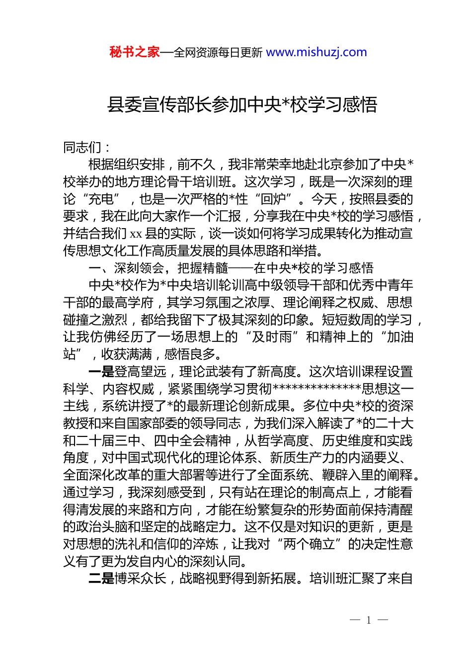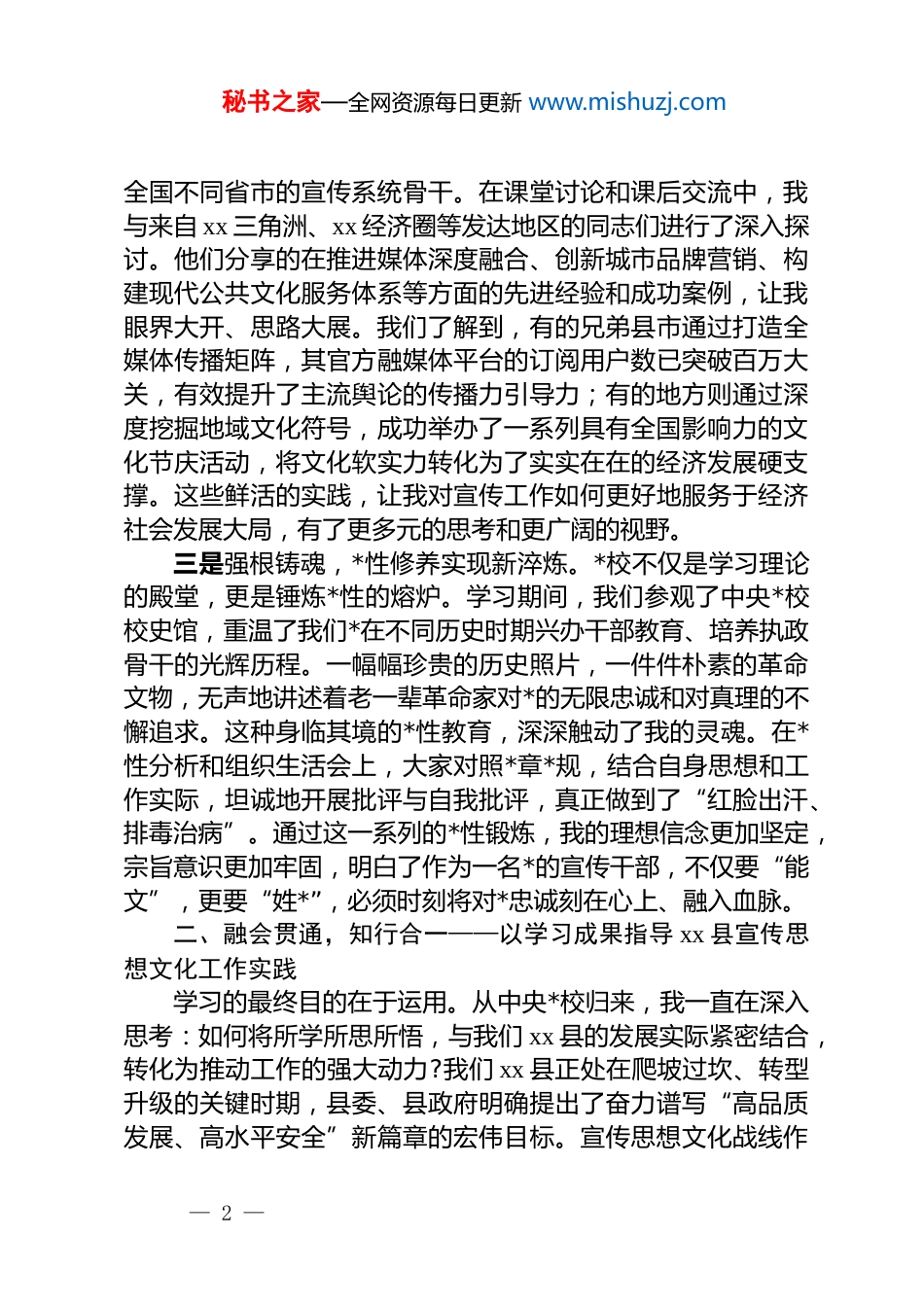 秘书之家—全网资源每日更新 www.mishuzj.com县委宣传部长参加中央*校学习感悟同志们:根据组织安排,前不久,我非常荣幸地赴北京参加了中央*校举办的地方理论骨干培训班。这次学习,既是一次深刻的理论“充电”,也是一次严格的*性“回炉”。今天,按照县委的要求,我在此向大家作一个汇报,分享我在中央*校的学习感悟,并结合我们 xx 县的实际,谈一谈如何将学习成果转化为推动宣传思想文化工作高质量发展的具体思路和举措。一、深刻领会,把握精髓——在中央*校的学习感悟中央*校作为*中央培训轮训高中级领导干部和优秀中青年干部的最高学府,其学习氛围之浓厚、理论阐释之权威、思想碰撞之激烈,都给我留下了极其深刻的印象。短短数周的学习,让我仿佛经历了一场思想上的“及时雨”和精神上的“加油站”,收获满满,感悟良多。一是登高望远,理论武装有了新高度。这次培训课程设置科学、内容权威,紧紧围绕学习贯彻**************思想这一主线,系统讲授了*的最新理论创新成果。多位中央*校的资深教授和来自国家部委的领导同志,为我们深入解读了*的二十大和二十届三中、四中全会精神,从哲学高度、历史维度和实践角度,对中国式现代化的理论体系、新质生产力的内涵要义、全面深化改革的重大部署等进行了全面系统、鞭辟入里的阐释。通过学习,我深刻感受到,只有站在理论的制高点上,才能看得清发展的来路和方向,才能在纷繁复杂的形势面前保持清醒的政治头脑和坚定的战略定力。这不仅是对知识的更新,更是对思想的洗礼和信仰的淬炼,让我对“两个确立”的决定性意义有了更为发自内心的深刻认同。二是博采众长,战略视野得到新拓展。培训班汇聚了来自— 1 —秘书之家—全网资源每日更新 www.mishuzj.com全国不同省市的宣传系统骨干。在课堂讨论和课后交流中,我与来自 xx 三角洲、xx 经济圈等发达地区的同志们进行了深入探讨。他们分享的在推进媒体深度融合、创新城市品牌营销、构建现代公共文化服务体系等方面的先进经验和成功案例,让我眼界大开、思路大展。我们了解到,有的兄弟县市通过打造全媒体传播矩阵,其官方融媒体平台的订阅用户数已突破百万大关,有效提升了主流舆论的传播力引导力;有的地方则通过深度挖掘地域文化符号,成功举办了一系列具有全国影响力的文化节庆活动,将文化软实力转化为了实实在在的经济发展硬支撑。这些鲜活的实践,让我对宣传工作如何更好地服务于经济社会发展大局,有了更多元的思考和更广阔的视野。三是强根铸魂,*性修养实现新淬炼。*校不仅是学习理论的殿堂,更是锤炼*性的熔炉。学习期间,我们参观了中央*校校史馆,重温了我们*在不同历史时期兴办干部教育、培养执政骨干的光辉历程。一幅幅珍贵的历史照片,一件件朴素的革命文物,无声地讲述着老一辈革命家对*的无限忠诚和对真理的不懈追求。这种身临其境的*性教育,深深触动了我的灵魂。在*性分析和组织生活会上,大家对照*章*规,结合自身思想和工作实际,坦诚地开展批评与自我批评,真正做到了“红脸出汗、排毒治病”。通过这一系列的*性锻炼,我的理想信念更加坚定,宗旨意识更加牢固,明白了作为一名*的宣传干部,不仅要“能文”,更要“姓*”,必须时刻将对*忠诚刻在心上、融入血脉。二、融会贯通,知行合一——以学习成果指导 xx 县宣传思想文化工作实践学习的最终目的在于运用。从中央*校归来,我一直在深入思考:如何将所学所思所悟,与我们 xx 县的发展实际紧密结合,转化为推动工作的强大动力?我们 xx 县正处在爬坡过坎、转型升级的关键时期,县委、县政府明确提出了奋力谱写“高品质发展、高水平安全”新篇章的宏伟目标。宣传思想文化战线作— 2 —秘书之家—全网资源每日更新 www.mishuzj.com为*的一条重要战线,使命光荣,责任重大。我认为,我们必须主动作为,积极应变,在服务全县发展大局中强化“六种意识”,当好“六种角色”。一是强化“领学”意识,当好理论武装的“领头羊”。宣传部门的首要职责是理论武装。我们要把学习宣传贯彻**************思想作为重中之重,巩固拓展 zt 教育成果,推动*的创新理论更加深入人心。首先,要建强县委理论...