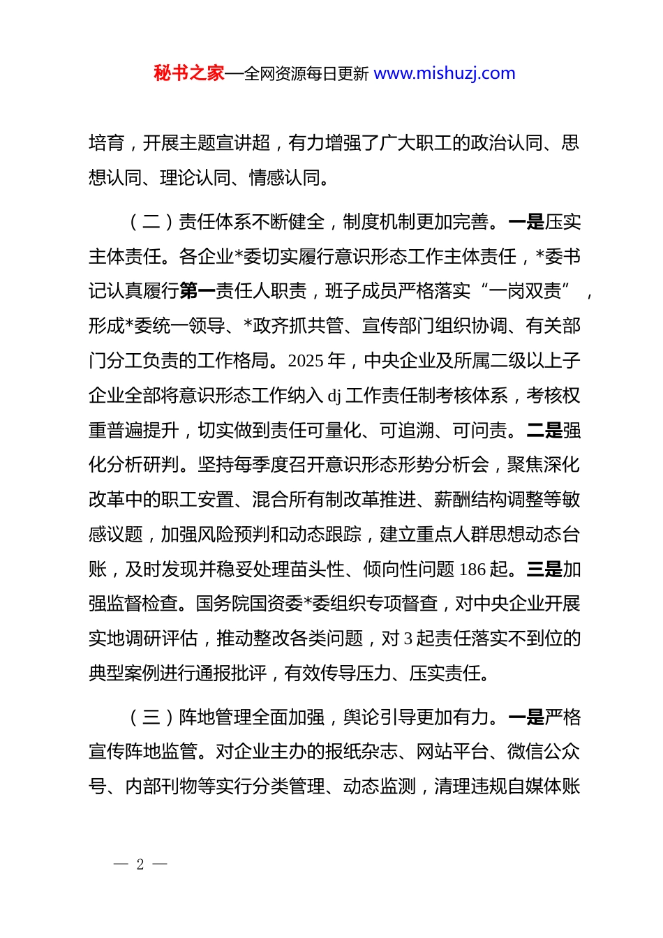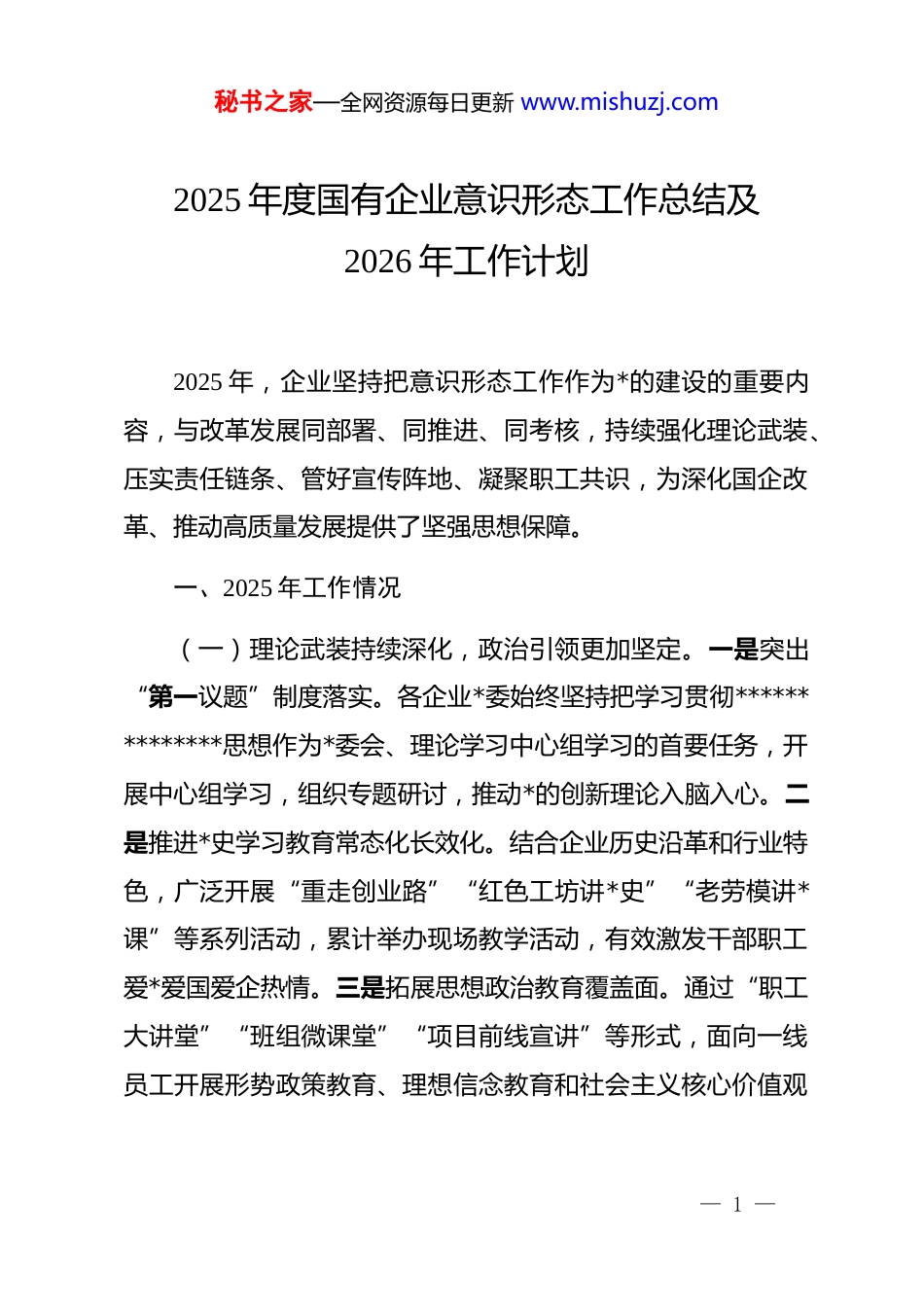秘书之家—全网资源每日更新 www.mishuzj.com2025 年度国有企业意识形态工作总结及2026 年工作计划2025 年,企业坚持把意识形态工作作为*的建设的重要内容,与改革发展同部署、同推进、同考核,持续强化理论武装、压实责任链条、管好宣传阵地、凝聚职工共识,为深化国企改革、推动高质量发展提供了坚强思想保障。一、2025 年工作情况(一)理论武装持续深化,政治引领更加坚定。一是突出“第一议题”制度落实。各企业*委始终坚持把学习贯彻**************思想作为*委会、理论学习中心组学习的首要任务,开展中心组学习,组织专题研讨,推动*的创新理论入脑入心。二是推进*史学习教育常态化长效化。结合企业历史沿革和行业特色,广泛开展“重走创业路”“红色工坊讲*史”“老劳模讲*课”等系列活动,累计举办现场教学活动,有效激发干部职工爱*爱国爱企热情。三是拓展思想政治教育覆盖面。通过“职工大讲堂”“班组微课堂”“项目前线宣讲”等形式,面向一线员工开展形势政策教育、理想信念教育和社会主义核心价值观— 1 —秘书之家—全网资源每日更新 www.mishuzj.com培育,开展主题宣讲超,有力增强了广大职工的政治认同、思想认同、理论认同、情感认同。(二)责任体系不断健全,制度机制更加完善。一是压实主体责任。各企业*委切实履行意识形态工作主体责任,*委书记认真履行第一责任人职责,班子成员严格落实“一岗双责”,形成*委统一领导、*政齐抓共管、宣传部门组织协调、有关部门分工负责的工作格局。2025 年,中央企业及所属二级以上子企业全部将意识形态工作纳入 dj 工作责任制考核体系,考核权重普遍提升,切实做到责任可量化、可追溯、可问责。二是强化分析研判。坚持每季度召开意识形态形势分析会,聚焦深化改革中的职工安置、混合所有制改革推进、薪酬结构调整等敏感议题,加强风险预判和动态跟踪,建立重点人群思想动态台账,及时发现并稳妥处理苗头性、倾向性问题 186 起。三是加强监督检查。国务院国资委*委组织专项督查,对中央企业开展实地调研评估,推动整改各类问题,对 3 起责任落实不到位的典型案例进行通报批评,有效传导压力、压实责任。(三)阵地管理全面加强,舆论引导更加有力。一是严格宣传阵地监管。对企业主办的报纸杂志、网站平台、微信公众号、内部刊物等实行分类管理、动态监测,清理违规自媒体账— 2 —秘书之家—全网资源每日更新 www.mishuzj.com号,关停长期不更新、内容空洞的平台,坚决防止“僵尸号”“空壳平台”成为风险隐患点。二是提升主流舆论传播力和影响力。精心策划“新时代·新国企”主题宣传,联合《人民日报》、新华社、央视等中央主流媒体推出专题报道。中国中车推出《大国重器背后的人》系列微视频,国家电网制作《电力天路巡线日志》纪实短片,中国建筑发布《我在海外建地标》vlog,一批“破圈”作品赢得社会广泛好评。三是增强舆情应对能力。建立健全重大舆情响应机制,制定应急预案,组建专业网评员队伍,2025 年累计妥善应对涉企舆情事件 43 起,均实现快速响应、科学引导、平稳化解,未发生重大负面舆情发酵扩散情况。(四)文化建设扎实推进,精神风貌更加昂扬。一是传承弘扬国企红色基因。深入挖掘三线建设精神、航天报国精神、铁人精神、青藏铁路建设精神等宝贵资源,命名首批“中央企业爱国主义教育基地”,组织职工参观学习超百万人次,让红色血脉代代相传。二是深化新时代文明实践。广泛开展岗位学雷锋、志愿服务、道德讲堂等活动,涌现出以“时代楷模”张黎明为代表的先进典型 17 名,形成崇德向善、见贤思齐的良好风尚。三是关爱职工心理健康。建立覆盖广泛的职工心理服务— 3 —秘书之家—全网资源每日更新 www.mishuzj.com体系,设立心理疏导室,举办心理健康讲座,帮助职工缓解压力、调适情绪,提升归属感与幸福感,为企业稳定发展营造良好内部氛围。二、2026 年工作总体思路与重点任务(一)在深化理论武装上再发力,筑牢思想根基。一是持续推动*的创新理论走深走实。把学习贯彻**************思想作为长期政治任务,结合*中央决策部署的 zt 教育,组织开展“深学细悟新思想...
