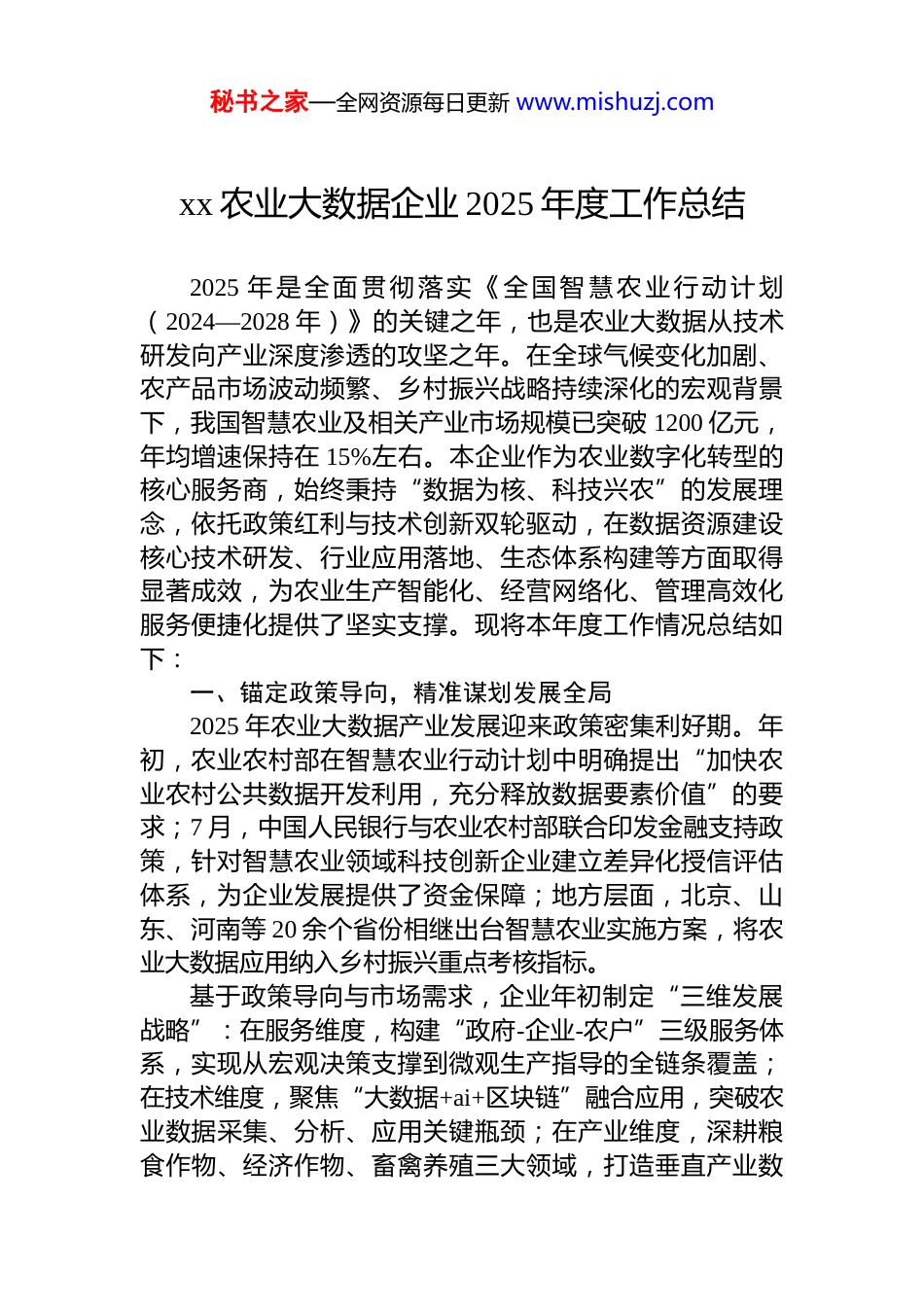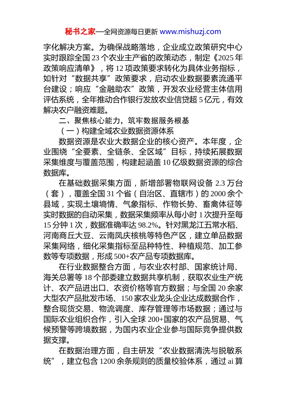 秘书之家—全网资源每日更新 www.mishuzj.comxx 农业大数据企业 2025 年度工作总结2025 年是全面贯彻落实《全国智慧农业行动计划(2024—2028 年)》的关键之年,也是农业大数据从技术研发向产业深度渗透的攻坚之年。在全球气候变化加剧、农产品市场波动频繁、乡村振兴战略持续深化的宏观背景下,我国智慧农业及相关产业市场规模已突破 1200 亿元,年均增速保持在 15%左右。本企业作为农业数字化转型的核心服务商,始终秉持“数据为核、科技兴农”的发展理念,依托政策红利与技术创新双轮驱动,在数据资源建设核心技术研发、行业应用落地、生态体系构建等方面取得显著成效,为农业生产智能化、经营网络化、管理高效化服务便捷化提供了坚实支撑。现将本年度工作情况总结如下:一、锚定政策导向,精准谋划发展全局2025 年农业大数据产业发展迎来政策密集利好期。年初,农业农村部在智慧农业行动计划中明确提出“加快农业农村公共数据开发利用,充分释放数据要素价值”的要求;7 月,中国人民银行与农业农村部联合印发金融支持政策,针对智慧农业领域科技创新企业建立差异化授信评估体系,为企业发展提供了资金保障;地方层面,北京、山东、河南等 20 余个省份相继出台智慧农业实施方案,将农业大数据应用纳入乡村振兴重点考核指标。基于政策导向与市场需求,企业年初制定“三维发展战略”:在服务维度,构建“政府-企业-农户”三级服务体系,实现从宏观决策支撑到微观生产指导的全链条覆盖;在技术维度,聚焦“大数据+ai+区块链”融合应用,突破农业数据采集、分析、应用关键瓶颈;在产业维度,深耕粮食作物、经济作物、畜禽养殖三大领域,打造垂直产业数秘书之家—全网资源每日更新 www.mishuzj.com字化解决方案。为确保战略落地,企业成立政策研究中心实时跟踪全国 23 个农业主产省的政策动态,制定《2025 年政策响应清单》,将 12 项政策要求转化为具体业务指标,如针对“数据共享”政策要求,启动农业数据要素流通平台建设;响应“金融助农”政策,开发农业经营主体信用评估系统,全年推动合作银行发放农业信贷超 5 亿元,有效解决农户融资难题。二、聚焦核心能力,筑牢数据服务根基(一)构建全域农业数据资源体系数据资源是农业大数据企业的核心资产。本年度,企业围绕“全要素、全链条、全区域”目标,持续拓展数据采集维度与覆盖范围,构建起涵盖 10 亿级数据资源的综合数据库。在基础数据采集方面,新增部署物联网设备 2.3 万台(套),覆盖全国 31 个省(自治区、直辖市)的 2000 余个县域,实现土壤墒情、气象指标、作物长势、畜禽体征等实时数据的自动采集,数据采集频率从每小时 1 次提升至每15 分钟 1 次,数据准确率达 98.2%。针对黑龙江五常水稻、河南商丘大豆、云南凤庆核桃等特色产区,建立单品数据采集网络,细化采集指标至品种特性、种植规范、加工参数等专项数据,形成 500+农产品专项数据库。在行业数据整合方面,与农业农村部、国家统计局、海关总署等 18 个部委建立数据共享机制,获取农业生产统计、农产品进出口、农资价格等官方数据;与全国 20 余家大型农产品批发市场、150 家农业龙头企业达成数据合作,整合现货交易、物流调度、库存管理等市场数据;通过与国际农业组织合作,引入全球 200+国家的农产品贸易、气候预警等跨境数据,为国内农业企业参与国际竞争提供数据支撑。在数据治理方面,自主研发“农业数据清洗与脱敏系统”,建立包含 1200 余条规则的质量校验体系,通过 ai 算秘书之家—全网资源每日更新 www.mishuzj.com法自动识别异常数据,数据清洗效率提升 60%,数据质量合格率从去年的 92%提升至 97.5%。同时,严格遵循《农业数据安全管理办法》,建立数据分级分类管理制度,对涉及农户隐私、企业商业秘密的数据实施加密存储与访问权限管控,全年未发生数据安全事件。(二)突破关键核心技术瓶颈技术创新是企业保持竞争力的核心动力。本年度,企业加大研发投入力度,研发费用同比增长 45%,占营业收入比重达 18%,组建由农业专家、数据科学家、算法工程师组成的跨学科研发团队,在 ai ...