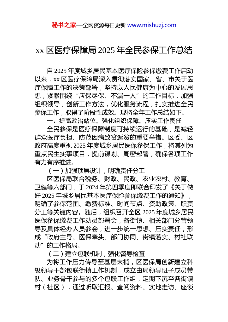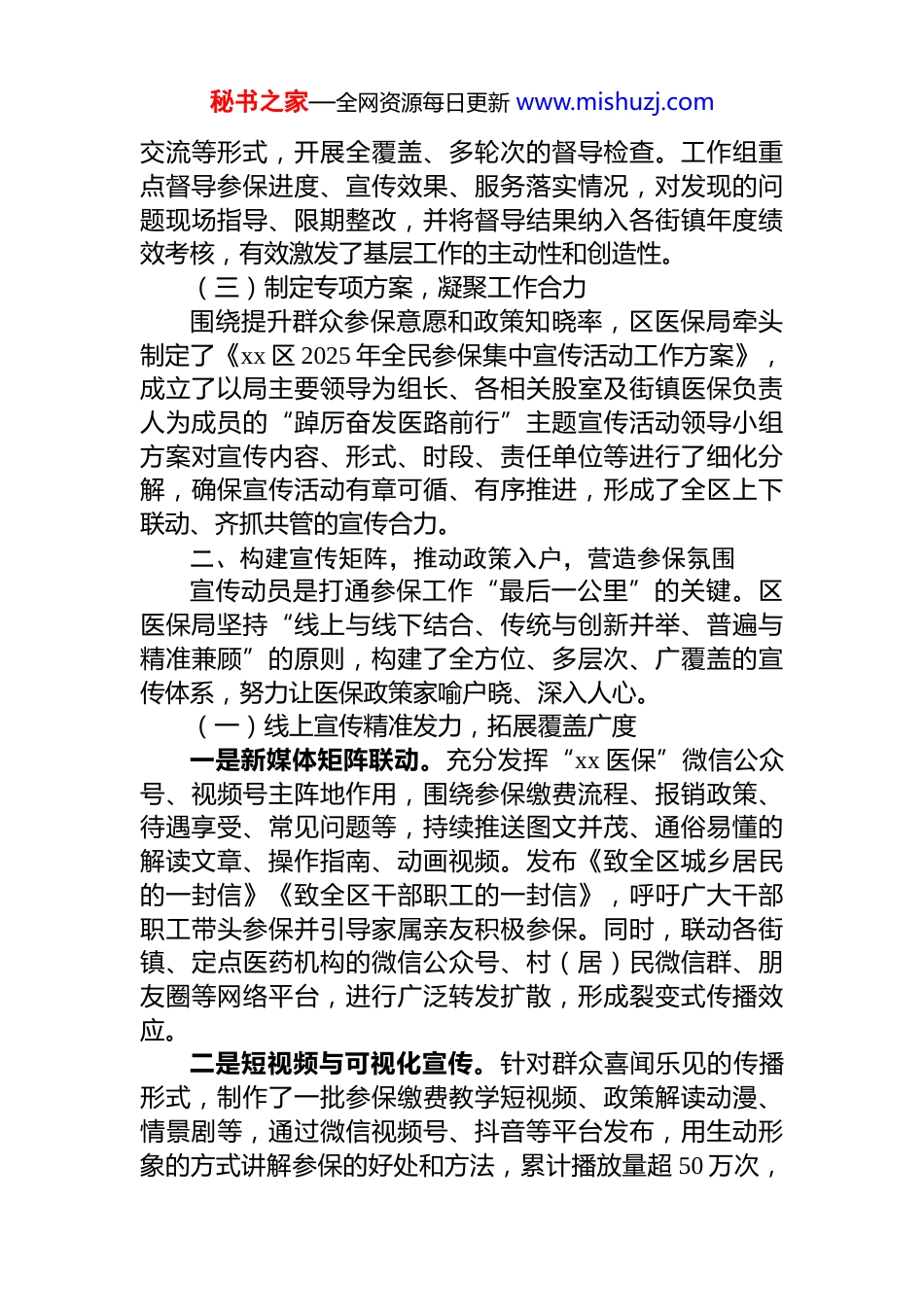 秘书之家—全网资源每日更新 www.mishuzj.comxx 区医疗保障局 2025 年全民参保工作总结自 2025 年度城乡居民基本医疗保险参保缴费工作启动以来,xx 区医疗保障局深入贯彻落实国家、省、市关于医疗保障工作的决策部署,坚持以人民健康为中心的发展思想,紧紧围绕“应保尽保、不漏一人”的工作目标,加强组织领导,创新工作方法,优化服务流程,扎实推进全民参保工作,取得了阶段性成效。现将全年工作总结如下。一、提高政治站位,强化组织保障,压实工作责任全民参保是医疗保障制度可持续运行的基础,是减轻群众医疗负担、防范因病致贫返贫的重要举措。区委、区政府高度重视 2025 年度城乡居民医保参保工作,将其列为重点民生实事项目,提前谋划、周密部署,确保各项工作有力有序推进。(一)加强顶层设计,明确责任分工区医保局联合税务、财政、民政、农业农村、教育、卫健等六部门,于 2024 年第四季度即联合印发了《关于做好 2025 年城乡居民基本医疗保险参保缴费工作的通知》,明确了参保范围、缴费标准、时间节点、资助政策、职责分工等关键内容。随后,组织召开全区 2025 年度城乡居民医保参保缴费工作动员部署会,各街镇、相关部门分管领导及具体经办人员参会,进一步统一思想、压实责任,形成“政府主导、医保牵头、部门协同、街镇落实、村社联动”的工作格局。(二)建立包联机制,强化督导检查为将工作压力传导至基层末梢,区医保局创新建立科级领导干部包联街镇工作机制,成立由局领导班子成员带队、业务骨干参与的多个包联工作组,定期下沉至各街镇村(社区),通过听取汇报、查阅资料、实地走访、座谈秘书之家—全网资源每日更新 www.mishuzj.com交流等形式,开展全覆盖、多轮次的督导检查。工作组重点督导参保进度、宣传效果、服务落实情况,对发现的问题现场指导、限期整改,并将督导结果纳入各街镇年度绩效考核,有效激发了基层工作的主动性和创造性。(三)制定专项方案,凝聚工作合力围绕提升群众参保意愿和政策知晓率,区医保局牵头制定了《xx 区 2025 年全民参保集中宣传活动工作方案》,成立了以局主要领导为组长、各相关股室及街镇医保负责人为成员的“踔厉奋发医路前行”主题宣传活动领导小组方案对宣传内容、形式、时段、责任单位等进行了细化分解,确保宣传活动有章可循、有序推进,形成了全区上下联动、齐抓共管的宣传合力。二、构建宣传矩阵,推动政策入户,营造参保氛围宣传动员是打通参保工作“最后一公里”的关键。区医保局坚持“线上与线下结合、传统与创新并举、普遍与精准兼顾”的原则,构建了全方位、多层次、广覆盖的宣传体系,努力让医保政策家喻户晓、深入人心。(一)线上宣传精准发力,拓展覆盖广度一是新媒体矩阵联动。充分发挥“xx 医保”微信公众号、视频号主阵地作用,围绕参保缴费流程、报销政策、待遇享受、常见问题等,持续推送图文并茂、通俗易懂的解读文章、操作指南、动画视频。发布《致全区城乡居民的一封信》《致全区干部职工的一封信》,呼吁广大干部职工带头参保并引导家属亲友积极参保。同时,联动各街镇、定点医药机构的微信公众号、村(居)民微信群、朋友圈等网络平台,进行广泛转发扩散,形成裂变式传播效应。二是短视频与可视化宣传。针对群众喜闻乐见的传播形式,制作了一批参保缴费教学短视频、政策解读动漫、情景剧等,通过微信视频号、抖音等平台发布,用生动形象的方式讲解参保的好处和方法,累计播放量超 50 万次,秘书之家—全网资源每日更新 www.mishuzj.com有效提升了青年群体、灵活就业人员等群体的关注度。三是热点问答与互动答疑。在公众号设置“参保问答”专栏,定期整理发布群众咨询的高频问题,并安排专人在线回复留言咨询,实现与群众的即时互动,累计回复各类咨询 3000 余条。(二)线下宣传深入基层,提升宣传温度一是面对面讲解答疑。组织全局*员干部、各街镇医保经办人员、村(社区)网格员、驻村工作队员等力量,组成“医保政策宣讲小分队”,利用农闲、傍晚等时段,深入田间地头、农户家中、社区楼院,开展“敲门行动”,面对面为群众算好“经济账”“健康账”,详细讲...