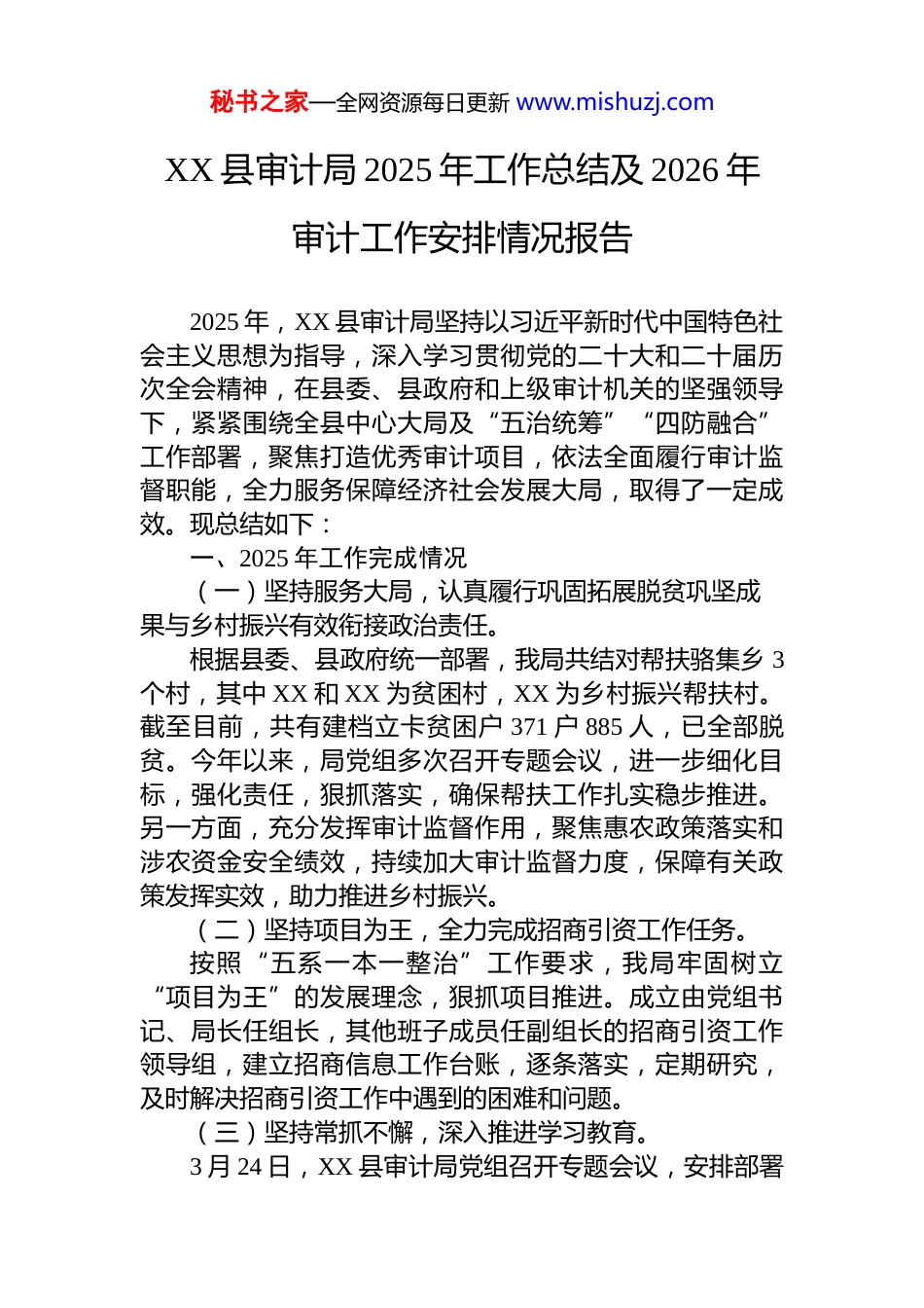 秘书之家—全网资源每日更新 www.mishuzj.comXX 县审计局 2025 年工作总结及 2026 年审计工作安排情况报告2025 年,XX 县审计局坚持以习近平新时代中国特色社会主义思想为指导,深入学习贯彻党的二十大和二十届历次全会精神,在县委、县政府和上级审计机关的坚强领导下,紧紧围绕全县中心大局及“五治统筹”“四防融合”工作部署,聚焦打造优秀审计项目,依法全面履行审计监督职能,全力服务保障经济社会发展大局,取得了一定成效。现总结如下:一、2025 年工作完成情况(一)坚持服务大局,认真履行巩固拓展脱贫巩坚成果与乡村振兴有效衔接政治责任。根据县委、县政府统一部署,我局共结对帮扶骆集乡 3个村,其中 XX 和 XX 为贫困村,XX 为乡村振兴帮扶村。截至目前,共有建档立卡贫困户 371 户 885 人,已全部脱贫。今年以来,局党组多次召开专题会议,进一步细化目标,强化责任,狠抓落实,确保帮扶工作扎实稳步推进。另一方面,充分发挥审计监督作用,聚焦惠农政策落实和涉农资金安全绩效,持续加大审计监督力度,保障有关政策发挥实效,助力推进乡村振兴。(二)坚持项目为王,全力完成招商引资工作任务。按照“五系一本一整治”工作要求,我局牢固树立“项目为王”的发展理念,狠抓项目推进。成立由党组书记、局长任组长,其他班子成员任副组长的招商引资工作领导组,建立招商信息工作台账,逐条落实,定期研究,及时解决招商引资工作中遇到的困难和问题。(三)坚持常抓不懈,深入推进学习教育。3 月 24 日,XX 县审计局党组召开专题会议,安排部署秘书之家—全网资源每日更新 www.mishuzj.com深入贯彻中央八项规定精神学习教育工作,传达学以习近平同志为核心的党中央党的建设工作领导小组会议精神和省委、市委常委(扩大)会议暨党的建设工作领导小组会议精神,并研究审议《XX 县审计局关于在全局党员中开展深入贯彻中央八项规定精神学习教育的工作方案》,成立工作专班,明确专人负责并定期对局属各党支部深入贯彻中央八项规定精神学习教育工作开展情况进行全覆盖、全过程指导。一是中共 XX 县审计局总支部委员会、第一支部委员会及第二支部委员分别召开深入贯彻中央八项规定精神学习教育工作部署会,传达学习县委相关文件及局党组专题会议精神。二是聚焦“两个清单”28 条问题(夏学教专发〔2025〕4 号)、四个方面突出问题(夏学教专发〔2025〕8 号、夏学教专发〔2025〕9 号),从讲政治的高度,深挖思想根源,深入具体查摆问题,充分发挥了审计机关廉政建设排头兵的作用。截至 8 月底,共排查出 20 个问题,已基本整改完毕。三是紧紧围绕县委、县政府中心工作,结合学习教育工作成效,突出抓好财政预决算、专项资金、政府重点投资项目和经济责任四大板块审计,积极参与上级纪检监察机关案件查处。先后抽调 16 人(次)配合市县纪检监察机关、信访部门开展对落实中央八项规定精神、三公经费、公共工程建设、房地产开发、土地出让转让等重点领域、重点环节的清查整顿,着力整治涉及民生领域的突出问题。(四)聚焦主责主业,依法全面履行审计监督职责。紧紧围绕《县政府工作报告》明确的重要指标、重点工作、重点项目、重点民生实事等工作,科学谋划 2025 年审计项目计划。(五)狠抓工作落实,扛牢意识形态工作主体责任2025 年县审计局党组根据人事变动,重新调整意识形态工作领导小组,制定意识形态工作要点,细化任务分解,梳理责任清单,建立健全意识形态工作责任制。2025秘书之家—全网资源每日更新 www.mishuzj.com年共召开 4 次意识形态工作分析研判会,2 次意识形态专题研讨会,向县委专题汇报一次意识形态工作。同时,将意识形态工作纳入领导干部民主生活会对照检查、领导干部述职及年度综合目标考核内容,做到与审计业务工作同部署、同落实、同检查、同考评。二、2025 年审计工作做法和经验(一)工作做法。一是坚持党对审计工作的全面领导,强化政治机关意识,坚决把准审计方向,始终把讲政治贯穿于审计工作的全过程、各环节。严格落实重大事项请示报告制度,积极主动上级审计机关和县委审计委员会报告重大事...