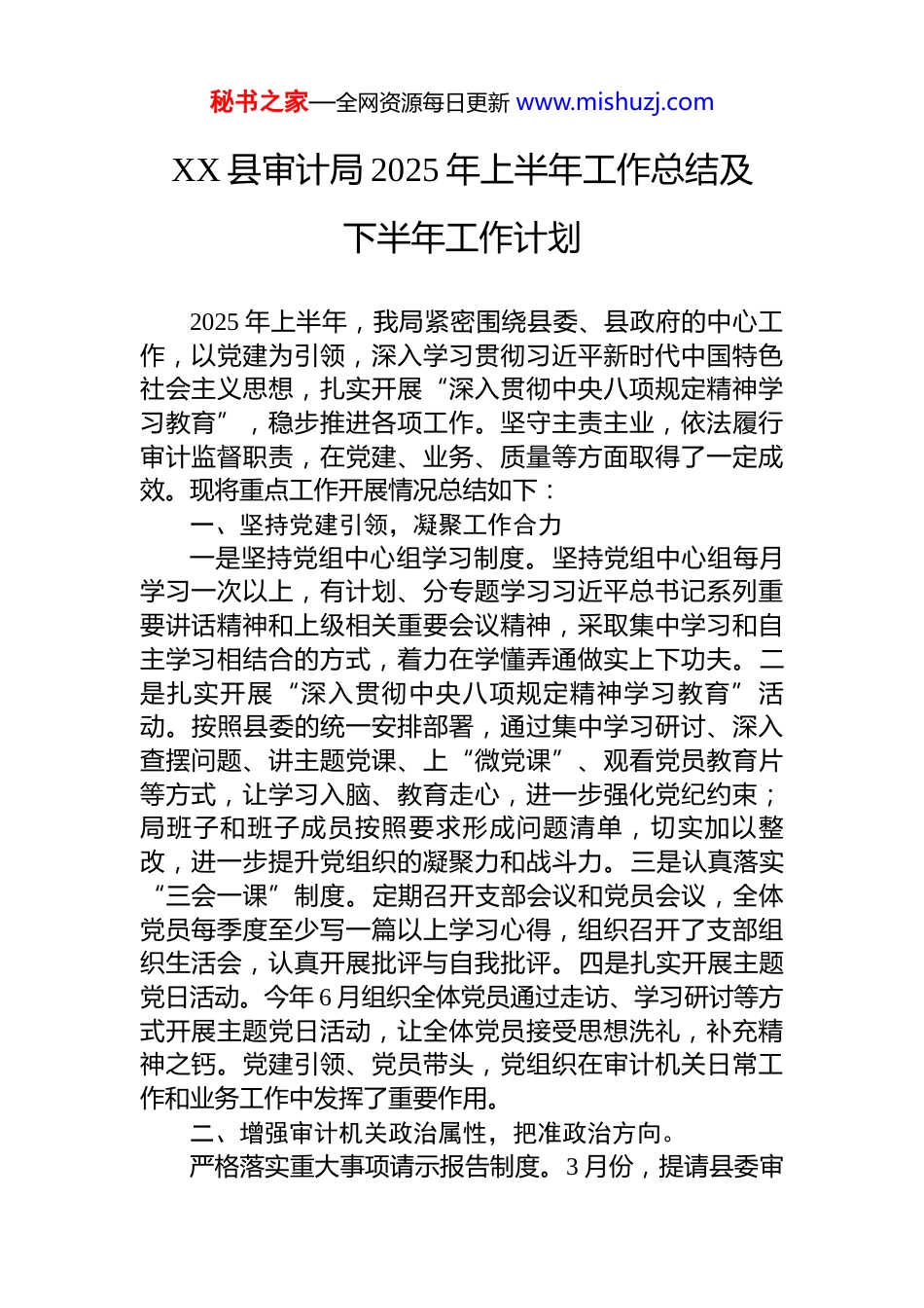 秘书之家—全网资源每日更新 www.mishuzj.comXX 县审计局 2025 年上半年工作总结及下半年工作计划2025 年上半年,我局紧密围绕县委、县政府的中心工作,以党建为引领,深入学习贯彻习近平新时代中国特色社会主义思想,扎实开展“深入贯彻中央八项规定精神学习教育”,稳步推进各项工作。坚守主责主业,依法履行审计监督职责,在党建、业务、质量等方面取得了一定成效。现将重点工作开展情况总结如下:一、坚持党建引领,凝聚工作合力一是坚持党组中心组学习制度。坚持党组中心组每月学习一次以上,有计划、分专题学习习近平总书记系列重要讲话精神和上级相关重要会议精神,采取集中学习和自主学习相结合的方式,着力在学懂弄通做实上下功夫。二是扎实开展“深入贯彻中央八项规定精神学习教育”活动。按照县委的统一安排部署,通过集中学习研讨、深入查摆问题、讲主题党课、上“微党课”、观看党员教育片等方式,让学习入脑、教育走心,进一步强化党纪约束;局班子和班子成员按照要求形成问题清单,切实加以整改,进一步提升党组织的凝聚力和战斗力。三是认真落实“三会一课”制度。定期召开支部会议和党员会议,全体党员每季度至少写一篇以上学习心得,组织召开了支部组织生活会,认真开展批评与自我批评。四是扎实开展主题党日活动。今年 6 月组织全体党员通过走访、学习研讨等方式开展主题党日活动,让全体党员接受思想洗礼,补充精神之钙。党建引领、党员带头,党组织在审计机关日常工作和业务工作中发挥了重要作用。二、增强审计机关政治属性,把准政治方向。严格落实重大事项请示报告制度。3 月份,提请县委审秘书之家—全网资源每日更新 www.mishuzj.com计委员召开了县委审计委员会第六次会议,审议通过《XX县审计局 2025 年度审计项目计划》、《中共 XX 县委审计委员会办公室关于 2024 年度县管领导干部经济责任审计和自然资源资产离任(任中)审计综合报告》。今年上半年,重大事项共向县委、县政府请示报告 3 次,获县委主要领导批示 3 次。三、依法履职尽责,加强审计监督(一)精心谋划项目。围绕县委、县政府工作中心、上级审计机关部署安排,以推动地方经济高质量发展、民生实事落地落实为目标统筹谋划项目,全年共安排审计项目 14 个,加大对财政财务、重大政策落实、民生、自然资源环境、经济责任、公共投资等领域的审计力度,以高质量审计监督全力护航全县高质量发展。(二)统筹推进工作。在项目上将经济责任审计与预算执行、财务收支、自然资源等审计相结合,统筹项目计划,共享共用审计成果。在人员上有意识培养年轻审计人员当主审,挖掘内部潜力,整合审计资源。在工作安排上分批合理安排审计项目,减少每批次之间的间隔时间,交错推进。1-6 月共安排实施了 8 个审计项目,已完成 4 个,审计查出问题 56 个、涉及金额 26445.62 万元,审计促进应上缴财政资金 5100.66 万元。(三)突出审计工作重点。围绕县委、县政府工作中心和人民群众急难愁盼的问题开展审计监督。一是强化政策落实审计。预算执行审计中,突出优化营商环境、财政奖补资金等重点事项。二是加大对国有企业的监管力度。今年上半年开展了县农工贸公司资产、负债、损益以及其他财务收支情况审计,摸清国有企业底数,为县委、县政府决策提供参考。三是加大民生审计覆盖面,开展了殡葬领域专项审计调查,同时在其他审计项目中重点关注就业资金、惠民惠农资金的管理使用情况,促进民生资金提质增效。秘书之家—全网资源每日更新 www.mishuzj.com(四)加强督促整改。建立审计监督+人大监督,审计监督与巡察监督协同机制,人大、审计、巡察共同发力,加大审计发现问题督促整改力度。紧盯问题销号清零目标,压实被审计单位的整改主体责任、主管部门的监督管理责任和审计机关的督促检查责任,通过常态化、动态化“ 清 单 对 账 销 号 ” , 有 力 有 序 推 进 审 计 查 出 问 题 整改,2024 年审计查出已到整改期限问题 93 个,已整改到位78 个,整改率 83.87%。(五)加强队伍建设。一是促进内部交流。上半年组织 3 期学习交流活动,依...
