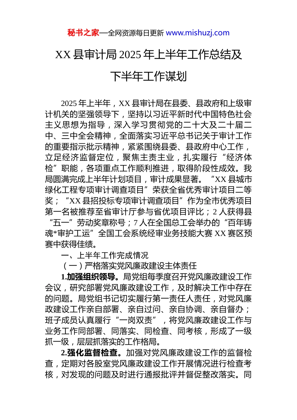 秘书之家—全网资源每日更新 www.mishuzj.comXX 县审计局 2025 年上半年工作总结及下半年工作谋划2025 年上半年,XX 县审计局在县委、县政府和上级审计机关的坚强领导下,坚持以习近平新时代中国特色社会主义思想为指导,深入学习贯彻党的二十大及二十届二中、三中全会精神,全面落实习近平总书记关于审计工作的重要指示批示精神,紧紧围绕县委、县政府中心工作,立足经济监督定位,聚焦主责主业,扎实履行“经济体检”职能,各项重点工作顺利推进,取得阶段性成效。我局圆满完成上半年计划项目,审计成果显著。“XX 县城市绿化工程专项审计调查项目”荣获全省优秀审计项目二等奖;“XX 县招投标专项审计调查项目”作为全市优秀项目第一名被推荐至省审计厅参与省优项目评比;2 人获得县“五一”劳动奖章称号;7 人在全国总工会举办的“百年铸魂*审护工运”全国工会系统经审业务技能大赛 XX 赛区预赛中获得佳绩。一、上半年工作完成情况(一)严格落实党风廉政建设主体责任1.加强组织领导。局党组每季度召开党风廉政建设工作会议,研究部署党风廉政建设工作,及时解决工作中存在的问题。局党组书记切实履行第一责任人责任,对党风廉政建设工作亲自部署、亲自过问、亲自协调、亲自督办;班子成员认真履行“一岗双责”,将党风廉政建设工作与业务工作同部署、同落实、同检查、同考核,形成了一级抓一级,层层抓落实的工作格局。2.强化监督检查。加强对党风廉政建设工作的监督检查,定期对各股室党风廉政建设工作开展情况进行检查考核,对发现的问题及时进行通报批评并督促整改落实。同秘书之家—全网资源每日更新 www.mishuzj.com时,加强对审计组监督检查,重点检查审计人员执行审计纪律和廉政规定情况,确保审计人员廉洁从审。3.扎实开展学习教育。扎实开展深入贯彻中央八项规定精神学习教育,一体推进学查改,推进作风建设常态化长效化,持续放大综合效能,促进审计工作提质增效。(二)聚焦主责主业,推动依法全面履行审计监督职责1.科学谋划审计项目。围绕全县中心工作和经济社会发展大局,结合上级审计机关工作部署,科学制定年度审计项目计划。2025 年安排 7 类 23 个审计项目,承担省定 1 个项目、市定 2 个审计项目,涵盖财政预算、经济责任、领导干部自然资源资产离任、民生保障、公共投资等多个领域,确保审计监督全覆盖。2.有序推进项目实施。按照审计项目计划,精心组织实施各类审计项目,加强审计现场管理,严格审计质量控制,确保审计工作有序推进。截至 2025 年 7 月底,已开展审计项目 19 个,已完成审计项目 12 个,正在实施审计项目7 个。3.不断强化质量控制。一是加强审计项目质量检查。制定出台了《XX 县审计局 2025 年度审计项目质量检查考评方案》,组织开展了 2024 年度审计项目质量检查,对 2024年度 24 个审计项目进行了全面检查。通过检查,发现了部分审计项目存在的问题和不足,并及时进行了通报和整改,有效提升了审计项目质量。二是创新优化审理工作。严格落实审计业务例会制度,充分发挥其在审计项目推进中的调度指导作用,为审计项目高质量开展提供有力保障。4.注重审计成果运用。加强与纪检监察、组织人事、巡察等部门的协作配合,建立健全审计结果共享、问题线索移送、整改情况反馈等工作机制,形成监督合力。5.精准指导内审工作。印发《XX 县 2025 年度内部审计秘书之家—全网资源每日更新 www.mishuzj.com工作要点》,强化审计机关对内部审计工作的指导监督,2025 年各内审单位向审计局备案审计项目 39 个,均按照备案时间实施审计,同时按照审计署《内部审计统计调查制度》(2024 年修订版)完成 XX 县 2023、2024 年度的内部审计统计调查工作。6.统筹协调,完成上级交办任务。上半年我局安排人员参加马鞍山市税收征管和部门预算审计、合肥市保障性安居工程资金投入和使用绩效情况审计、市审计局对埇桥区区长任期经济责任审计及市委巡察等共 9 人次;配合参加县纪委专项检查 4 人次。二、下半年工作谋划(一)强化党建引领作用始终牢记审计工作的政治属性和政治功能,把党对审计工作的集...