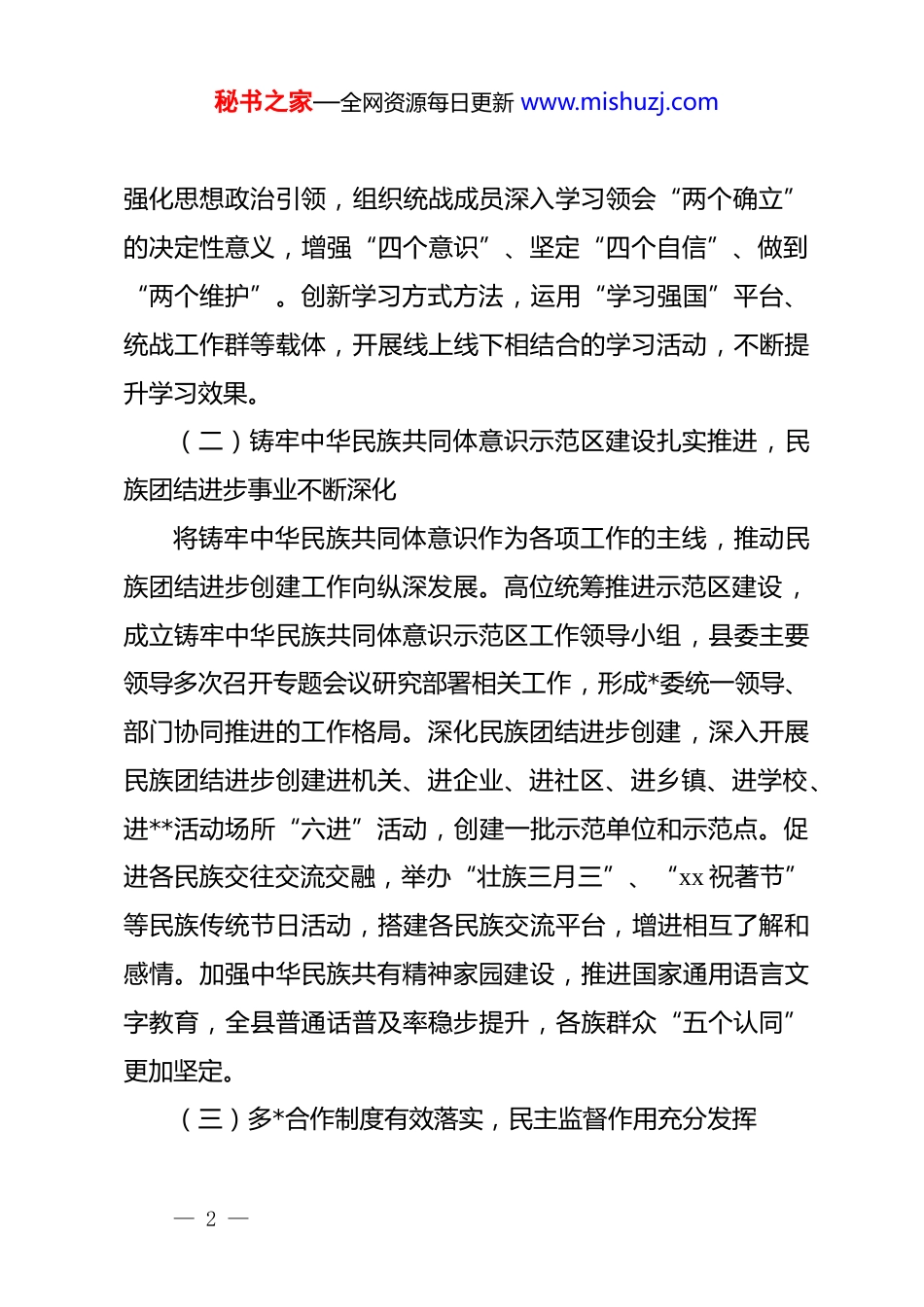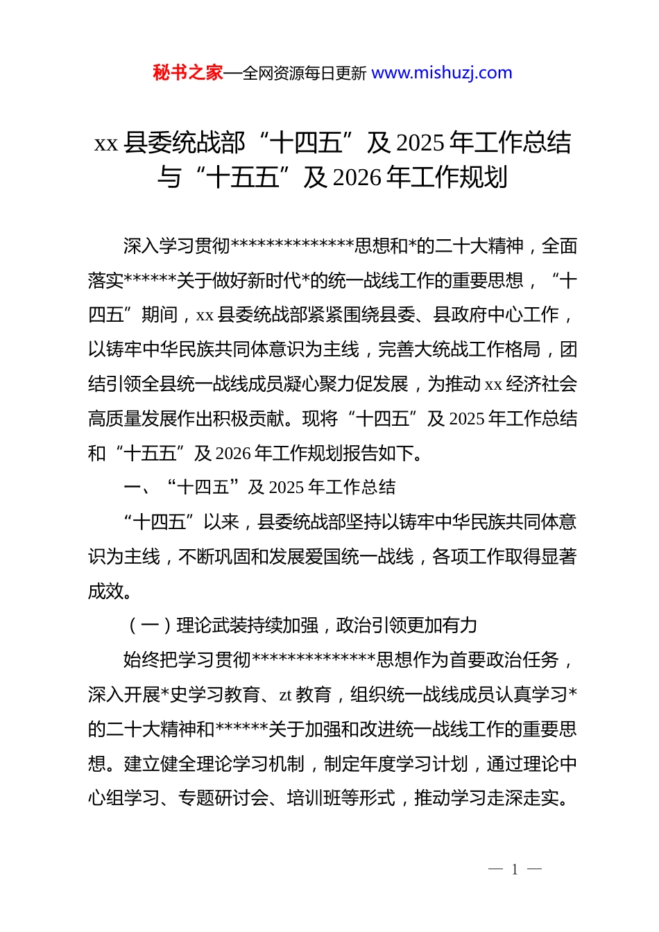 秘书之家—全网资源每日更新 www.mishuzj.comxx 县委统战部“十四五”及 2025 年工作总结与“十五五”及 2026 年工作规划深入学习贯彻**************思想和*的二十大精神,全面落实******关于做好新时代*的统一战线工作的重要思想,“十四五”期间,xx 县委统战部紧紧围绕县委、县政府中心工作,以铸牢中华民族共同体意识为主线,完善大统战工作格局,团结引领全县统一战线成员凝心聚力促发展,为推动 xx 经济社会高质量发展作出积极贡献。现将“十四五”及 2025 年工作总结和“十五五”及 2026 年工作规划报告如下。一、“十四五”及 2025 年工作总结“十四五”以来,县委统战部坚持以铸牢中华民族共同体意识为主线,不断巩固和发展爱国统一战线,各项工作取得显著成效。(一)理论武装持续加强,政治引领更加有力始终把学习贯彻**************思想作为首要政治任务,深入开展*史学习教育、zt 教育,组织统一战线成员认真学习*的二十大精神和******关于加强和改进统一战线工作的重要思想。建立健全理论学习机制,制定年度学习计划,通过理论中心组学习、专题研讨会、培训班等形式,推动学习走深走实。— 1 —秘书之家—全网资源每日更新 www.mishuzj.com强化思想政治引领,组织统战成员深入学习领会“两个确立”的决定性意义,增强“四个意识”、坚定“四个自信”、做到“两个维护”。创新学习方式方法,运用“学习强国”平台、统战工作群等载体,开展线上线下相结合的学习活动,不断提升学习效果。(二)铸牢中华民族共同体意识示范区建设扎实推进,民族团结进步事业不断深化将铸牢中华民族共同体意识作为各项工作的主线,推动民族团结进步创建工作向纵深发展。高位统筹推进示范区建设,成立铸牢中华民族共同体意识示范区工作领导小组,县委主要领导多次召开专题会议研究部署相关工作,形成*委统一领导、部门协同推进的工作格局。深化民族团结进步创建,深入开展民族团结进步创建进机关、进企业、进社区、进乡镇、进学校、进**活动场所“六进”活动,创建一批示范单位和示范点。促进各民族交往交流交融,举办“壮族三月三”、“xx 祝著节”等民族传统节日活动,搭建各民族交流平台,增进相互了解和感情。加强中华民族共有精神家园建设,推进国家通用语言文字教育,全县普通话普及率稳步提升,各族群众“五个认同”更加坚定。(三)多*合作制度有效落实,民主监督作用充分发挥— 2 —秘书之家—全网资源每日更新 www.mishuzj.com坚持和完善中国共产*领导的多*合作和政治协商制度,支持民主*派、无*派人士履行职能。完善政治协商机制,建立健全协商于决策之前和决策实施之中的机制,就经济社会发展重大问题广泛征求*外人士意见建议。支持民主监督实践,鼓励*外人士围绕脱贫攻坚成果巩固、乡村振兴、生态环境保护等开展民主监督,提出意见建议 120 余条,推动相关问题解决。搭建参政议政平台,组织*外人士深入一线调研,形成高质量调研报告 30 余篇,为县委、县政府科学决策提供参考。(四)非公经济统战工作持续深化,服务高质量发展成效明显围绕县域经济发展,积极做好非公有制经济人士统战工作,促进“两个健康”。强化思想政治引领,深入开展理想信念教育实践活动,引导非公经济人士增强“四信”,践行新发展理念。搭建服务平台,建立县级领导联系重点企业制度,协调解决企业融资难、用工难等实际问题 200 余件。促进政企沟通,定期召开政企座谈会,听取企业家意见建议,推动优化营商环境政策措施落地见效。引导回馈社会,组织非公经济人士参与“万企兴万村”行动,累计投入资金 3000 余万元支持乡村振兴。(五)新的社会阶层人士工作创新发展,新兴群体统战格局初步形成— 3 —秘书之家—全网资源每日更新 www.mishuzj.com适应经济社会发展新形势,积极探索新的社会阶层人士统战工作新路径。加强组织建设,成立新的社会阶层人士联谊会,吸纳会员 80 余名,搭建联系服务平台。开展实践创新基地建设,在县工业园区、创业孵化基地等设立实践创新基地,吸引新阶层人士参与社会治理和公益事业。发挥专业优势,组织律师、会计师、医师等专业人士...