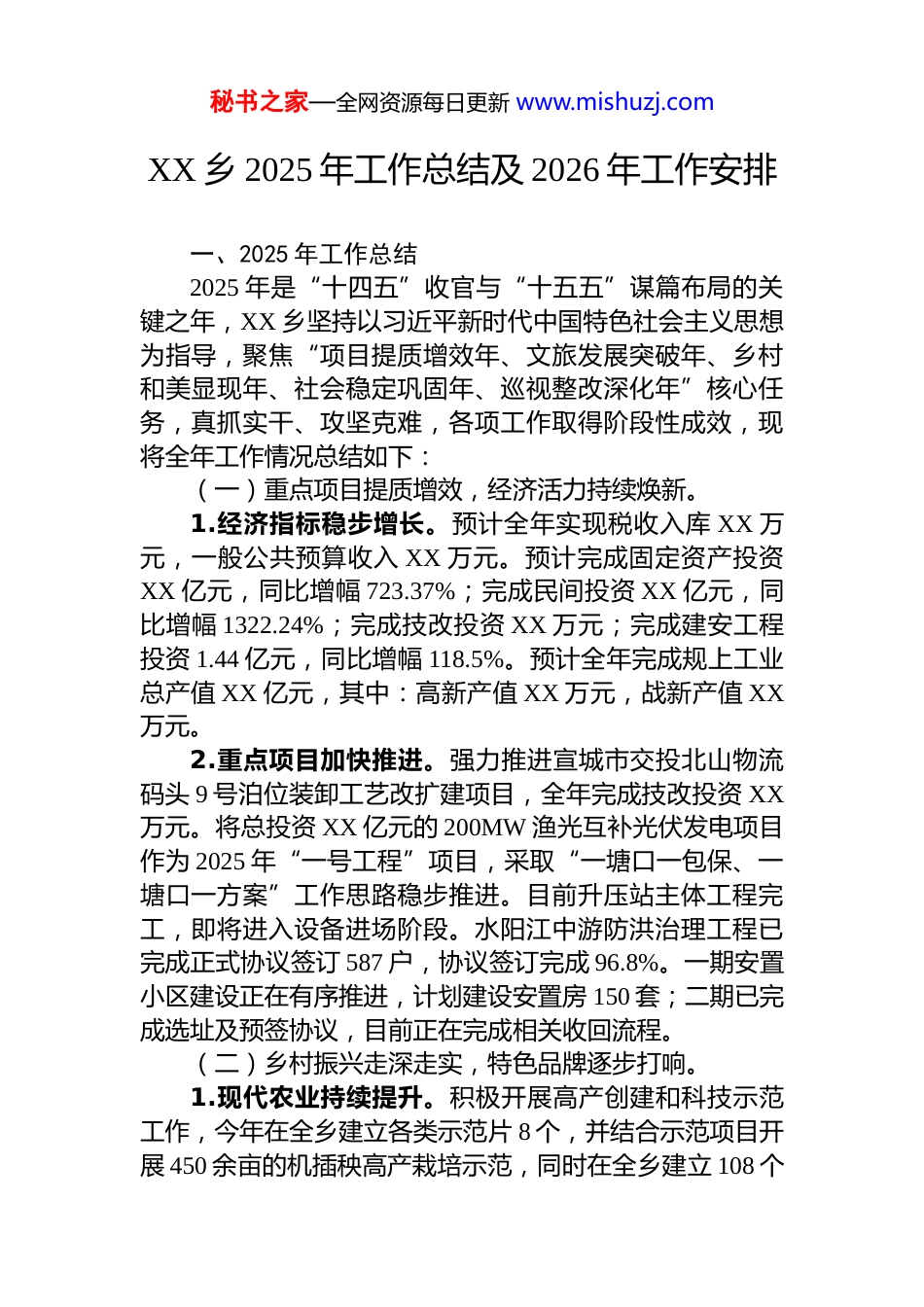 秘书之家—全网资源每日更新 www.mishuzj.comXX 乡 2025 年工作总结及 2026 年工作安排一、2025 年工作总结2025 年是“十四五”收官与“十五五”谋篇布局的关键之年,XX 乡坚持以习近平新时代中国特色社会主义思想为指导,聚焦“项目提质增效年、文旅发展突破年、乡村和美显现年、社会稳定巩固年、巡视整改深化年”核心任务,真抓实干、攻坚克难,各项工作取得阶段性成效,现将全年工作情况总结如下:(一)重点项目提质增效,经济活力持续焕新。1.经济指标稳步增长。预计全年实现税收入库 XX 万元,一般公共预算收入 XX 万元。预计完成固定资产投资XX 亿元,同比增幅 723.37%;完成民间投资 XX 亿元,同比增幅 1322.24%;完成技改投资 XX 万元;完成建安工程投资 1.44 亿元,同比增幅 118.5%。预计全年完成规上工业总产值 XX 亿元,其中:高新产值 XX 万元,战新产值 XX万元。2.重点项目加快推进。强力推进宣城市交投北山物流码头 9 号泊位装卸工艺改扩建项目,全年完成技改投资 XX万元。将总投资 XX 亿元的 200MW 渔光互补光伏发电项目作为 2025 年“一号工程”项目,采取“一塘口一包保、一塘口一方案”工作思路稳步推进。目前升压站主体工程完工,即将进入设备进场阶段。水阳江中游防洪治理工程已完成正式协议签订 587 户,协议签订完成 96.8%。一期安置小区建设正在有序推进,计划建设安置房 150 套;二期已完成选址及预签协议,目前正在完成相关收回流程。(二)乡村振兴走深走实,特色品牌逐步打响。1.现代农业持续提升。积极开展高产创建和科技示范工作,今年在全乡建立各类示范片 8 个,并结合示范项目开展 450 余亩的机插秧高产栽培示范,同时在全乡建立 108 个秘书之家—全网资源每日更新 www.mishuzj.com科技示范户。积极开展小麦、水稻田间管理、配方施肥、病虫草害综合防治技术等技术的推广应用,确保粮食丰收。全面开展土地二轮延包工作,已完成 6416 户网签,完成率 99.26%。新增土地流转面积 638.21 亩,申报地力保护补贴面积 45031.4 亩,并发放补贴资金 XX 万元。2.文旅资源融合发展。立足乡域资源禀赋,全力挖掘乡村文旅潜力,依托祖晨烈士纪念馆优质资源,打造红色文旅名片,为文旅发展注入新动能。精神文明建设与文旅氛围营造深度融合,坚持文化振兴促进乡村振兴,挖掘民间文化传统艺术,积极组织举办群众喜闻乐见文艺、文体和宣讲培训活动。举办大型活动 4 次,各项培训 12 次,全年免费电影放映 74 场,送戏下乡 7 场。(三)乡村和美成效显现,人居品质显著提升。1.基础设施持续完善。投资 XX 万元完成县乡道升级改造项目汪南路路面拓宽+白改黑工程,全长 1.077 公里;投资 XX 万元建设 8 条联网路,总长 7.916 公里,目前主体工程均已完工。通过封堵、分流、截流、疏通等措施解决污水处理厂雨污合流、渗漏、堵塞等问题 5 处,同时结合提质增效工程完成集镇农贸市场小区、立式窑小区接户纳管。2.生态环保持续发力。完成通海碳酸钙、华科陶粒、北麓生活污水处理 3 个项目突出生态问题排查整改;完善我乡各类企业固定源应急减排措施清单,对辖区内突出生态环境问题常态化专项大排查。组建乡村组三级干部,实行“分片包干、全天巡查”,普及禁烧政策,劝阻违规焚烧行为;同步推广秸秆还田、饲料化利用等技术,引导农户科学处置秸秆,从源头减少焚烧隐患。3.和美乡村持续推进。巩固提升浑水精品示范村建设成果,加速推进汪南精品示范村创建,完成 10 个区级人居环境整治点提升,统筹推进改厕与污水治理。XX 乡 2025年度和美乡村建设总计投资 XX 万元,其中投资 XX 万元完成汪南村培育精品示范村项目建设,投资 XX 万元完成 XX秘书之家—全网资源每日更新 www.mishuzj.com乡浑水村 2024 年培育省级精品示范村提升项目,投资 XX余万元完成 10 个区级自然村整治点建设。严格按照“日巡查、周整改、月验收、季考核”制度执行,对环境脏乱差问题及时发现问题,督促解决。(四)社会稳定巩固,治理效能不断提升。1.安全防线更加牢固。全年落实安全生产责任制,...