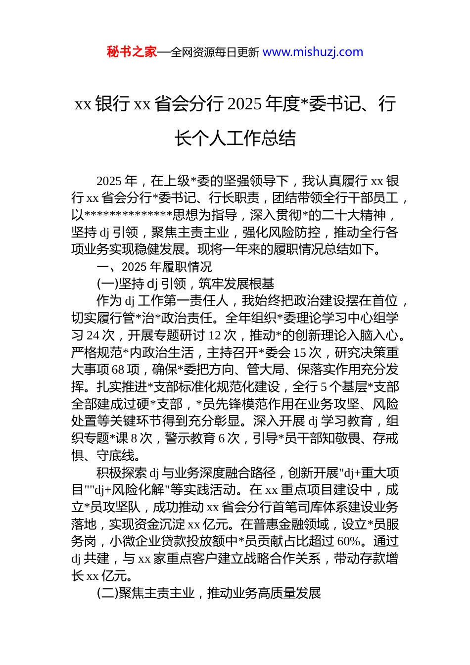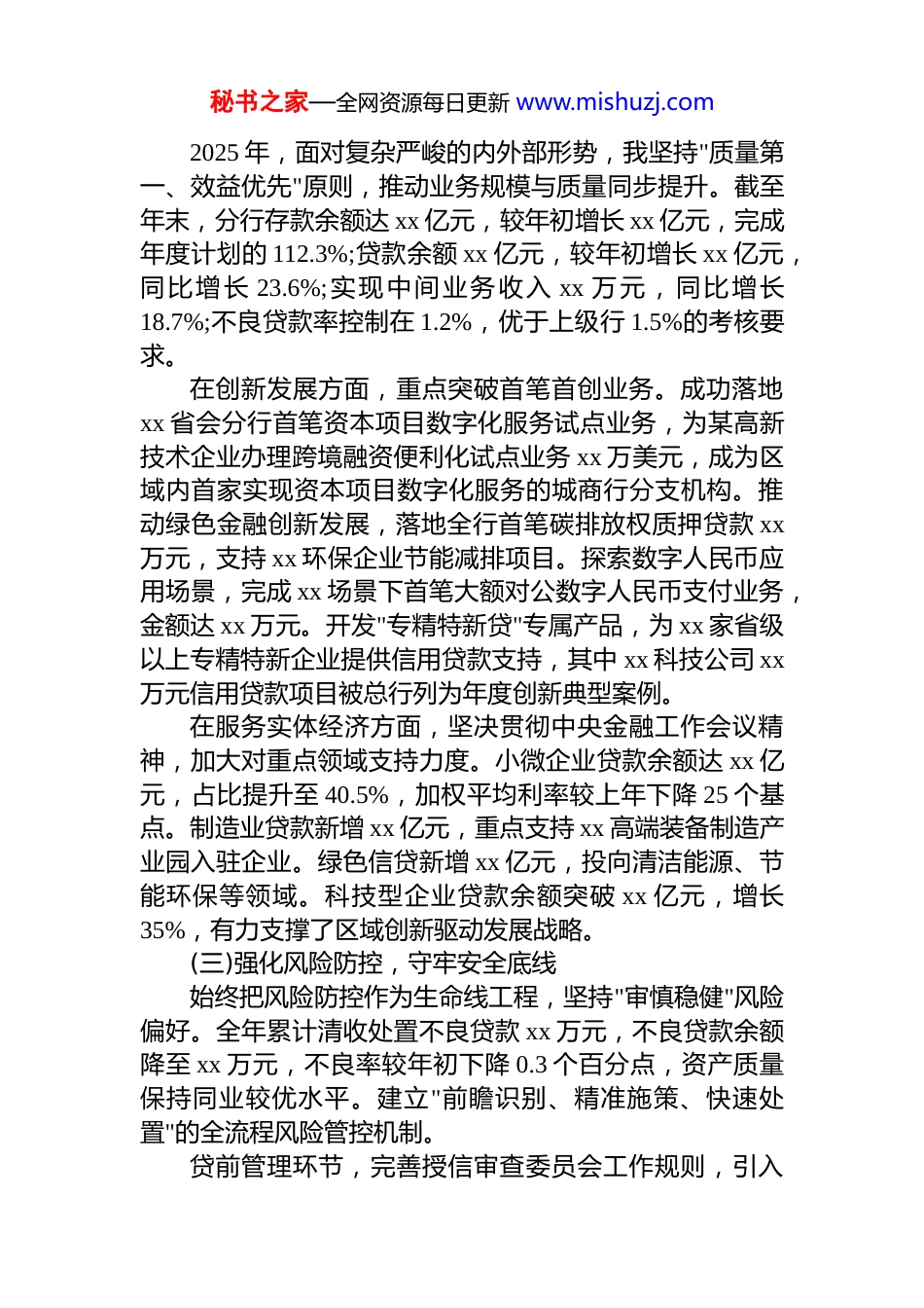 秘书之家—全网资源每日更新 www.mishuzj.comxx 银行 xx 省会分行 2025 年度*委书记、行长个人工作总结2025 年,在上级*委的坚强领导下,我认真履行 xx 银行 xx 省会分行*委书记、行长职责,团结带领全行干部员工,以**************思想为指导,深入贯彻*的二十大精神,坚持 dj 引领,聚焦主责主业,强化风险防控,推动全行各项业务实现稳健发展。现将一年来的履职情况总结如下。一、2025 年履职情况(一)坚持 dj 引领,筑牢发展根基作为 dj 工作第一责任人,我始终把政治建设摆在首位,切实履行管*治*政治责任。全年组织*委理论学习中心组学习 24 次,开展专题研讨 12 次,推动*的创新理论入脑入心。严格规范*内政治生活,主持召开*委会 15 次,研究决策重大事项 68 项,确保*委把方向、管大局、保落实作用充分发挥。扎实推进*支部标准化规范化建设,全行 5 个基层*支部全部建成过硬*支部,*员先锋模范作用在业务攻坚、风险处置等关键环节得到充分彰显。深入开展 dj 学习教育,组织专题*课 8 次,警示教育 6 次,引导*员干部知敬畏、存戒惧、守底线。积极探索 dj 与业务深度融合路径,创新开展"dj+重大项目""dj+风险化解"等实践活动。在 xx 重点项目建设中,成立*员攻坚队,成功推动 xx 省会分行首笔司库体系建设业务落地,实现资金沉淀 xx 亿元。在普惠金融领域,设立*员服务岗,小微企业贷款投放额中*员贡献占比超过 60%。通过dj 共建,与 xx 家重点客户建立战略合作关系,带动存款增长 xx 亿元。(二)聚焦主责主业,推动业务高质量发展秘书之家—全网资源每日更新 www.mishuzj.com2025 年,面对复杂严峻的内外部形势,我坚持"质量第一、效益优先"原则,推动业务规模与质量同步提升。截至年末,分行存款余额达 xx 亿元,较年初增长 xx 亿元,完成年度计划的 112.3%;贷款余额 xx 亿元,较年初增长 xx 亿元,同比增长 23.6%;实现中间业务收入 xx 万元,同比增长18.7%;不良贷款率控制在 1.2%,优于上级行 1.5%的考核要求。在创新发展方面,重点突破首笔首创业务。成功落地xx 省会分行首笔资本项目数字化服务试点业务,为某高新技术企业办理跨境融资便利化试点业务 xx 万美元,成为区域内首家实现资本项目数字化服务的城商行分支机构。推动绿色金融创新发展,落地全行首笔碳排放权质押贷款 xx万元,支持 xx 环保企业节能减排项目。探索数字人民币应用场景,完成 xx 场景下首笔大额对公数字人民币支付业务,金额达 xx 万元。开发"专精特新贷"专属产品,为 xx 家省级以上专精特新企业提供信用贷款支持,其中 xx 科技公司 xx万元信用贷款项目被总行列为年度创新典型案例。在服务实体经济方面,坚决贯彻中央金融工作会议精神,加大对重点领域支持力度。小微企业贷款余额达 xx 亿元,占比提升至 40.5%,加权平均利率较上年下降 25 个基点。制造业贷款新增 xx 亿元,重点支持 xx 高端装备制造产业园入驻企业。绿色信贷新增 xx 亿元,投向清洁能源、节能环保等领域。科技型企业贷款余额突破 xx 亿元,增长35%,有力支撑了区域创新驱动发展战略。(三)强化风险防控,守牢安全底线始终把风险防控作为生命线工程,坚持"审慎稳健"风险偏好。全年累计清收处置不良贷款 xx 万元,不良贷款余额降至 xx 万元,不良率较年初下降 0.3 个百分点,资产质量保持同业较优水平。建立"前瞻识别、精准施策、快速处置"的全流程风险管控机制。贷前管理环节,完善授信审查委员会工作规则,引入秘书之家—全网资源每日更新 www.mishuzj.com外部专家参与重大项目评审,全年否决高风险项目 xx 个,金额 xx 亿元。贷中管理环节,实施放款全流程线上化改造,关键节点系统刚性控制,操作风险事件同比下降 40%。贷后管理环节,建立重点客户风险监测预警系统,对 xx 户风险客户实施名单制管理,提前化解潜在风险 xx 亿元。年内成功处置 xx 企业贷款逾期风险,通过协调担保方、追加抵押物等措施,在 20 天内全额收回本息,避免了损失。内控合规建设方面,组织开展"内控合规管理建设年"活动,修订完善授信...