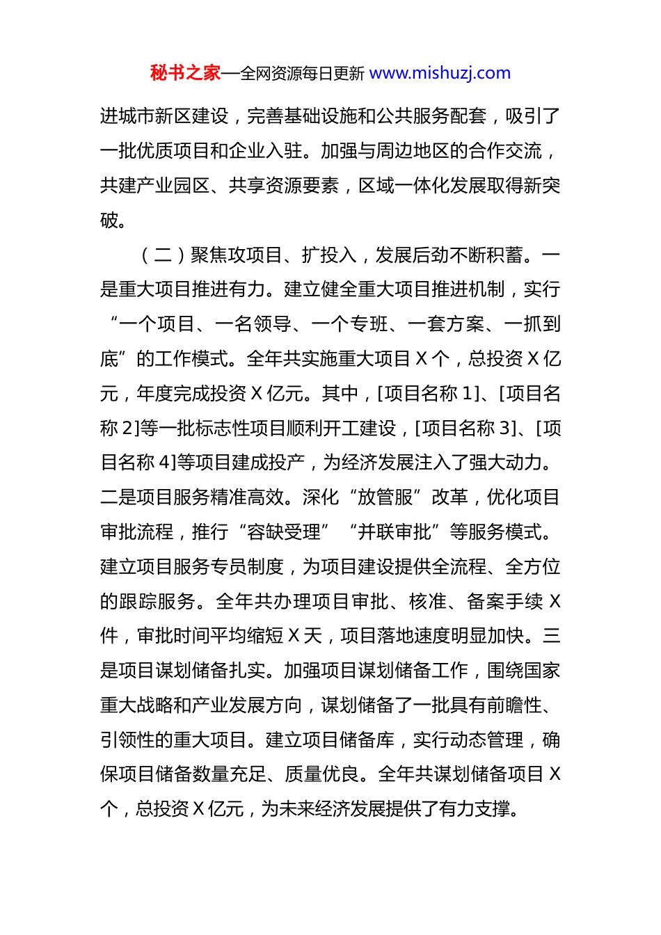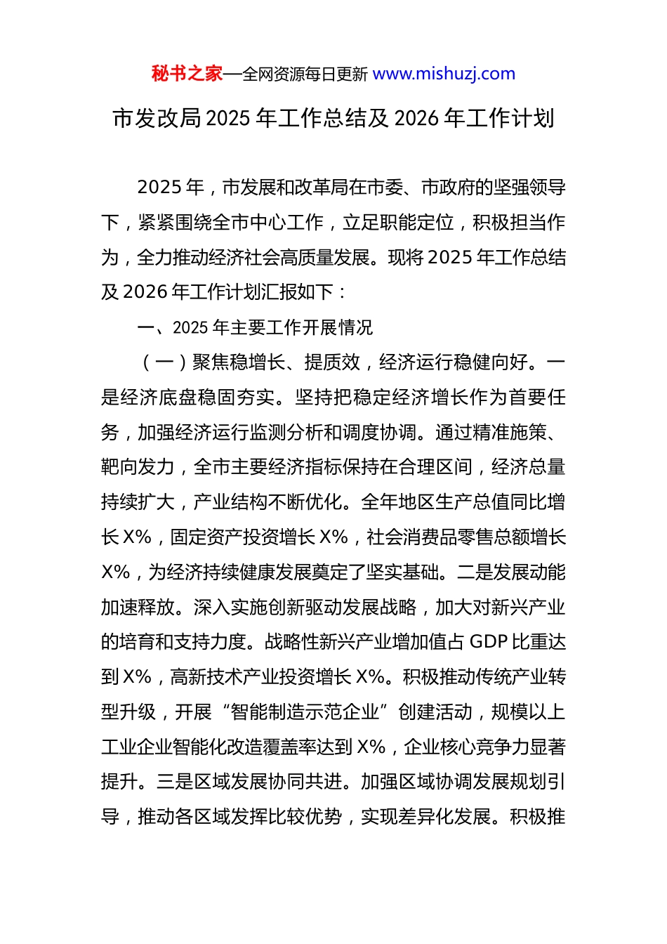 秘书之家—全网资源每日更新 www.mishuzj.com市发改局 2025 年工作总结及 2026 年工作计划 2025 年,市发展和改革局在市委、市政府的坚强领导下,紧紧围绕全市中心工作,立足职能定位,积极担当作为,全力推动经济社会高质量发展。现将 2025 年工作总结及 2026 年工作计划汇报如下:一、2025 年主要工作开展情况(一)聚焦稳增长、提质效,经济运行稳健向好。一是经济底盘稳固夯实。坚持把稳定经济增长作为首要任务,加强经济运行监测分析和调度协调。通过精准施策、靶向发力,全市主要经济指标保持在合理区间,经济总量持续扩大,产业结构不断优化。全年地区生产总值同比增长 X%,固定资产投资增长 X%,社会消费品零售总额增长X%,为经济持续健康发展奠定了坚实基础。二是发展动能加速释放。深入实施创新驱动发展战略,加大对新兴产业的培育和支持力度。战略性新兴产业增加值占 GDP 比重达到 X%,高新技术产业投资增长 X%。积极推动传统产业转型升级,开展“智能制造示范企业”创建活动,规模以上工业企业智能化改造覆盖率达到 X%,企业核心竞争力显著提升。三是区域发展协同共进。加强区域协调发展规划引导,推动各区域发挥比较优势,实现差异化发展。积极推秘书之家—全网资源每日更新 www.mishuzj.com进城市新区建设,完善基础设施和公共服务配套,吸引了一批优质项目和企业入驻。加强与周边地区的合作交流,共建产业园区、共享资源要素,区域一体化发展取得新突破。(二)聚焦攻项目、扩投入,发展后劲不断积蓄。一是重大项目推进有力。建立健全重大项目推进机制,实行“一个项目、一名领导、一个专班、一套方案、一抓到底”的工作模式。全年共实施重大项目 X 个,总投资 X 亿元,年度完成投资 X 亿元。其中,[项目名称 1]、[项目名称 2]等一批标志性项目顺利开工建设,[项目名称 3]、[项目名称 4]等项目建成投产,为经济发展注入了强大动力。二是项目服务精准高效。深化“放管服”改革,优化项目审批流程,推行“容缺受理”“并联审批”等服务模式。建立项目服务专员制度,为项目建设提供全流程、全方位的跟踪服务。全年共办理项目审批、核准、备案手续 X件,审批时间平均缩短 X 天,项目落地速度明显加快。三是项目谋划储备扎实。加强项目谋划储备工作,围绕国家重大战略和产业发展方向,谋划储备了一批具有前瞻性、引领性的重大项目。建立项目储备库,实行动态管理,确保项目储备数量充足、质量优良。全年共谋划储备项目 X个,总投资 X 亿元,为未来经济发展提供了有力支撑。秘书之家—全网资源每日更新 www.mishuzj.com(三)聚焦优环境、激活力,改革开放深入推进。一是营商环境持续优化。深入开展营商环境优化提升行动,出台一系列政策措施,着力解决企业反映的痛点、难点、堵点问题。加强政务服务标准化、规范化、便利化建设,推行“一网通办”“最多跑一次”改革,政务服务事项网上可办率达到 X%。开展营商环境评价,及时发现问题并加以整改,我市营商环境综合排名在全省位居前列。二是重点改革稳步推进。持续深化经济体制改革,在价格改革、投融资体制改革、国有企业改革等领域取得了新进展。推进电力体制改革,完善电价形成机制,降低企业用电成本。深化投融资体制改革,推广政府和社会资本合作(PPP)模式,吸引社会资本参与基础设施和公共服务项目建设。加快国有企业改革步伐,推进国有资本布局优化和结构调整,提高国有企业竞争力和活力。三是开放合作不断拓展。积极融入国家“一带一路”建设,加强与国内外友好城市的交流合作。组织企业参加各类国内外展会和经贸洽谈活动,拓展市场空间。加强口岸建设,提升通关便利化水平。全年外贸进出口总额达到 X 亿美元,同比增长X%;实际利用外资 X 亿美元,同比增长 X%。(四)聚焦惠民生、促和谐,民生福祉显著提升。一是公共服务供给优化。加大对教育、医疗、文化等公共服秘书之家—全网资源每日更新 www.mishuzj.com务领域的投入,推动基本公共服务均等化。新建、改扩建学校 X 所,新增学位 X 个;医疗卫生服务体系不断完善,基层医疗卫生机构标准化建设覆盖率达到...