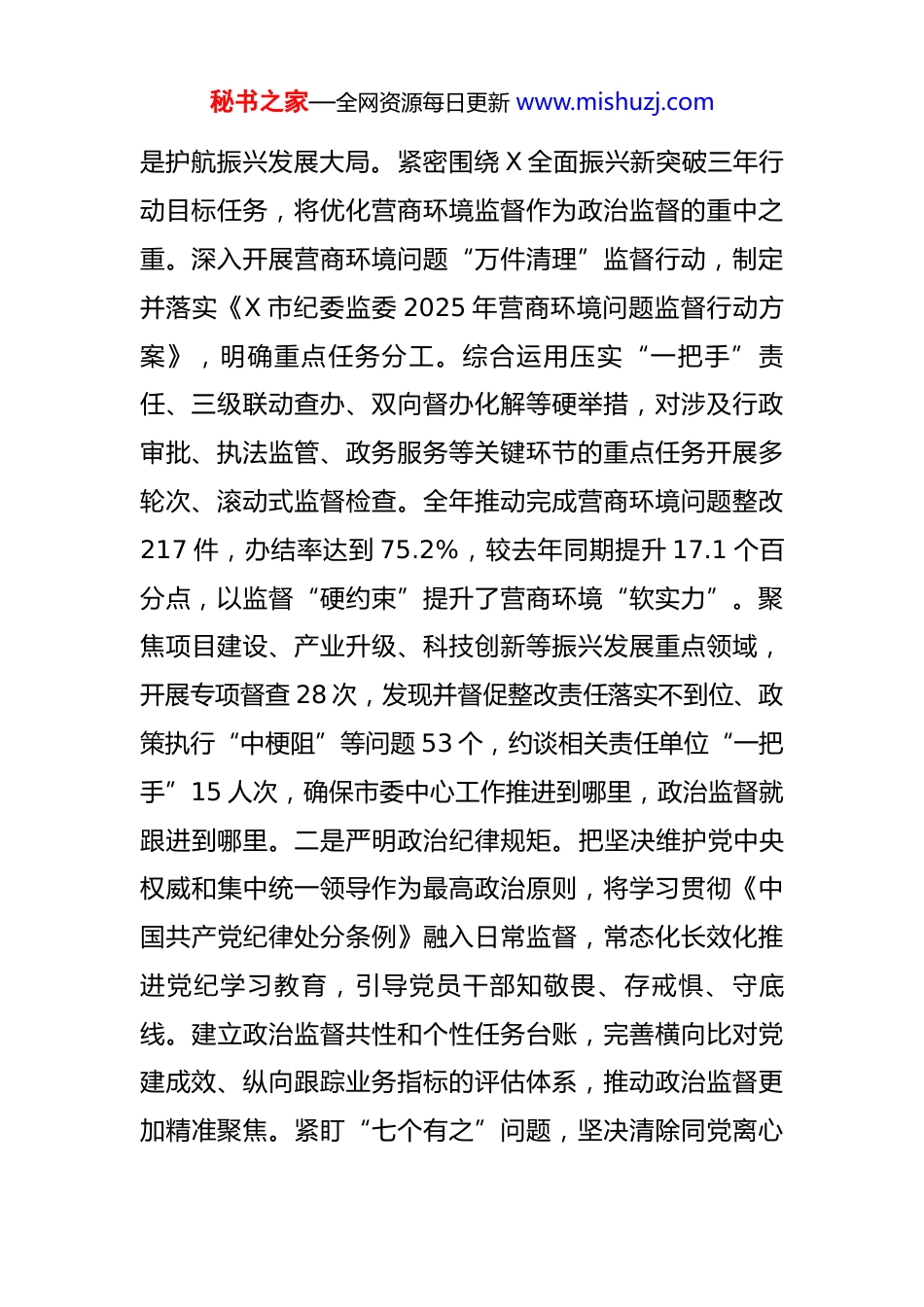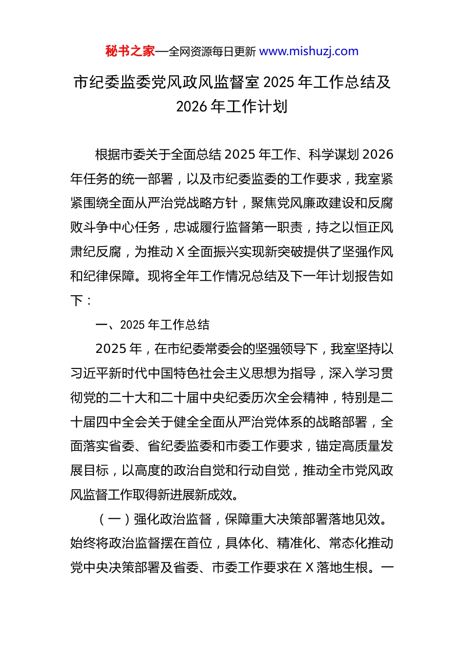 秘书之家—全网资源每日更新 www.mishuzj.com市纪委监委党风政风监督室 2025 年工作总结及2026 年工作计划 根据市委关于全面总结 2025 年工作、科学谋划 2026年任务的统一部署,以及市纪委监委的工作要求,我室紧紧围绕全面从严治党战略方针,聚焦党风廉政建设和反腐败斗争中心任务,忠诚履行监督第一职责,持之以恒正风肃纪反腐,为推动 X 全面振兴实现新突破提供了坚强作风和纪律保障。现将全年工作情况总结及下一年计划报告如下:一、2025 年工作总结2025 年,在市纪委常委会的坚强领导下,我室坚持以习近平新时代中国特色社会主义思想为指导,深入学习贯彻党的二十大和二十届中央纪委历次全会精神,特别是二十届四中全会关于健全全面从严治党体系的战略部署,全面落实省委、省纪委监委和市委工作要求,锚定高质量发展目标,以高度的政治自觉和行动自觉,推动全市党风政风监督工作取得新进展新成效。(一)强化政治监督,保障重大决策部署落地见效。始终将政治监督摆在首位,具体化、精准化、常态化推动党中央决策部署及省委、市委工作要求在 X 落地生根。一秘书之家—全网资源每日更新 www.mishuzj.com是护航振兴发展大局。紧密围绕 X 全面振兴新突破三年行动目标任务,将优化营商环境监督作为政治监督的重中之重。深入开展营商环境问题“万件清理”监督行动,制定并落实《X 市纪委监委 2025 年营商环境问题监督行动方案》,明确重点任务分工。综合运用压实“一把手”责任、三级联动查办、双向督办化解等硬举措,对涉及行政审批、执法监管、政务服务等关键环节的重点任务开展多轮次、滚动式监督检查。全年推动完成营商环境问题整改217 件,办结率达到 75.2%,较去年同期提升 17.1 个百分点,以监督“硬约束”提升了营商环境“软实力”。聚焦项目建设、产业升级、科技创新等振兴发展重点领域,开展专项督查 28 次,发现并督促整改责任落实不到位、政策执行“中梗阻”等问题 53 个,约谈相关责任单位“一把手”15 人次,确保市委中心工作推进到哪里,政治监督就跟进到哪里。二是严明政治纪律规矩。把坚决维护党中央权威和集中统一领导作为最高政治原则,将学习贯彻《中国共产党纪律处分条例》融入日常监督,常态化长效化推进党纪学习教育,引导党员干部知敬畏、存戒惧、守底线。建立政治监督共性和个性任务台账,完善横向比对党建成效、纵向跟踪业务指标的评估体系,推动政治监督更加精准聚焦。紧盯“七个有之”问题,坚决清除同党离心秘书之家—全网资源每日更新 www.mishuzj.com离德的“两面人”、结党营私的“小圈子”、阳奉阴违的“伪忠诚”,全年查处违反政治纪律和政治规矩案件 5 件 5人,有效维护了政令畅通。三是压实管党治党责任。协助市委深化落实《党委(党组)落实全面从严治党主体责任规定》,细化责任清单,强化督导考核。组织开展 2024 年度全市党风廉政建设责任制考核,对考核排名靠后的 4 个单位党委(党组)主要负责人进行约谈,并督促抓好反馈问题整改。完善对“一把手”和领导班子监督的制度措施,通过列席重要会议、谈心谈话、述责述廉评议等方式,加强对“关键少数”履职用权的监督约束。全年参加或列席县区、市直部门党组(党委)会议、民主生活会等60 余场次,提出监督意见 130 余条,推动各级“一把手”严于律己、严负其责、严管所辖。(二)深化正风肃纪,锲而不舍落实纪律规定要求。坚持党性党风党纪一起抓,扎实开展深入贯彻纪律规定精神学习教育,把纪律规定精神作为长期有效的铁规矩、硬杠杠,常抓不懈、久久为功。一是靶向纠治“四风”顽疾。紧盯“四风”新动向新表现,深挖细查隐形变异问题。在元旦、春节、五一、中秋、国庆等重要节点,提前印发通知、发送廉政提醒短信 8 次,覆盖全市副科级以上领导干部 5300 余人次,营造严的氛围。会同财政、审计、秘书之家—全网资源每日更新 www.mishuzj.com公安、税务、机关事务管理等部门,组成联合监督检查组,采取“组地”协作、“室组”联动方式,运用明察暗访、交叉互检、异地检查、大数据比对等手段,深入景区饭店、商超烟酒店、机关食堂、土特产店...