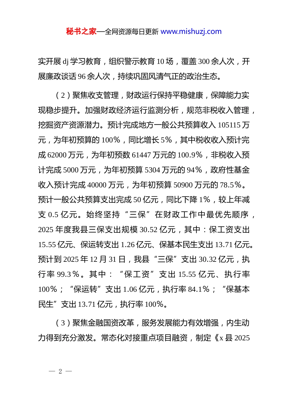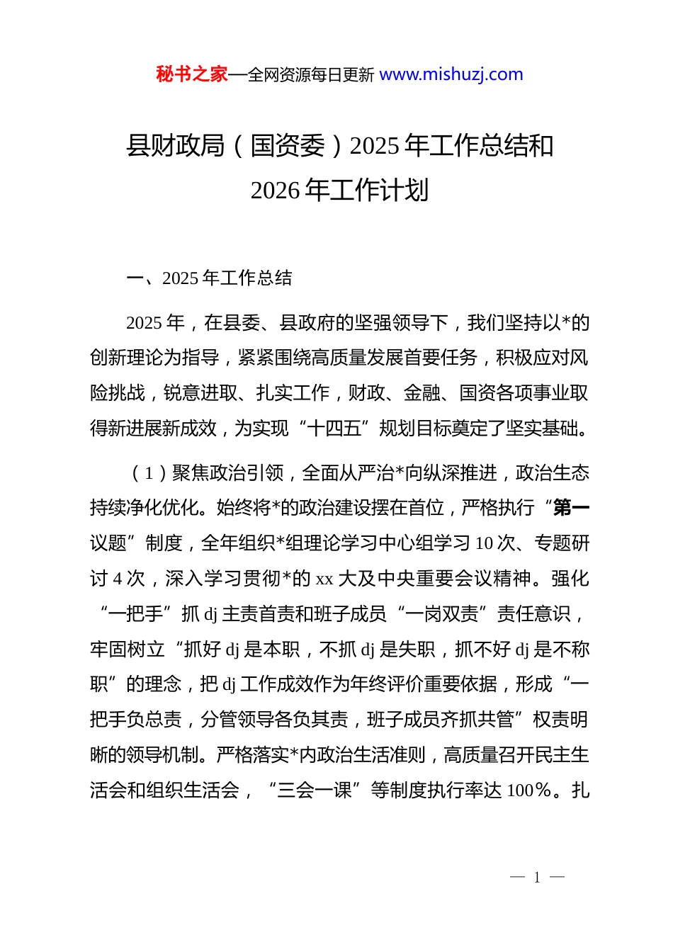 秘书之家—全网资源每日更新 www.mishuzj.com县财政局(国资委)2025 年工作总结和2026 年工作计划一、2025 年工作总结2025 年,在县委、县政府的坚强领导下,我们坚持以*的创新理论为指导,紧紧围绕高质量发展首要任务,积极应对风险挑战,锐意进取、扎实工作,财政、金融、国资各项事业取得新进展新成效,为实现“十四五”规划目标奠定了坚实基础。(1)聚焦政治引领,全面从严治*向纵深推进,政治生态持续净化优化。始终将*的政治建设摆在首位,严格执行“第一议题”制度,全年组织*组理论学习中心组学习 10 次、专题研讨 4 次,深入学习贯彻*的 xx 大及中央重要会议精神。强化“一把手”抓 dj 主责首责和班子成员“一岗双责”责任意识,牢固树立“抓好 dj 是本职,不抓 dj 是失职,抓不好 dj 是不称职”的理念,把 dj 工作成效作为年终评价重要依据,形成“一把手负总责,分管领导各负其责,班子成员齐抓共管”权责明晰的领导机制。严格落实*内政治生活准则,高质量召开民主生活会和组织生活会,“三会一课”等制度执行率达 100%。扎— 1 —秘书之家—全网资源每日更新 www.mishuzj.com实开展 dj 学习教育,组织警示教育 10 场,覆盖 300 余人次,开展廉政谈话 96 余人次,持续巩固风清气正的政治生态。(2)聚焦收支管理,财政运行保持平稳健康,保障能力实现稳步提升。加强财政经济运行监测分析,规范非税收入管理,挖掘资产资源潜力。预计完成地方一般公共预算收入 105115 万元,为年初预算的 100%,同比增长 5%,其中税收收入预计完成 62000 万元,为年初预数 61447 万元的 100.9%,非税收入预计完成 5000 万元,为年初预算 5304 万元的 94%,政府性基金收入预计完成 40000 万元,为年初预算 50900 万元的 78.5%。预计一般公共预算支出完成 50 亿元,同比下降 1%,较上年减支 0.5 亿元。始终坚持“三保”在财政工作中最优先顺序 ,2025 年度我县三保支出规模 30.52 亿元,其中:保工资支出15.55 亿元、保运转支出 1.26 亿元、保基本民生支出 13.71 亿元。预计到 2025 年 12 月 31 日,我县“三保”支出 30.32 亿元,执行率 99.3%。其中:“保工资”支出 15.55 亿元、执行率100%;“保运转”支出 1.06 亿元,执行率 84.1%;“保基本民生”支出 13.71 亿元,执行率 100%。(3)聚焦金融国资改革,服务发展能力有效增强,内生动力得到充分激发。常态化对接重点项目融资,制定《x 县 2025— 2 —秘书之家—全网资源每日更新 www.mishuzj.com年度银企对接工作实施方案》,全年开展专题银企对接活动 4次,达成融资意向 2.4 亿元。企业上市工作实现突破,绿动能源、富印新材料成功登陆新三板,打破县域零记录;富印新材料上市申请获北交所受理并于 9 月完成首轮审核问询,上市进程稳步推进。深化国企改革,推动县域经济高质量发展。产投集团房产项目销售回款超 1 亿元,文旅集团通过提升运营、拓展业务实现收入 5582.53 万元;同时计划市场化招聘 23 人,增强人才支撑。实体化项目建设稳步推进,光伏二期项目基本建成并网,光储充一体化项目完成 epc 签约,国家储备林项目流转林地 1 万亩,智慧停车项目已完成 478 个泊位施工及平台搭建,羊乌山矿项目拆迁与外运道路建设有序进行。管理机制持续优化,完成对三家直接监管企业 2024 年经营业绩考核并下达新年目标,据此调整集团班子成员 3 人次,强化考核指挥棒作用。存量资产盘活成效显著,通过处置房屋、保障房、抵债资产及转让国有股权等方式,实现盘活总收入 3141.63 万元,并取得股权转让收益 368.97 万元。聚焦风险防控,财政金融安全底线牢牢守住,发展根基实现持续巩固。围绕保障资金需求、防范化解债务风险等目标,积极争取各类债券资金,统筹做好项目申报、发行使用与还本— 3 —秘书之家—全网资源每日更新 www.mishuzj.com付息工作。聚焦改革创新,财政管理效能持续提升,体制机制实现系统重塑。全面实施零基预算改革,打破支出固化格局。深化预算绩效管理,将绩效管理范围覆盖所有...