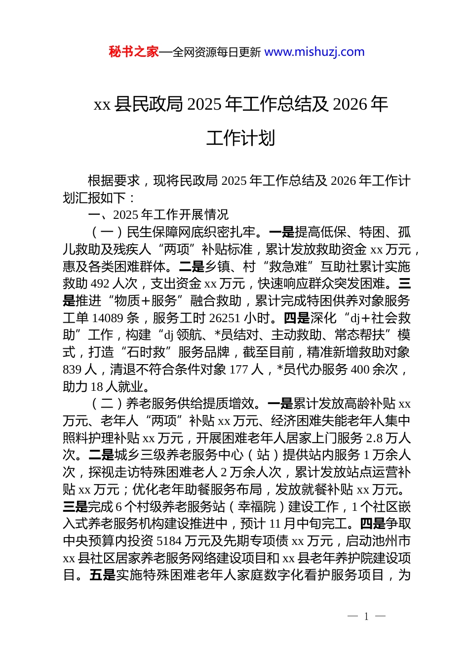 秘书之家—全网资源每日更新 www.mishuzj.comxx 县民政局 2025 年工作总结及 2026 年工作计划根据要求,现将民政局 2025 年工作总结及 2026 年工作计划汇报如下:一、2025 年工作开展情况(一)民生保障网底织密扎牢。一是提高低保、特困、孤儿救助及残疾人“两项”补贴标准,累计发放救助资金 xx 万元,惠及各类困难群体。二是乡镇、村“救急难”互助社累计实施救助 492 人次,支出资金 xx 万元,快速响应群众突发困难。三是推进“物质+服务”融合救助,累计完成特困供养对象服务工单 14089 条,服务工时 26251 小时。四是深化“dj+社会救助”工作,构建“dj 领航、*员结对、主动救助、常态帮扶”模式,打造“石时救”服务品牌,截至目前,精准新增救助对象839 人,清退不符合条件对象 177 人,*员代办服务 400 余次,助力 18 人就业。(二)养老服务供给提质增效。一是累计发放高龄补贴 xx万元、老年人“两项”补贴 xx 万元、经济困难失能老年人集中照料护理补贴 xx 万元,开展困难老年人居家上门服务 2.8 万人次。二是城乡三级养老服务中心(站)提供站内服务 1 万余人次,探视走访特殊困难老人 2 万余人次,累计发放站点运营补贴 xx 万元;优化老年助餐服务布局,发放就餐补贴 xx 万元。三是完成 6 个村级养老服务站(幸福院)建设工作,1 个社区嵌入式养老服务机构建设推进中,预计 11 月中旬完工。四是争取中央预算内投资 5184 万元及先期专项债 xx 万元,启动池州市xx 县社区居家养老服务网络建设项目和 xx 县老年养护院建设项目。五是实施特殊困难老年人家庭数字化看护服务项目,为— 1 —秘书之家—全网资源每日更新 www.mishuzj.com310 户独居老人家庭安装智能监控设备,筑牢居家安全防线。六是制定《全县民政领域春季安全生产大排查实施方案》,排查养老机构安全隐患 58 个,已整改 52 个,剩余 6 个问题建立台账限期整改;组织养老机构院长参加省民政、消防线上培训,提升安全管理专业能力。(三)社会事务服务稳步提升。一是联合县发改委印发《关于重新核定 xx 县九龙山生态陵园殡葬服务及公益性公墓收费标准的批复》,通过减少服务项目、降低收费标准,优化殡葬服务。二是今年累计办理结婚登记 224 对、离婚登记 91 对,补领结婚证 65 对,为 36 对新人提供婚前辅导,推动婚俗改革走深走实。三是新登记社会组织 4 家,注销“僵尸型”社会组织 4 家,年检合格率 80.12%,1 家社会组织获评 3a 级全县性社会组织。四是印发《xx 县乡村道路命(更)名备案工作规范》,完成城区迎宾路、城东路命名;联合贵池区完成行政区域界线联合检查,维护边界和谐稳定。(四)退役军人服务保障提质增效。一是 1-10 月累计发放抚恤、生活补助、优待、慰问等资金 xx 万元,保障退役军人及优抚对象基本生活。二是完成 25 名春季、秋季返乡退役军人报到登记,为 2 名政府安排退役士兵办理安置选岗、待安置期待遇发放。三是组织 16 名退役军人、5 家军创企业、2 家企业参加安徽省退役军人专场招聘会暨创业成果展,拓宽就业创业渠道。四是组织 9·30 烈士纪念日向敬献花篮活动,县四大班子主要领导及各界代表 200 余人参加,传承红色基因,凝聚奋进力量。二、2026 年工作计划(一)提高社会救助精准度。一是严格落实城乡低保、特困供养、孤儿和事实无人抚养儿童、残疾人“两项”补贴标准动态调整机制,扎实做好各类救助工作。二是推进社会救助申请审核信息化、“主动发现”常态化,实施“一次申请、分类— 2 —秘书之家—全网资源每日更新 www.mishuzj.com审核认定”规范改革,推动防止返贫帮扶政策与低收入人口常态化帮扶政策衔接并轨。三是强化政府救助与慈善帮扶衔接,发挥村(社区)“救急难”互助社、乡镇“救急难”互助社联合会快速、便捷的救助作用。四是推动“物质+服务”救助模式多元化发展,促进救助服务项目与困难群众需求精准对接。(二)加强养老服务体系建设。一是加快老年养护院等重点项目建设,以省级农村养老服务改革试点为抓手,统筹推进农村幸福院标准化建设...