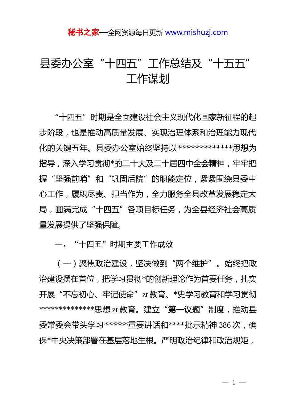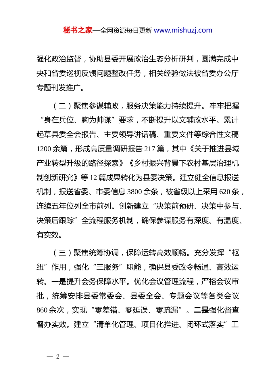 秘书之家—全网资源每日更新 www.mishuzj.com县委办公室“十四五”工作总结及“十五五”工作谋划“十四五”时期是全面建设社会主义现代化国家新征程的起步阶段,也是推动高质量发展、实现治理体系和治理能力现代化的关键五年。县委办公室始终坚持以**************思想为指导,深入学习贯彻*的二十大及二十届四中全会精神,牢牢把握“坚强前哨”和“巩固后院”的职能定位,紧紧围绕县委中心工作,履职尽责、担当作为,全力服务全县改革发展稳定大局,圆满完成“十四五”各项目标任务,为全县经济社会高质量发展提供了坚强保障。一、“十四五”时期主要工作成效(一)聚焦政治建设,坚决做到“两个维护”。始终把政治建设摆在首位,把学习贯彻*的创新理论作为首要任务,扎实开展“不忘初心、牢记使命”zt 教育、*史学习教育和学习贯彻**************思想 zt 教育。建立“第一议题”制度,推动县委常委会带头学习******重要讲话和****批示精神 386 次,确保*中央决策部署在基层落地生根。严明政治纪律和政治规矩,— 1 —秘书之家—全网资源每日更新 www.mishuzj.com强化政治监督,协助县委开展政治生态分析研判,圆满完成中央和省委巡视反馈问题整改任务,相关经验做法被省委办公厅专题刊发推广。(二)聚焦参谋辅政,服务决策能力持续提升。牢牢把握“身在兵位、胸为帅谋”要求,不断提升以文辅政水平。累计起草县委全会报告、主要领导讲话稿、重要文件等综合性文稿1200 余篇,形成高质量调研报告 217 篇,其中《关于推进县域产业转型升级的路径探索》《乡村振兴背景下农村基层治理机制创新研究》等 12 篇成果转化为县委决策。建立健全信息报送机制,报送省委、市委信息 3800 余条,被省级以上采用 620 条,连续五年位列全市前列。创新建立“决策前预研、决策中参与、决策后跟踪”全流程服务机制,确保参谋服务有深度、有温度、有实效。(三)聚焦统筹协调,保障运转高效顺畅。充分发挥“枢纽”作用,强化“三服务”职能,确保县委政令畅通、高效运转。一是提升会务保障水平。优化会议管理流程,严格会议审批,统筹安排县委常委会、县委全会、专题会议等各类会议860 余次,实现“零差错、零延误、零疏漏”。二是强化督查督办实效。建立“清单化管理、项目化推进、闭环式落实”工— 2 —秘书之家—全网资源每日更新 www.mishuzj.com作机制,对县委重大决策部署、领导批示事项实行台账管理,五年来累计立项督办事项 1860 项,办结率 99.6%,推动解决群众急难愁盼问题 430 余件。三是推进改革任务落地。牵头或协调推进*的建设、基层治理、“放管服”改革等重点领域改革任务 276 项,形成“dj 引领网格治理”“政务服务一网通办”等一批具有县域特色的改革成果,3 项经验被省委改革办简报刊发。(四)聚焦作风建设,机关运行更加规范有序。深入贯彻纪律规定及其要求,持续推进机关规范化、制度化建设。修订完善《县委办公室工作规则》《机关内部管理制度汇编》等制度 48 项,覆盖文秘、**、接待、财务、后勤等各环节。高标准完成*政机关事业单位办公用房清理整改任务,推进节约型机关建设,县本级“三公”经费连续五年实现压减。扎实开展“对标先进、提升效能”专项行动,组织业务培训、岗位练兵、轮岗交流等活动 56 场次,干部综合素质明显提升。2023 年,县委办公室被评为“全省*委系统办公室工作先进单位”。(五)聚焦基层减负,推动治理效能不断提升。深入贯彻落实中央和省市关于整治形式主义为基层减负的决策部署,协助县委制定出台《关于持续解决形式主义突出问题为基层减负— 3 —秘书之家—全网资源每日更新 www.mishuzj.com的若干措施》,建立基层负担动态监测机制。五年来,全县会议、文件数量年均压减 15%以上,督查检查考核事项整合率超过 50%。推动“指尖上的形式主义”专项整治,清理整合政务类 app、工作群组 132 个。强化数字赋能,建成县级政务数据共享平台,推动“一网通办”事项覆盖率达 98%,基层办事效率提升 60%以上,相关做法在全市作风建设大会上作交流发言。二、“十五五”时期工作谋划面向“十五五”,我国将...