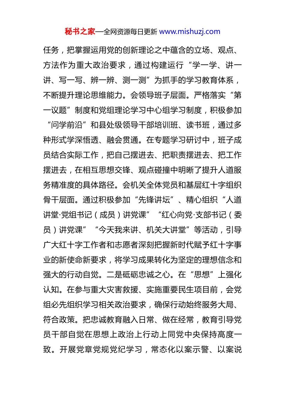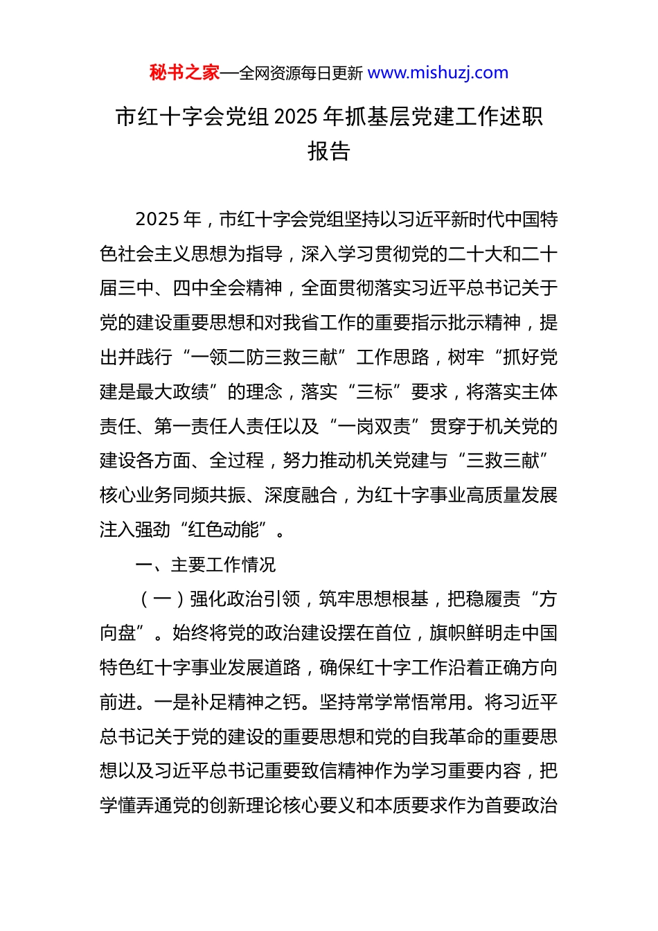 秘书之家—全网资源每日更新 www.mishuzj.com市红十字会党组 2025 年抓基层党建工作述职报告 2025 年,市红十字会党组坚持以习近平新时代中国特色社会主义思想为指导,深入学习贯彻党的二十大和二十届三中、四中全会精神,全面贯彻落实习近平总书记关于党的建设重要思想和对我省工作的重要指示批示精神,提出并践行“一领二防三救三献”工作思路,树牢“抓好党建是最大政绩”的理念,落实“三标”要求,将落实主体责任、第一责任人责任以及“一岗双责”贯穿于机关党的建设各方面、全过程,努力推动机关党建与“三救三献”核心业务同频共振、深度融合,为红十字事业高质量发展注入强劲“红色动能”。一、主要工作情况(一)强化政治引领,筑牢思想根基,把稳履责“方向盘”。始终将党的政治建设摆在首位,旗帜鲜明走中国特色红十字事业发展道路,确保红十字工作沿着正确方向前进。一是补足精神之钙。坚持常学常悟常用。将习近平总书记关于党的建设的重要思想和党的自我革命的重要思想以及习近平总书记重要致信精神作为学习重要内容,把学懂弄通党的创新理论核心要义和本质要求作为首要政治秘书之家—全网资源每日更新 www.mishuzj.com任务,把掌握运用党的创新理论之中蕴含的立场、观点、方法作为重大政治要求,通过构建运行“学一学、讲一讲、写一写、辨一辨、测一测”为抓手的学习教育体系,不断提升理论思维能力。会领导班子层面。严格落实“第一议题”制度和党组理论学习中心组学习制度,积极参加“问学前沿”和县处级领导干部培训班、读书班,通过多种形式学深悟透、融会贯通。在专题学习研讨中,班子成员结合实际工作,把自己摆进去、把职责摆进去、把工作摆进去,在相互思想交锋、观点碰撞中明晰了提升人道服务精准度的具体路径。会机关全体党员和基层红十字组织骨干层面。通过积极参加“先锋讲坛”、精心组织“人道讲堂·党组书记(成员)讲党课”“红心向党·支部书记(委员)讲党课”“今天我来讲、机关大讲堂”等活动,引导广大红十字工作者和志愿者深刻把握新时代赋予红十字事业的新使命新要求,将学习成果转化为坚定的理想信念和强大的行动自觉。二是砥砺忠诚之心。在“思想”上强化认知。在参与重大灾害救援、实施重要民生项目前,会党组必先组织学习相关政治要求,确保行动始终服务大局、符合政策。把忠诚教育融入日常、做在经常,教育引导党员干部自觉在思想上政治上行动上同党中央保持高度一致。开展党章党规党纪学习,常态化以案示警、以案说秘书之家—全网资源每日更新 www.mishuzj.com法,引导党员干部知敬畏、存戒惧、守底线。在“立行”上严守规矩。坚持把维护政治纪律和政治规矩挺在最前面,要求党员干部在一切工作中自觉同党中央决策部署对标对表。严格执行重大事项请示报告制度,确保党对红十字工作的全面领导落到实处、一贯到底。将“五个必须”要求融入日常言行和工作实践,做到令行禁止、步调一致。在“守纪”中担当尽责。会党组在没有可借鉴经验和法律明文规定具体办法的情况,坚持实事求是,以“功成不必在我”的担当精神,强力推动“长期沉淀”捐赠资金使用问题解决,充分发挥资金社会效益,坚定做党和政府织密扎牢民生保障网的重要力量。三是走好奉献之路。站稳人民立场。深刻认识红十字事业是造福人民群众的崇高事业,其核心就是践行以人民为中心的发展思想。会党组始终强调,落实党建主体责任,最终落脚点是增进民生福祉。厚植为民情怀。将“人道、博爱、奉献”的红十字精神内化于心、外化于行,用心用情用力解决好群众在人道救助、应急救护、生命关爱等方面的急难愁盼问题。在推动“应急救护实践站”项目建设中,党组明确要求党员骨干深入社区调研,精准对接居民需求,确保项目真正成为群众身边的“暖心工程”。树立践行正确政绩观。深化能力作风建设,防止“四风”问题反弹回潮,通过扎实有效秘书之家—全网资源每日更新 www.mishuzj.com的“博爱送万家”“红会送医”“急救地摊”等人道服务工作,确保党的温暖和每一份爱心善意精准廉洁地惠及困难群众,不断巩固党的执政基础和扩大党的群众基础。(二)夯实组织基础,锻造过硬队伍,建...