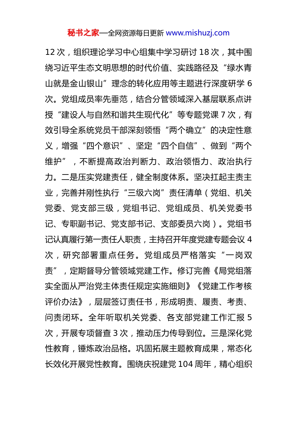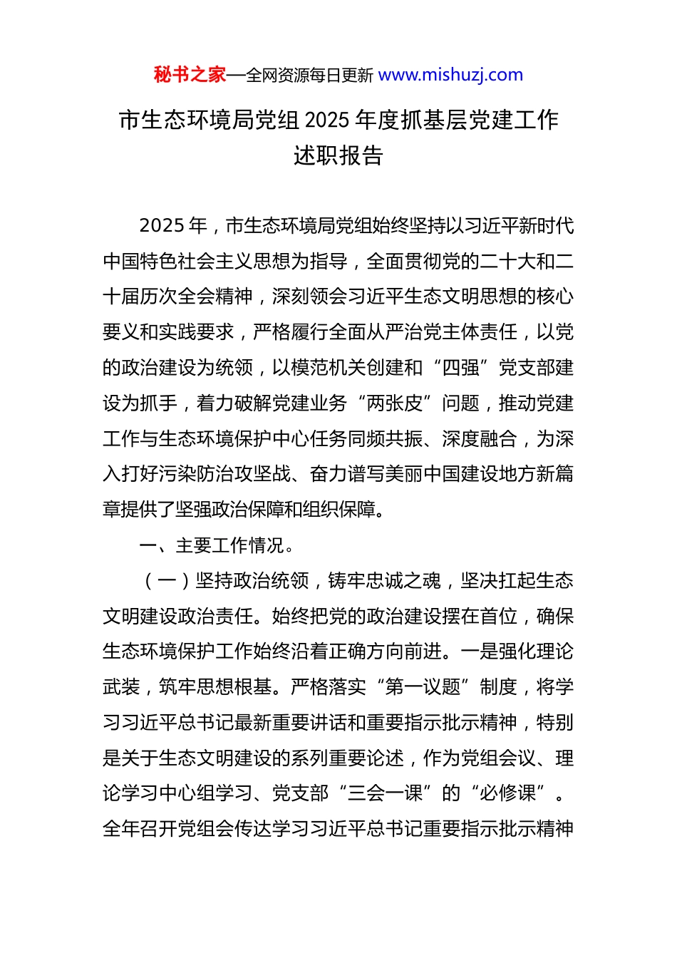 秘书之家—全网资源每日更新 www.mishuzj.com市生态环境局党组 2025 年度抓基层党建工作述职报告 2025 年,市生态环境局党组始终坚持以习近平新时代中国特色社会主义思想为指导,全面贯彻党的二十大和二十届历次全会精神,深刻领会习近平生态文明思想的核心要义和实践要求,严格履行全面从严治党主体责任,以党的政治建设为统领,以模范机关创建和“四强”党支部建设为抓手,着力破解党建业务“两张皮”问题,推动党建工作与生态环境保护中心任务同频共振、深度融合,为深入打好污染防治攻坚战、奋力谱写美丽中国建设地方新篇章提供了坚强政治保障和组织保障。一、主要工作情况。(一)坚持政治统领,铸牢忠诚之魂,坚决扛起生态文明建设政治责任。始终把党的政治建设摆在首位,确保生态环境保护工作始终沿着正确方向前进。一是强化理论武装,筑牢思想根基。严格落实“第一议题”制度,将学习习近平总书记最新重要讲话和重要指示批示精神,特别是关于生态文明建设的系列重要论述,作为党组会议、理论学习中心组学习、党支部“三会一课”的“必修课”。全年召开党组会传达学习习近平总书记重要指示批示精神秘书之家—全网资源每日更新 www.mishuzj.com12 次,组织理论学习中心组集中学习研讨 18 次,其中围绕习近平生态文明思想的时代价值、实践路径及“绿水青山就是金山银山”理念的转化应用等主题进行深度研学 6次。党组成员率先垂范,结合分管领域深入基层联系点讲授“建设人与自然和谐共生现代化”等专题党课 7 次,有效引导全系统党员干部深刻领悟“两个确立”的决定性意义,增强“四个意识”、坚定“四个自信”、做到“两个维护”,不断提高政治判断力、政治领悟力、政治执行力。二是压实党建责任,健全制度体系。坚决扛起主责主业,完善并刚性执行“三级六岗”责任清单(党组、机关党委、党支部三级,党组书记、党组成员、机关党委书记、专职副书记、党支部书记、支部委员六岗)。党组书记认真履行第一责任人职责,主持召开年度党建专题会议 4次,研究部署重点任务。党组成员严格落实“一 岗双责”,定期督导分管领域党建工作。修订完善《局党组落实全面从严治党主体责任规定实施细则》《党建工作考核评价办法》,层层签订责任书,形成明责、履责、考责、问责闭环。全年听取机关党委、各支部党建工作汇报 5次,开展专项督查 3 次,推动压力传导到位。三是深化党性教育,锤炼政治品格。巩固拓展主题教育成果,常态化长效化开展党性教育。围绕庆祝建党 104 周年,精心组织秘书之家—全网资源每日更新 www.mishuzj.com“七个一”系列活动(一次红色教育基地参观、一次重温入党誓词、一次先进事迹报告会、一次专题组织生活会、一次“我为发展献良策”座谈会、一次知识竞赛、一次主题征文),引导党员干部传承红色基因,坚定理想信念。持续推进“书香机关”建设,设立“习近平生态文明思想”读书角,举办读书分享会 8 期,撰写心得体会 200 余篇。结合“学雷锋纪念日”、“全国生态日”等节点,组织开展“党建引领·志愿同行”环保宣传、社区服务、义务植树等主题党日活动 40 余场次,让党旗在基层一线高高飘扬,党员干部的政治站位和思想根基得到显著提升。(二)聚焦强基固本,锻造环保铁军,全面提升基层组织战斗力。以建设“政治功能强、支部班子强、党员队伍强、作用发挥强”的“四强”党支部为目标,全面夯实基层战斗堡垒。一是规范组织生活,增强支部活力。严格执行《中国共产党支部工作条例(试行)》,确保“三会一课”、组织生活会、民主评议党员、谈心谈话等制度落到实处、提质增效。全年各党支部累计召开支部党员大会52 次、支委会 136 次、党小组会 208 次,党组成员以普通党员身份参加组织生活平均 12 次以上。高标准召开年度组织生活会和专题组织生活会,查摆问题 186 条,制定整改措施 230 项,批评与自我批评辣味足、效果好。创新组秘书之家—全网资源每日更新 www.mishuzj.com织生活形式,推广“情景式党课”、“案例式研讨”、“云端课堂”,增强吸引力感染力。二是建强支部班子,提升履职能力。选优配强党支部书记和委...