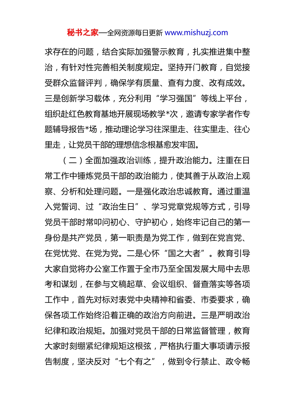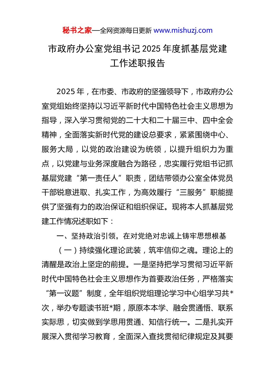 秘书之家—全网资源每日更新 www.mishuzj.com市政府办公室党组书记 2025 年度抓基层党建工作述职报告 2025 年,在市委、市政府的坚强领导下,市政府办公室党组始终坚持以习近平新时代中国特色社会主义思想为指导,深入学习贯彻党的二十大和二十届三中、四中全会精神,全面落实新时代党的建设总要求,紧紧围绕中心、服务大局,以党的政治建设为统领,以提升组织力为重点,以党建与业务深度融合为路径,忠实履行党组书记抓基层党建“第一责任人”职责,团结带领办公室全体党员干部锐意进取、扎实工作,为高效履行“三服务”职能提供了坚强有力的政治保证和组织保证。现将本人抓基层党建工作情况述职如下:一、坚持政治引领,在对党绝对忠诚上铸牢思想根基(一)持续强化理论武装,筑牢信仰之魂。理论上的清醒是政治上坚定的前提。一是坚持把学习贯彻习近平新时代中国特色社会主义思想作为首要政治任务,严格落实“第一议题”制度,全年组织党组理论学习中心组学习共*次,举办专题读书班*期,原原本本学、融会贯通悟、联系实际思,切实做到学思用贯通、知信行统一。二是扎实开展深入贯彻学习教育,全面深入查找贯彻纪律规定及其要秘书之家—全网资源每日更新 www.mishuzj.com求存在的问题,结合实际加强警示教育,扎实推进集中整治,有针对性完善相关制度规定。坚持开门教育,自觉接受群众监督评判,确保学有质量、查有力度、改有成效。三是创新学习载体,充分利用“学习强国”等线上平台,组织赴红色教育基地开展现场教学*次,邀请专家学者作专题辅导报告*场,推动理论学习往深里走、往实里走、往心里走,让党员干部的理想信念根基愈发牢固。(二)全面加强政治训练,提升政治能力。注重在日常工作中锤炼党员干部的政治能力,使其善于从政治上观察、分析和处理问题。一是强化政治忠诚教育。通过重温入党誓词、过“政治生日”、学习党章党规等方式,引导党员干部时常叩问初心、守护初心,始终牢记自己的第一身份是共产党员,第一职责是为党工作,做到在党言党、在党忧党、在党为党。二是心怀“国之大者”。教育引导大家自觉将办公室工作置于全市乃至全国发展大局中去思考和谋划,在参与文稿起草、会议组织、督查落实等各项工作中,首先对标对表党中央精神和省委、市委要求,确保各项工作始终沿着正确的政治方向前进。三是严明政治纪律和政治规矩。加强对党员干部的日常监督管理,教育大家时刻绷紧纪律规矩这根弦,严格执行重大事项请示报告制度,坚决反对“七个有之”,做到令行禁止、政令畅秘书之家—全网资源每日更新 www.mishuzj.com通,营造了风清气正的良好政治生态。(三)坚决贯彻决策部署,彰显政治担当。始终坚持把服务市委、市政府中心工作作为衡量党建成效的根本标准,以实际行动诠释对党的忠诚。一是围绕中心抓参谋。聚焦全市经济社会发展重点任务,组织党员骨干成立*个课题组,深入基层一线开展调查研究*余次,形成高质量调研报告*篇,为市领导科学决策提供了重要参考。二是围绕落实抓协调。充分发挥办公室承上启下、协调左右的中枢作用,建立党建引领下的高效协调机制,全年协调解决跨部门、跨领域重大事项*项,有力推动了市委、市政府各项决策部署的贯彻执行。三是围绕底线抓保障。面对防汛抗旱、应急处突等急难险重任务,第一时间成立党员突击队,*名党员干部主动请缨、冲锋在前,圆满完成了各项保障任务,以实际行动展现了办公室党员干部的过硬政治素质和担当精神。二、夯实基层基础,在建强战斗堡垒上激发组织活力(一)着力推进支部标准化规范化建设。基础不牢,地动山摇。抓好党建必须从最基本的制度、最基础的工作抓起。一是严格落实组织生活制度。督促各党支部严格执行“三会一课”、民主评议党员、主题党日等制度,全年各支部累计召开党员大会*次、支委会*次、党小组会*次,秘书之家—全网资源每日更新 www.mishuzj.com党组班子成员带头以普通党员身份参加所在支部组织生活,以上率下推动组织生活严起来、实起来。二是优化支部设置。根据工作需要和党员分布情况,及时调整优化党支部设置,选优配强支部书记,确保基层党组织全覆盖、无死角,党的工作延...