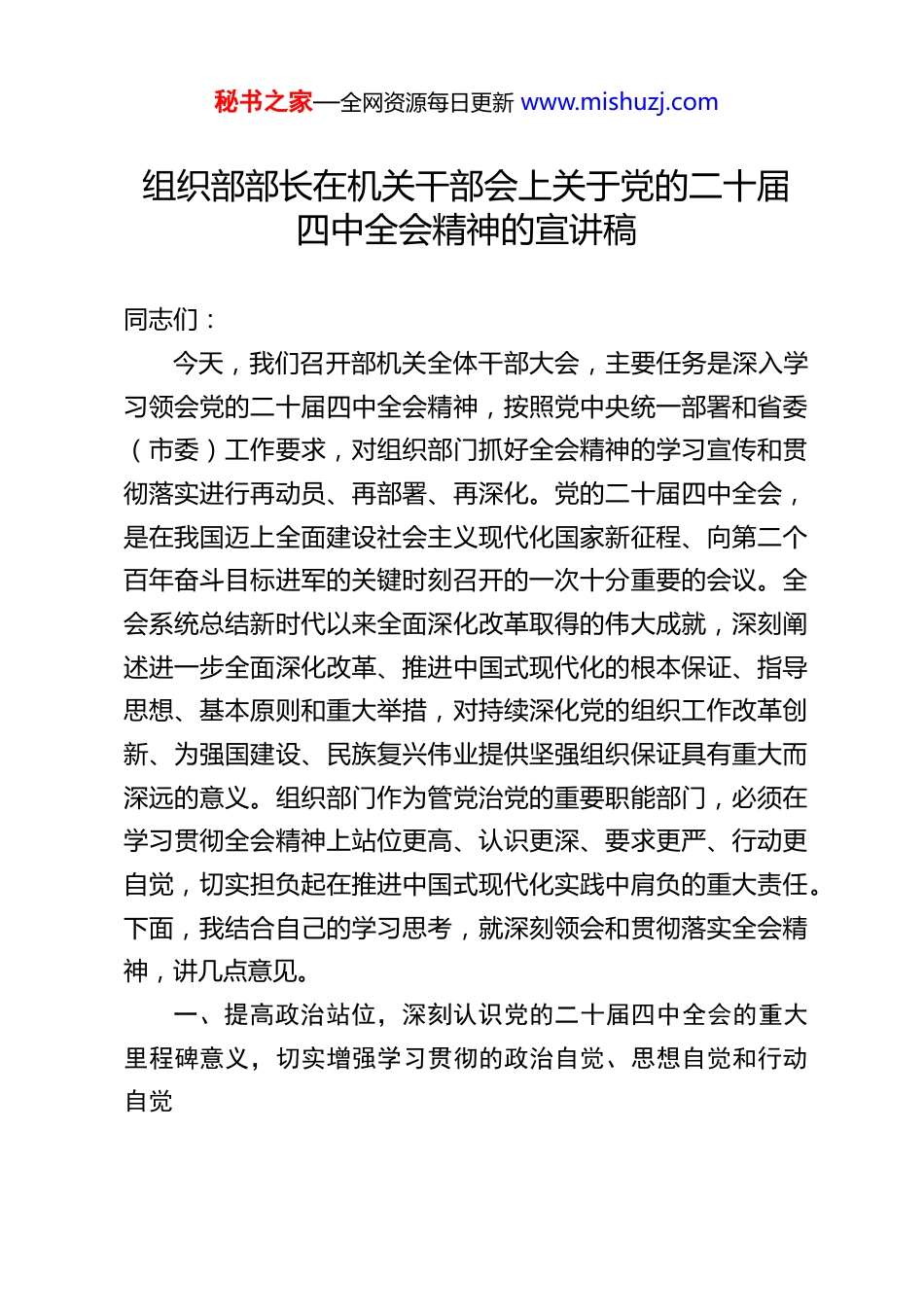 秘书之家—全网资源每日更新 www.mishuzj.com组织部部长在机关干部会上关于党的二十届四中全会精神的宣讲稿同志们:今天,我们召开部机关全体干部大会,主要任务是深入学习领会党的二十届四中全会精神,按照党中央统一部署和省委(市委)工作要求,对组织部门抓好全会精神的学习宣传和贯彻落实进行再动员、再部署、再深化。党的二十届四中全会,是在我国迈上全面建设社会主义现代化国家新征程、向第二个百年奋斗目标进军的关键时刻召开的一次十分重要的会议。全会系统总结新时代以来全面深化改革取得的伟大成就,深刻阐述进一步全面深化改革、推进中国式现代化的根本保证、指导思想、基本原则和重大举措,对持续深化党的组织工作改革创新、为强国建设、民族复兴伟业提供坚强组织保证具有重大而深远的意义。组织部门作为管党治党的重要职能部门,必须在学习贯彻全会精神上站位更高、认识更深、要求更严、行动更自觉,切实担负起在推进中国式现代化实践中肩负的重大责任。下面,我结合自己的学习思考,就深刻领会和贯彻落实全会精神,讲几点意见。一、提高政治站位,深刻认识党的二十届四中全会的重大里程碑意义,切实增强学习贯彻的政治自觉、思想自觉和行动自觉秘书之家—全网资源每日更新 www.mishuzj.com学习贯彻全会精神,首要的是深刻理解其历史地位、理论贡献和实践要求,从战略和全局高度充分认识全会的极端重要性。(一)全会擘画了新征程上全面深化改革、推进中国式现代化的宏伟蓝图。当前,世界百年未有之大变局加速演进,中华民族伟大复兴进入关键时期。面对更加复杂严峻的国际环境和艰巨繁重的国内改革发展稳定任务,如何破解发展难题、厚植发展优势,如何应对风险挑战、掌握发展主动权,是摆在我们面前的重大时代课题。党的二十届四中全会正是着眼于解决这些事关长远发展的重大理论和实践问题,对进一步全面深化改革、推进中国式现代化作出了顶层设计和战略部署。全会审议通过的重大《决定》,是指导当前和今后一个时期党和家事业发展的纲领性文件,明确了下一步改革的战略重点、主攻方向、推进方式和时间表、路线图,充分体现了党中央对改革规律认识的深化、把握的精准和运用的纯熟。学习全会精神,就是要引导全体组工干部胸怀“国之大者”,深刻认识到全面深化改革是决定当代中国命运的关键一招,也是决定中国式现代化成败的关键一招,自觉把组织工作放到党和国家事业全局中去谋划、去推进,确保组织工作始终服务于党的中心任务。(二)全会彰显了党中央将改革进行到底的坚定决心和巨大勇气。新时代以来,我们党推动的改革是全方位、深层次、根本性的,取得的成就是历史性、开创性、格局性的。但改革秘书之家—全网资源每日更新 www.mishuzj.com越深入,矛盾越凸显,触及的利益关系越复杂。党的二十届四中全会向全党全国乃至全世界释放了清晰而强烈的信号:改革开放只有进行时,没有完成时。党中央以巨大的政治勇气和智慧,瞄准制约高质量发展的堵点淤点难点,聚焦构建高水平社会主义市场经济体制、建设更高水平开放型经济新体制、推动文化繁荣发展、促进共同富裕、建设美丽中国、维护国家安全和社会稳定等重点领域,部署了一系列具有前瞻性、战略性、针对性的重大改革举措。这充分展现了我们党将改革进行到底的坚定意志,展现了中国特色社会主义制度的强大生命力和巨大优越性。组织部门学习全会精神,就是要从中汲取攻坚克难的智慧和力量,发扬刀刃向内的自我革命精神,勇于打破思维定势和路径依赖,以更大魄力、更实举措推动组织工作领域各项改革任务落地生根,不断破解组织工作面临的重点难点问题。(三)全会对健全全面从严治党体系、深入推进新时代党的建设新的伟大工程提出了新的更高要求。办好中国的事情,关键在党。推进中国式现代化,关键在党要管党、全面从严治党。全会对坚持和加强党的全面领导、健全党的领导制度体系、完善党自我革命制度规范体系等作出了新的部署,这是新时代党的建设总要求在新征程上的具体化和深化。全会强调要健全总揽全局、协调各方的党的领导制度体系,完善党中央重大决策部署落实机制,确保全党在政治立场、政治方向、政治原...