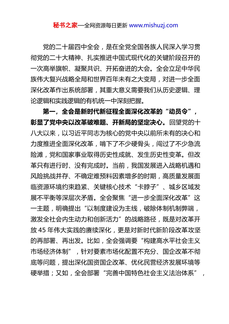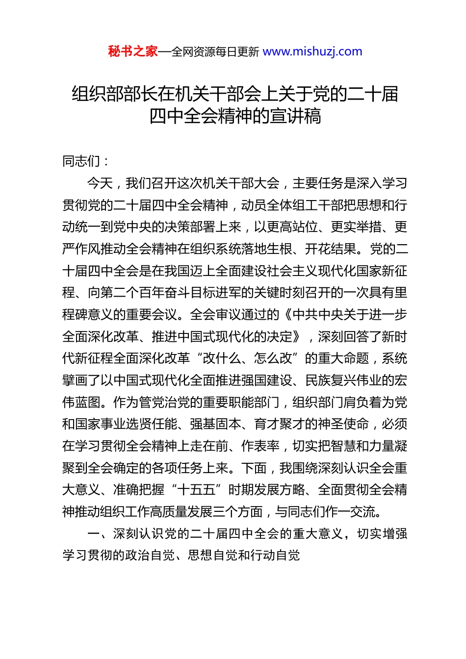 秘书之家—全网资源每日更新 www.mishuzj.com组织部部长在机关干部会上关于党的二十届四中全会精神的宣讲稿同志们:今天,我们召开这次机关干部大会,主要任务是深入学习贯彻党的二十届四中全会精神,动员全体组工干部把思想和行动统一到党中央的决策部署上来,以更高站位、更实举措、更严作风推动全会精神在组织系统落地生根、开花结果。党的二十届四中全会是在我国迈上全面建设社会主义现代化国家新征程、向第二个百年奋斗目标进军的关键时刻召开的一次具有里程碑意义的重要会议。全会审议通过的《中共中央关于进一步全面深化改革、推进中国式现代化的决定》,深刻回答了新时代新征程全面深化改革“改什么、怎么改”的重大命题,系统擘画了以中国式现代化全面推进强国建设、民族复兴伟业的宏伟蓝图。作为管党治党的重要职能部门,组织部门肩负着为党和国家事业选贤任能、强基固本、育才聚才的神圣使命,必须在学习贯彻全会精神上走在前、作表率,切实把智慧和力量凝聚到全会确定的各项任务上来。下面,我围绕深刻认识全会重大意义、准确把握“十五五”时期发展方略、全面贯彻全会精神推动组织工作高质量发展三个方面,与同志们作一交流。一、深刻认识党的二十届四中全会的重大意义,切实增强学习贯彻的政治自觉、思想自觉和行动自觉秘书之家—全网资源每日更新 www.mishuzj.com党的二十届四中全会,是在全党全国各族人民深入学习贯彻党的二十大精神、扎实推进中国式现代化的关键阶段召开的一次高举旗帜、凝聚共识、开拓奋进的大会。全会立足中华民族伟大复兴战略全局和世界百年未有之大变局,对进一步全面深化改革作出系统部署,其重大意义需要我们从历史逻辑、理论逻辑和实践逻辑的有机统一中深刻把握。第一,全会是新时代新征程全面深化改革的“动员令”,彰显了党中央以改革破难题、开新局的坚定决心。回望党的十八大以来,以习近平同志为核心的党中央以前所未有的决心和力度推进全面深化改革,啃下了不少硬骨头,闯过了不少急流险滩,党和国家事业取得历史性成就、发生历史性变革。但改革只有进行时、没有完成时。当前,我国发展进入战略机遇和风险挑战并存、不确定难预料因素增多的时期,高质量发展面临资源环境约束趋紧、关键核心技术“卡脖子”、城乡区域发展不平衡等深层次矛盾。全会聚焦“进一步全面深化改革”这一主题,明确提出“以制度建设为主线,破除体制机制弊端,激发全社会内生动力和创新活力”的战略路径,既是对改革开放 45 年伟大实践的赓续深化,更是对新时代新阶段改革攻坚的再部署、再出发。比如,全会强调要“构建高水平社会主义市场经济体制”,针对要素市场化配置不充分、国企改革不彻底等问题,提出深化国资国企改革、优化民营经济发展环境等硬举措;又如,全会部署“完善中国特色社会主义法治体系”,秘书之家—全网资源每日更新 www.mishuzj.com直指执法司法不公、基层治理短板等痛点,要求健全社会公平正义法治保障制度。这些部署不是零敲碎打的调整,而是系统性、整体性、重构性的制度创新,充分体现了党中央以改革应对变局、开拓新局的战略远见。作为组工干部,我们必须深刻认识到:改革是决定当代中国命运的关键一招,也是组织工作破解难题、提升质效的根本出路。只有学深悟透全会精神,才能在干部选拔、基层党建、人才引育等工作中主动识变、科学应变、引领求变。第二,全会是中国式现代化建设的“路线图”,标定了以制度优势推进民族复兴的实践路径。中国式现代化是中国共产党领导的社会主义现代化,其本质要求是坚持党的领导、坚持中国特色社会主义。全会深刻指出:“制度竞争是综合国力竞争的重要方面,制度优势是一个国家赢得战略主动的重要优势。”全会通过的《决定》,将中国式现代化的中国特色、本质要求和重大原则融入制度设计,从经济、政治、文化、社会、生态“五位一体”总体布局出发,构建起支撑中国式现代化的“四梁八柱”。例如,在经济领域,全会提出“加快构建新发展格局”,要求打通制约经济循环的关键堵点,这为内蒙古建设“两个屏障”“两个基地”“一个桥头堡”提供了制度指引;在社会领域,全会强调“健全基本公共...
