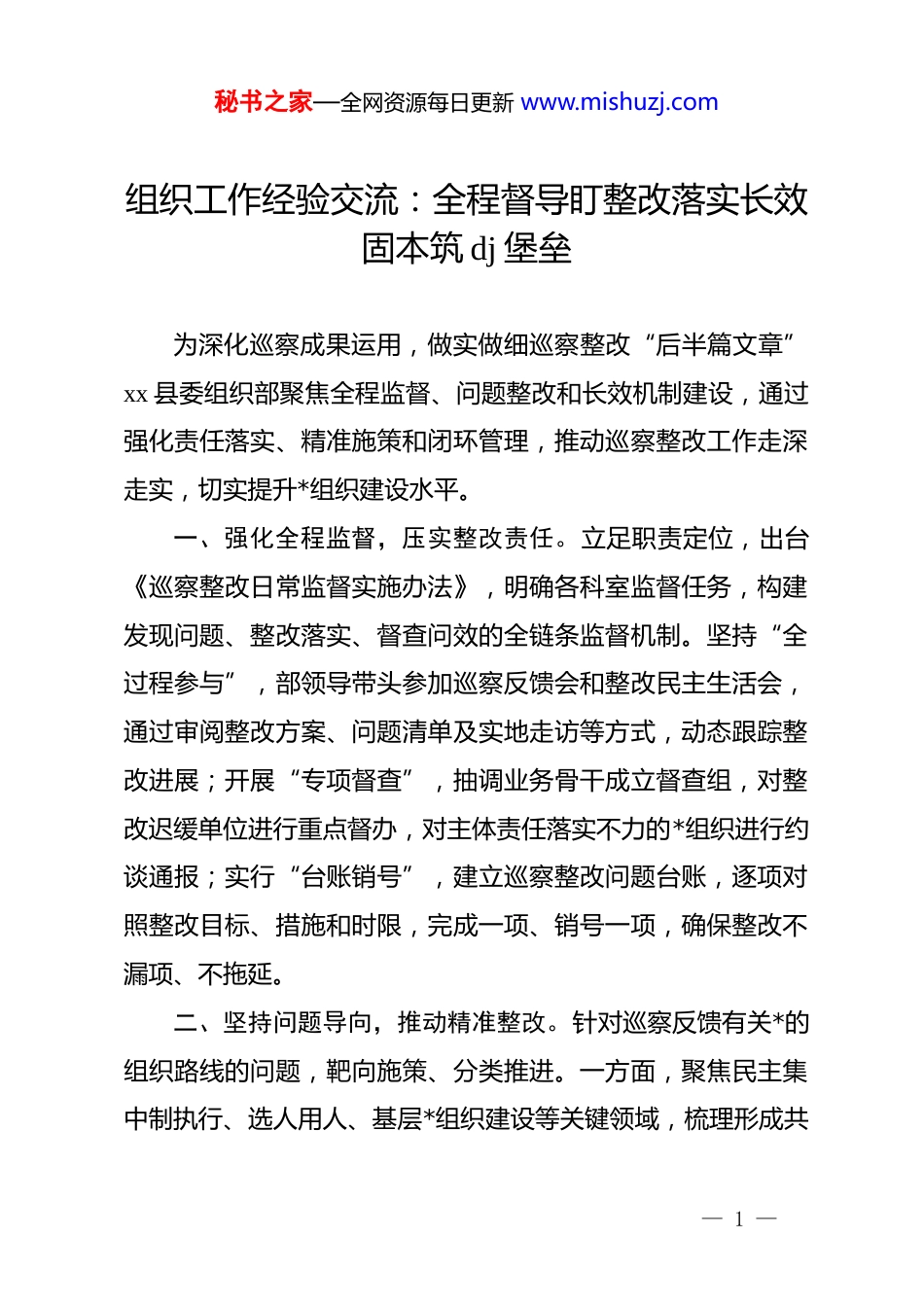 秘书之家—全网资源每日更新 www.mishuzj.com组织工作经验交流:全程督导盯整改落实长效固本筑 dj 堡垒为深化巡察成果运用,做实做细巡察整改“后半篇文章”xx 县委组织部聚焦全程监督、问题整改和长效机制建设,通过强化责任落实、精准施策和闭环管理,推动巡察整改工作走深走实,切实提升*组织建设水平。一、强化全程监督,压实整改责任。立足职责定位,出台《巡察整改日常监督实施办法》,明确各科室监督任务,构建发现问题、整改落实、督查问效的全链条监督机制。坚持“全过程参与”,部领导带头参加巡察反馈会和整改民主生活会,通过审阅整改方案、问题清单及实地走访等方式,动态跟踪整改进展;开展“专项督查”,抽调业务骨干成立督查组,对整改迟缓单位进行重点督办,对主体责任落实不力的*组织进行约谈通报;实行“台账销号”,建立巡察整改问题台账,逐项对照整改目标、措施和时限,完成一项、销号一项,确保整改不漏项、不拖延。二、坚持问题导向,推动精准整改。针对巡察反馈有关*的组织路线的问题,靶向施策、分类推进。一方面,聚焦民主集中制执行、选人用人、基层*组织建设等关键领域,梳理形成共— 1 —秘书之家—全网资源每日更新 www.mishuzj.com性问题清单,通过专项督查推动系统性整改;另一方面,针对部分个性问题,逐一制定整改方案,明确责任人和完成时限,确保问题整改“见底清零”。同时,将整改成效与干部考核、选拔任用挂钩,强化结果运用,倒逼责任落实。三、构建长效机制,推动全面提升。着力构建“三维一体”长效机制,将整改成果转化为治理效能。一是压实责任链条,明确*(工)委牵头责任、*支部书记第一责任人职责,并将整改情况纳入*组织书记述职评议考核;二是强化督导闭环,联合巡察办定期开展“整改调度”,推动立行立改与长期规划相结合;三是注重常态提升,通过创新主题*日形式、严格民主生活会程序等举措,推动基层 dj 从“整改达标”向“全面提质”转变。✂— 2 —