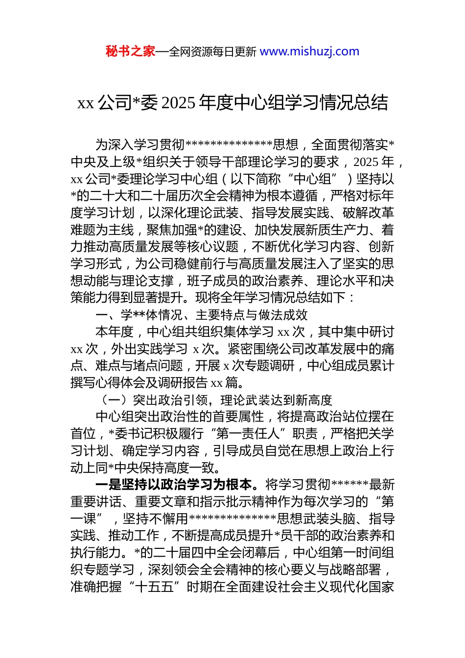 秘书之家—全网资源每日更新 www.mishuzj.comxx 公司*委 2025 年度中心组学习情况总结为深入学习贯彻**************思想,全面贯彻落实*中央及上级*组织关于领导干部理论学习的要求,2025 年,xx 公司*委理论学习中心组(以下简称“中心组”)坚持以*的二十大和二十届历次全会精神为根本遵循,严格对标年度学习计划,以深化理论武装、指导发展实践、破解改革难题为主线,聚焦加强*的建设、加快发展新质生产力、着力推动高质量发展等核心议题,不断优化学习内容、创新学习形式,为公司稳健前行与高质量发展注入了坚实的思想动能与理论支撑,班子成员的政治素养、理论水平和决策能力得到显著提升。现将全年学习情况总结如下:一、学**体情况、主要特点与做法成效本年度,中心组共组织集体学习 xx 次,其中集中研讨xx 次,外出实践学习 x 次。紧密围绕公司改革发展中的痛点、难点与堵点问题,开展 x 次专题调研,中心组成员累计撰写心得体会及调研报告 xx 篇。(一)突出政治引领,理论武装达到新高度中心组突出政治性的首要属性,将提高政治站位摆在首位,*委书记积极履行“第一责任人”职责,严格把关学习计划、确定学习内容,引导成员自觉在思想上政治上行动上同*中央保持高度一致。一是坚持以政治学习为根本。将学习贯彻******最新重要讲话、重要文章和指示批示精神作为每次学习的“第一课”,坚持不懈用**************思想武装头脑、指导实践、推动工作,不断提高成员提升*员干部的政治素养和执行能力。*的二十届四中全会闭幕后,中心组第一时间组织专题学习,深刻领会全会精神的核心要义与战略部署,准确把握“十五五”时期在全面建设社会主义现代化国家秘书之家—全网资源每日更新 www.mishuzj.com新征程中的历史方位与阶段性特征,为公司高质量完成“十四五”规划收官、高起点谋划“十五五”发展新篇凝聚了广泛共识、奠定了思想基础。二是系统学习*的创新理论。坚持将读原著、学原文、悟原理作为基本方法,全面、系统、深入地学习**************思想的核心要义与实践要求。结合公司发展实际,精心制定并严格执行年度学习计划,明确每个月的学习形式及内容。形式上,将集中领学、专题辅导、个人自学与互动研讨有机贯通,构建起多层次、立体化的学习体系。内容上,紧密围绕全面从严治*、基层*组织建设、发展新质生产力等重大理论与实践命题,确保理论学习既全面覆盖又重点突出,既对标对表又紧贴实际,不断增强学习的系统性与整体性。三是扎实开展深入贯彻中央八项规定精神学习教育。深入学习领会******关于作风建设的重要论述精神,深刻把握中央八项规定及其实施细则的时代内涵与实践要求。通过举办 x 期专题读书班,开展案例剖析与警示教育,引导成员自觉以*章*规 dj 为镜鉴,持续强化纪律意识、规矩意识。*委书记以《锲而不舍落实中央八项规定精神——踏实做人廉洁从业努力干事》为题,带头为全体*员讲授专题*课,主动分享中心组学习成果与个人思考。*课紧密围绕落实中央八项规定精神,深刻阐述了持续深化学习教育对于加强作风建设、纵深推进全面从严治*、保障公司高质量发展的重大意义,并结合公司实际,切实引导员工增强自律意识、加强自我修养、提高自控能力,将廉洁自律内化为自觉追求、外化为实际行动。(二)紧密联系实际,学用结合推动新发展中心组始终坚持理论联系实际的马克思主义学风,以公司改革发展面临的现实问题为牵引,将学习课堂延伸到经营一线、项目现场,确保理论学习与中心工作同向发力同频共振。秘书之家—全网资源每日更新 www.mishuzj.com一是精准选题学用融合。中心组紧密围绕公司年度中心任务,着力将*的创新理论与经营实践深度融合。年初,围绕公司业务与职能的战略性调整,我们重点聚焦并运用******关于*的建设的重要思想、发展新质生产力、推动高质量发展等重要论述指导工作,通过深入交流研讨,进一步明晰了公司战略定位、发展目标与核心路径,切实实现理论学习与经营实践的深度融合,为公司的顺利转型奠定了坚实基础。二是深化调研促进发展。大力弘扬“四下基层”优良传统,中心组成员带头扑下身子、沉到一线,共建立调研...