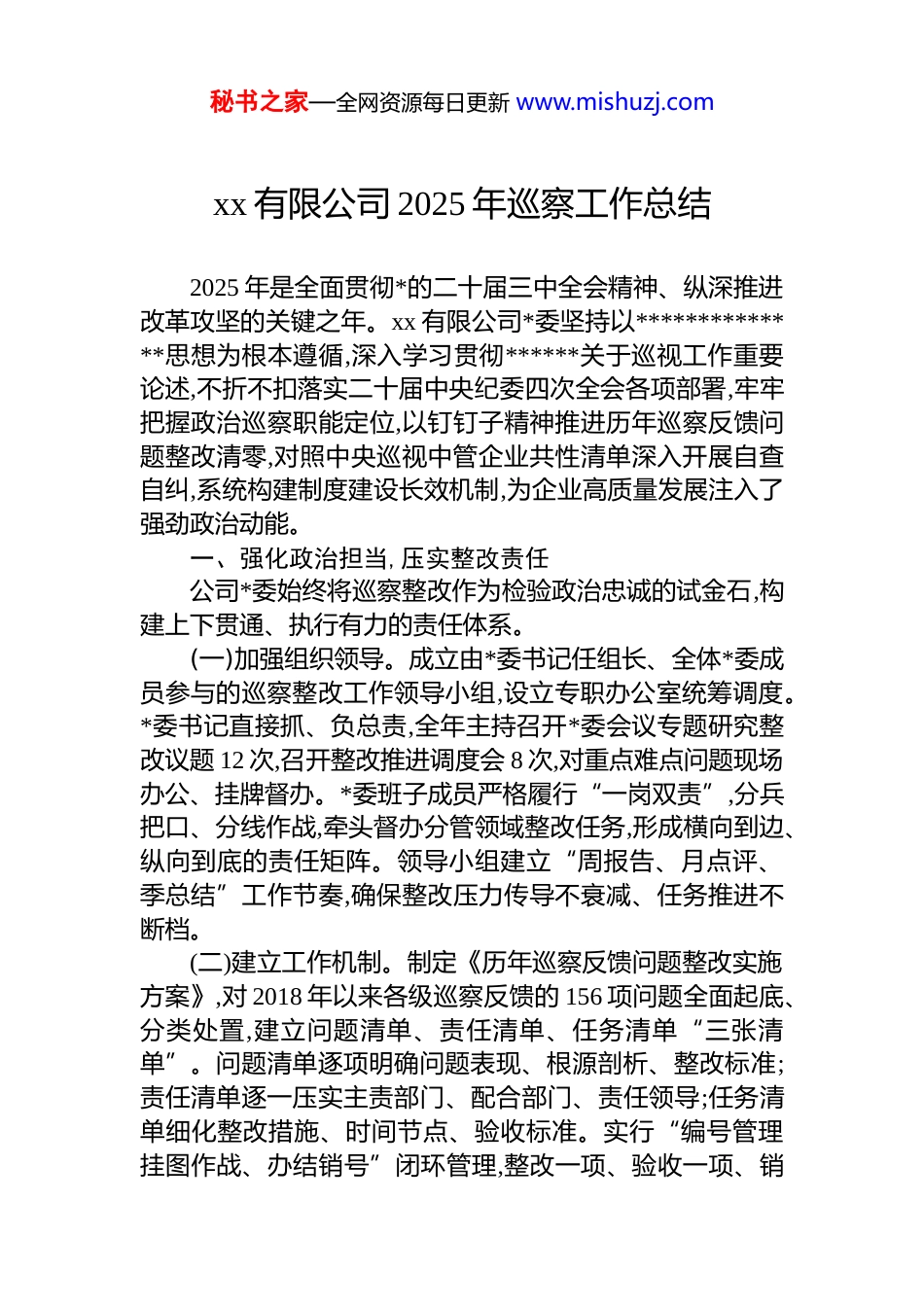 秘书之家—全网资源每日更新 www.mishuzj.comxx 有限公司 2025 年巡察工作总结2025 年是全面贯彻*的二十届三中全会精神、纵深推进改革攻坚的关键之年。xx 有限公司*委坚持以**************思想为根本遵循,深入学习贯彻******关于巡视工作重要论述,不折不扣落实二十届中央纪委四次全会各项部署,牢牢把握政治巡察职能定位,以钉钉子精神推进历年巡察反馈问题整改清零,对照中央巡视中管企业共性清单深入开展自查自纠,系统构建制度建设长效机制,为企业高质量发展注入了强劲政治动能。一、强化政治担当,压实整改责任公司*委始终将巡察整改作为检验政治忠诚的试金石,构建上下贯通、执行有力的责任体系。(一)加强组织领导。成立由*委书记任组长、全体*委成员参与的巡察整改工作领导小组,设立专职办公室统筹调度。*委书记直接抓、负总责,全年主持召开*委会议专题研究整改议题 12 次,召开整改推进调度会 8 次,对重点难点问题现场办公、挂牌督办。*委班子成员严格履行“一岗双责”,分兵把口、分线作战,牵头督办分管领域整改任务,形成横向到边、纵向到底的责任矩阵。领导小组建立“周报告、月点评、季总结”工作节奏,确保整改压力传导不衰减、任务推进不断档。(二)建立工作机制。制定《历年巡察反馈问题整改实施方案》,对 2018 年以来各级巡察反馈的 156 项问题全面起底、分类处置,建立问题清单、责任清单、任务清单“三张清单”。问题清单逐项明确问题表现、根源剖析、整改标准;责任清单逐一压实主责部门、配合部门、责任领导;任务清单细化整改措施、时间节点、验收标准。实行“编号管理挂图作战、办结销号”闭环管理,整改一项、验收一项、销秘书之家—全网资源每日更新 www.mishuzj.com号一项。全年动态更新整改台账 24 次,印发整改通报 6 期,对进度滞后事项发出督办函 15 份。(三)强化督促检查。纪委监督专项工作组嵌入整改全过程,建立整改监督“双周碰头会”制度,实时掌握整改进度,及时纠偏正向。采取“四不两直”方式,开展实地检查 6 轮次,查阅档案资料 1200 余份,个别谈话 180 余人次,对整改真实性、完整性、彻底性进行穿透式核查。重点核查整改支撑材料是否完备、整改成效是否可持续、同类问题是否复发,坚决防止纸面整改、数字整改。全年监督发现整改不到位问题38 个,约谈提醒相关部门负责人 9 人次,推动问题真改实改。二、深入自查自纠,防范系统风险坚持问题导向,将对照自查作为祛除沉疴积弊的自我革命,全面排查同类同域风险隐患。(一)对照共性问题全面排查。系统梳理中央巡视中管企业反馈的 12 个方面 36 项共性问题,结合盐业流通企业特点,制定《巡视共性问题自查自纠专项方案》。聚焦贯彻新发展理念不深入、供应链管理薄弱、市场化改革滞后、全面从严治*责任传导层层递减、基层 dj 虚化弱化等突出领域,组织总部 7 个职能部门、15 家基层单位开展拉网式自查。通过部门自查、交叉互查、专班核查三级联动,累计排查出倾向性问题 87 个,涉及决策程序不规范、合同管理有漏洞、资金监管不严格、dj 基础不扎实等类型,制定整改措施 192 条,明确整改时限和责任主体。(二)聚焦重点领域深化治理。紧盯盐产品购销、仓储物流、资产租赁、项目投资、费用报销等关键业务环节,开展“穿透式”专项检查。针对工程建设领域,重点检查项目立项、招投标、变更签证、竣工验收全过程,发现并整改违规拆分项目、比选程序不规范等问题 15 个。针对招标采购领域,核查近三年来 300 万元以上采购项目 127 个,发现并整改先定后招、围标串标等问题 12 个。针对违反中央八项规定精神问题,开展“四风”顽瘴痼疾专项治理,严查违规接待、秘书之家—全网资源每日更新 www.mishuzj.com公车私用、滥发津补贴等问题,发现并整改问题 29 个,给予 dj政纪处分 4 人,组织处理 8 人次。(三)推动问题整改见底见效。坚持分类施策、精准整改。对能够立行立改的,当场整改、当场见效,全年完成即知即改问题 53 个。对需要分阶段推进的,制定路线图、时间表,全程跟踪问效,完成阶段性整改任务 34 个。对需要长期整改的,明确阶段性目标,持续用力推进,确保年年有进展。坚持“当...