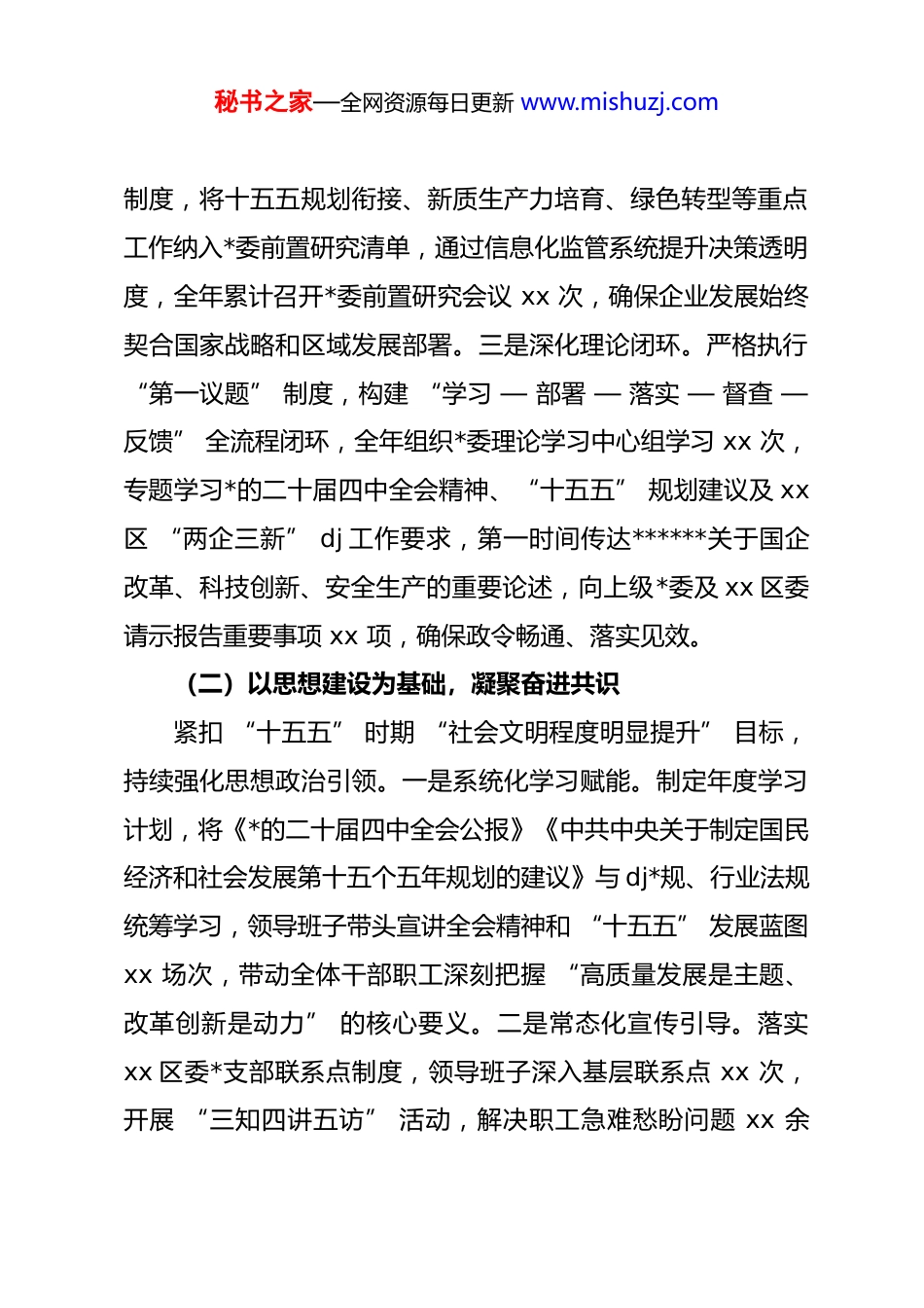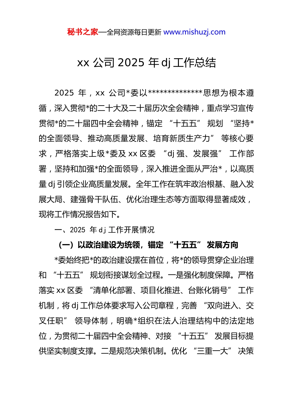 秘书之家—全网资源每日更新 www.mishuzj.comxx 公司 2025 年 dj 工作总结2025 年,xx 公司*委以**************思想为根本遵循,深入贯彻*的二十大及二十届历次全会精神,重点学习宣传贯彻*的二十届四中全会精神,锚定 “十五五” 规划 “坚持*的全面领导、推动高质量发展、培育新质生产力” 等核心要求,严格落实上级*委及 xx 区委 “dj 强、发展强” 工作部署,坚持和加强*的全面领导,深入推进全面从严治*,以高质量 dj 引领企业高质量发展。全年工作在筑牢政治根基、融入发展大局、建强骨干队伍、优化治理生态等方面取得显著成效,现将工作情况报告如下。一、2025 年 dj 工作开展情况(一)以政治建设为统领,锚定 “十五五” 发展方向*委始终把*的政治建设摆在首位,将*的领导贯穿企业治理和 “十五五” 规划衔接谋划全过程。一是强化制度保障。严格落实 xx 区委 “清单化部署、项目化推进、台账化销号” 工作机制,将 dj 工作总体要求写入公司章程,完善 “双向进入、交叉任职” 领导体制,明确*组织在法人治理结构中的法定地位,为贯彻二十届四中全会精神、对接 “十五五” 发展目标提供坚实制度支撑。二是规范决策机制。优化 “三重一大” 决策秘书之家—全网资源每日更新 www.mishuzj.com制度,将十五五规划衔接、新质生产力培育、绿色转型等重点工作纳入*委前置研究清单,通过信息化监管系统提升决策透明度,全年累计召开*委前置研究会议 xx 次,确保企业发展始终契合国家战略和区域发展部署。三是深化理论闭环。严格执行“第一议题” 制度,构建 “学习 — 部署 — 落实 — 督查 —反馈” 全流程闭环,全年组织*委理论学习中心组学习 xx 次,专题学习*的二十届四中全会精神、“十五五” 规划建议及 xx区 “两企三新” dj 工作要求,第一时间传达******关于国企改革、科技创新、安全生产的重要论述,向上级*委及 xx 区委请示报告重要事项 xx 项,确保政令畅通、落实见效。(二)以思想建设为基础,凝聚奋进共识紧扣 “十五五” 时期 “社会文明程度明显提升” 目标,持续强化思想政治引领。一是系统化学习赋能。制定年度学习计划,将《*的二十届四中全会公报》《中共中央关于制定国民经济和社会发展第十五个五年规划的建议》与 dj*规、行业法规统筹学习,领导班子带头宣讲全会精神和 “十五五” 发展蓝图xx 场次,带动全体干部职工深刻把握 “高质量发展是主题、改革创新是动力” 的核心要义。二是常态化宣传引导。落实xx 区委*支部联系点制度,领导班子深入基层联系点 xx 次,开展 “三知四讲五访” 活动,解决职工急难愁盼问题 xx 余秘书之家—全网资源每日更新 www.mishuzj.com项;压实意识形态工作责任制,强化网络舆情监控,牢牢掌握意识形态工作主动权。三是本地化品牌传播。围绕安全生产、技术创新等中心工作,对接 xx 区 “最美系列” 评选活动,选树先进典型 xx 名,全年对内发布宣传稿件 xx 篇,对外在市区主流媒体发稿 xx 篇,既展示企业践行 “十五五” 绿色发展理念的实践成效,也助力区域 dj 品牌建设。(三)以组织建设为抓手,筑牢基层堡垒对标 xx 区 “两企三新” dj “两个覆盖” 提质要求,着力提升基层*组织组织力。一是打造特色 dj 品牌。深化 “xx 先锋” dj 品牌建设,借鉴 xx 区 “行业联建 + 区域统建” 模式,联合上下游企业*组织开展共建活动 xx 次;聚焦 “十五五” 安全发展要求,推进《“dj + 安全” 打造平安 xx》重点项目,由*委书记牵头落实,确保 dj 与生产经营深度融合。二是提升支部建设水平。实施 “头雁培育” 工程,组织*支部书记参加 xx 区新兴领域*务工作者专题培训 xx 人次,推行 “清单化管理、项目化推进”,围绕 “四强” *支部创建目标,细化 20 项重点任务、44 项具体举措,推动支部工作从 “有形覆盖” 向 “有效覆盖” 转型。三是激发*员先锋作用。开展“*员先锋岗”“*员技术攻关小组” 等活动 80 余次,聚焦“十五五” 科技自立自强要求,组织*员在智能化改造、绿...
