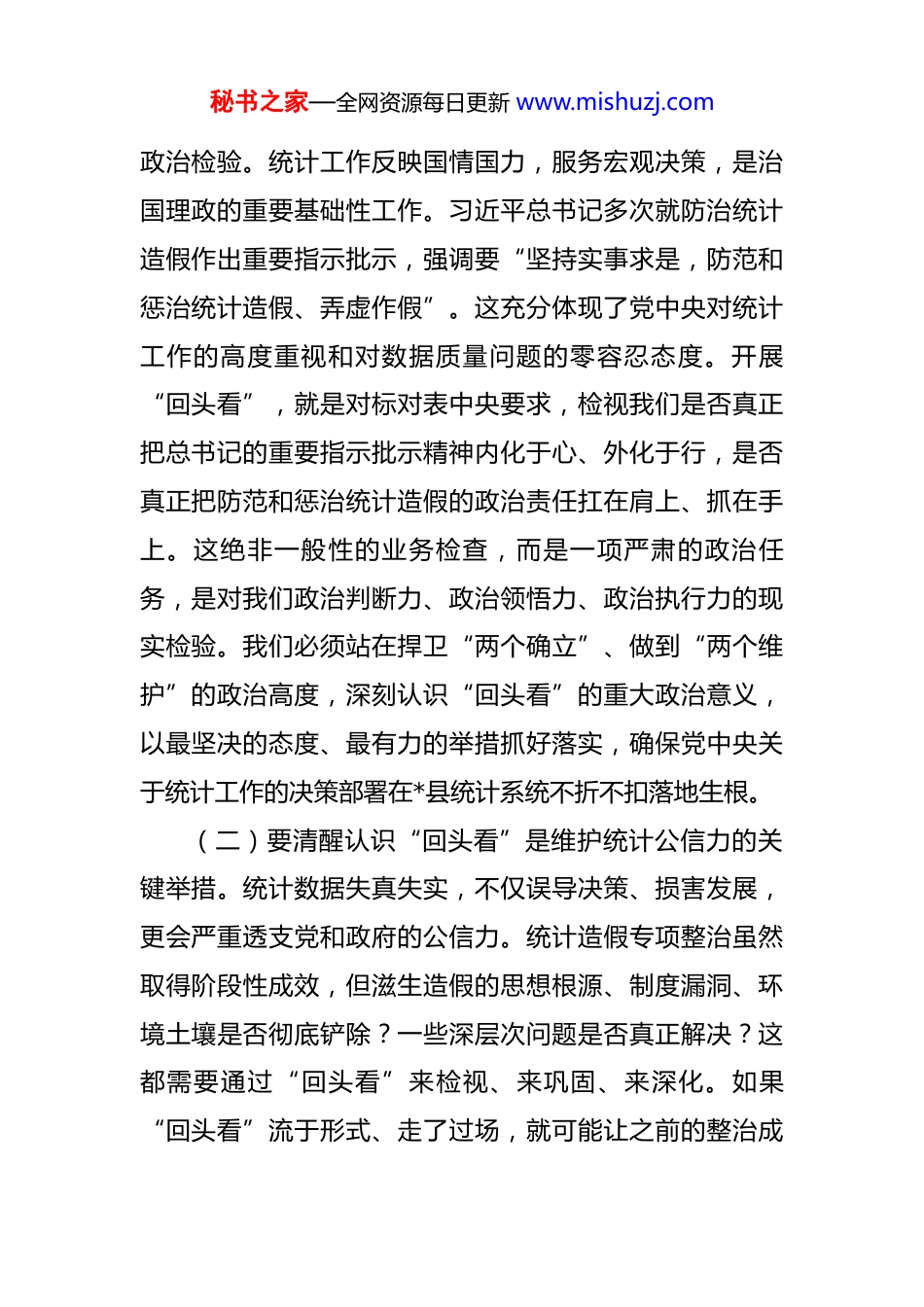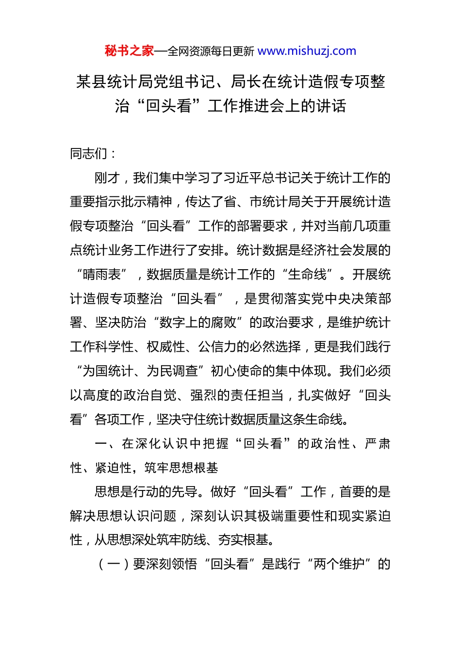 秘书之家—全网资源每日更新 www.mishuzj.com某县统计局党组书记、局长在统计造假专项整治“回头看”工作推进会上的讲话 同志们:刚才,我们集中学习了习近平总书记关于统计工作的重要指示批示精神,传达了省、市统计局关于开展统计造假专项整治“回头看”工作的部署要求,并对当前几项重点统计业务工作进行了安排。统计数据是经济社会发展的“晴雨表”,数据质量是统计工作的“生命线”。开展统计造假专项整治“回头看”,是贯彻落实党中央决策部署、坚决防治“数字上的腐败”的政治要求,是维护统计工作科学性、权威性、公信力的必然选择,更是我们践行“为国统计、为民调查”初心使命的集中体现。我们必须以高度的政治自觉、强烈的责任担当,扎实做好“回头看”各项工作,坚决守住统计数据质量这条生命线。一、在深化认识中把握“回头看”的政治性、严肃性、紧迫性,筑牢思想根基思想是行动的先导。做好“回头看”工作,首要的是解决思想认识问题,深刻认识其极端重要性和现实紧迫性,从思想深处筑牢防线、夯实根基。(一)要深刻领悟“回头看”是践行“两个维护”的秘书之家—全网资源每日更新 www.mishuzj.com政治检验。统计工作反映国情国力,服务宏观决策,是治国理政的重要基础性工作。习近平总书记多次就防治统计造假作出重要指示批示,强调要“坚持实事求是,防范和惩治统计造假、弄虚作假”。这充分体现了党中央对统计工作的高度重视和对数据质量问题的零容忍态度。开展“回头看”,就是对标对表中央要求,检视我们是否真正把总书记的重要指示批示精神内化于心、外化于行,是否真正把防范和惩治统计造假的政治责任扛在肩上、抓在手上。这绝非一般性的业务检查,而是一项严肃的政治任务,是对我们政治判断力、政治领悟力、政治执行力的现实检验。我们必须站在捍卫“两个确立”、做到“两个维护”的政治高度,深刻认识“回头看”的重大政治意义,以最坚决的态度、最有力的举措抓好落实,确保党中央关于统计工作的决策部署在*县统计系统不折不扣落地生根。(二)要清醒认识“回头看”是维护统计公信力的关键举措。统计数据失真失实,不仅误导决策、损害发展,更会严重透支党和政府的公信力。统计造假专项整治虽然取得阶段性成效,但滋生造假的思想根源、制度漏洞、环境土壤是否彻底铲除?一些深层次问题是否真正解决?这都需要通过“回头看”来检视、来巩固、来深化。如果“回头看”流于形式、走了过场,就可能让之前的整治成秘书之家—全网资源每日更新 www.mishuzj.com果付之东流,甚至产生“破窗效应”,导致问题反弹回潮、愈演愈烈。我们必须深刻认识到,统计公信力来之不易,毁之却易如反掌。唯有以“回头看”为契机,真查实改、深挖根源、堵塞漏洞,才能持续净化统计生态,真正擦亮统计这块“金字招牌”,让统计数据经得起历史、实践和人民的检验。(三)要准确把握“回头看”是提升统计治理效能的迫切需要。统计造假问题,表面看是数据失真,深层次反映的是统计治理体系和治理能力存在短板。比如,源头数据质量控制机制是否健全?统计执法监督的刚性约束是否有力?统计方法制度是否科学完善?基层基础是否牢固?这些问题都需要在“回头看”中深入检视。开展“回头看”,就是要坚持问题导向,聚焦统计工作的薄弱环节和风险点,通过“查、改、立、树”,不仅解决当前存在的突出问题,更要着眼长远,健全完善防范统计造假的长效机制,推动统计治理体系和治理能力现代化。这既是巩固拓展专项整治成果的必然要求,也是推动我县统计事业高质量发展的内在需要。我们必须把“回头看”作为提升统计工作整体水平的重要契机,以查促改、以改促建、以建促治,不断提升统计工作的科学性、规范性和权威性。二、在精准施策中聚焦“查、改、立、树”四个关秘书之家—全网资源每日更新 www.mishuzj.com键,确保“回头看”走深走实“回头看”工作,重在精准,贵在实效。必须严格按照“查、改、立、树”的要求,环环相扣、步步深入,确保问题找得准、整改落得实、机制建得牢、新风树得好。(一)要在“查”字上下功夫,做到深挖细究、不留死角。“查”是基础,查得深才能改得实。...
