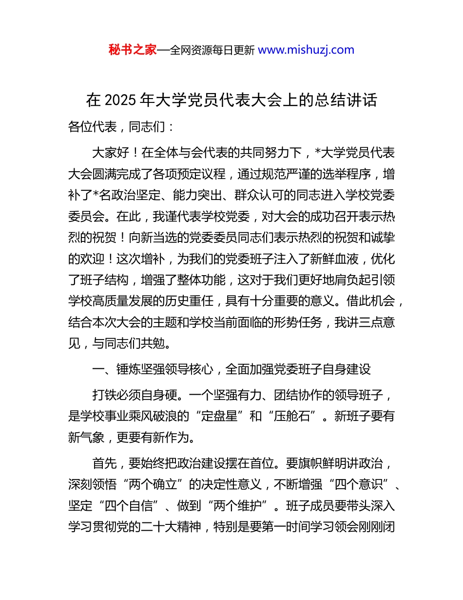 秘书之家—全网资源每日更新 www.mishuzj.com在 2025 年大学党员代表大会上的总结讲话各位代表,同志们:大家好!在全体与会代表的共同努力下,*大学党员代表大会圆满完成了各项预定议程,通过规范严谨的选举程序,增补了*名政治坚定、能力突出、群众认可的同志进入学校党委委员会。在此,我谨代表学校党委,对大会的成功召开表示热烈的祝贺!向新当选的党委委员同志们表示热烈的祝贺和诚挚的欢迎!这次增补,为我们的党委班子注入了新鲜血液,优化了班子结构,增强了整体功能,这对于我们更好地肩负起引领学校高质量发展的历史重任,具有十分重要的意义。借此机会,结合本次大会的主题和学校当前面临的形势任务,我讲三点意见,与同志们共勉。一、锤炼坚强领导核心,全面加强党委班子自身建设打铁必须自身硬。一个坚强有力、团结协作的领导班子,是学校事业乘风破浪的“定盘星”和“压舱石”。新班子要有新气象,更要有新作为。首先,要始终把政治建设摆在首位。要旗帜鲜明讲政治,深刻领悟“两个确立”的决定性意义,不断增强“四个意识”、坚定“四个自信”、做到“两个维护”。班子成员要带头深入学习贯彻党的二十大精神,特别是要第一时间学习领会刚刚闭秘书之家—全网资源每日更新 www.mishuzj.com幕的二十届四中全会精神,准确把握党中央关于进一步全面深化改革、推进中国式现代化建设的宏伟蓝图和战略部署,自觉将学校的发展置于党和国家事业发展全局中去思考、去谋划、去推动,确保学校始终成为坚持党的领导的坚强阵地。其次,要着力锻造过硬能力本领。当前,高等教育竞争日趋激烈,新一轮科技革命和产业变革加速演进,对大学的治理能力提出了前所未有的挑战。班子成员必须强化本领恐慌意识,带头加强学习和实践,不断提升战略思维、改革攻坚、驾驭风险的能力。要善于从政治上看问题,善于从规律上办教育,既要懂党建,也要懂业务,成为抓党建和促发展的行家里手。要坚持民主集中制,既要充分发扬民主,广开言路、集思广益,又要善于正确集中,科学决策、果断执行,形成心往一处想、劲往一处使的强大合力。最后,要坚定不移恪守清正廉洁。班子成员要带头扛起全面从严治党的主体责任,严于律己、严负其责、严管所辖。要带头遵守党章党规党纪,敬畏权力、管好权力、慎用权力,习惯在监督和约束下工作生活。要大力弘扬求真务实、真抓实干的作风,力戒形式主义、官僚主义,把全部心思和精力用在为师生办实事、为学校谋发展上,以班子的清风正气涵养全校的优良校风、教风和学风。二、夯实坚固战斗堡垒,系统加强学校党的组织建设秘书之家—全网资源每日更新 www.mishuzj.com学校党委的领导力,最终要通过覆盖全校的严密组织体系和坚强战斗堡垒来体现。加强校党委建设,必须在服务学校中心工作、推动事业发展中找到结合点和着力点。一方面,要以高质量党建迎接发展大考。回顾过去,在学校党委的坚强领导下,全校上下团结一心,攻坚克难,取得了一系列令人振奋的成绩。特别是在 2024 年度的*省普通高校综合考核中,我们连续第四年荣获“第一等次”的优异成绩,这充分证明了我们党建引领发展的路径是正确的、有效的。当前,正值学校“十五五”规划的收官冲刺之年,规划中确立的人才培养质量提升、科研创新能力突破、高水平师资队伍建设等关键指标已进入决胜阶段。我们要以此次高校评估取得的成绩为新起点,全面对标“十五五”规划目标,查缺补漏,精准发力。各级党组织要将规划完成情况作为检验党建成效的“试金石”,把党的政治优势、组织优势转化为推动规划目标全面实现的强大发展优势。另一方面,要以体系化思维筑牢基层基础。要持续推进基层党组织标准化、规范化建设,巩固拓展“党建工作示范高校”“标杆院系”“样板支部”的创建成果让每一个支部都成为坚强的战斗堡垒,让每一名党员都成为一面鲜艳的旗帜。要深入实施“青年教师党员发展计划”,不断优化党员队伍结构。要将党建工作与教学科研、学生管理、社会服务等深度融合,秘书之家—全网资源每日更新 www.mishuzj.com破解“两张皮”问题,推动党建工作与中心工作同频共振、同向发力,确保党的路线方针政策在学...
