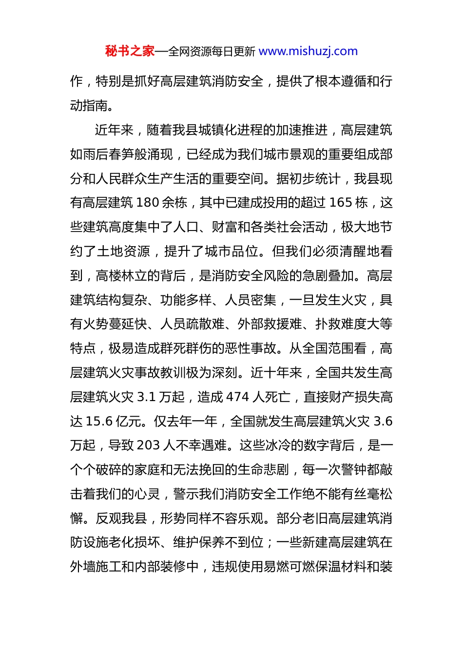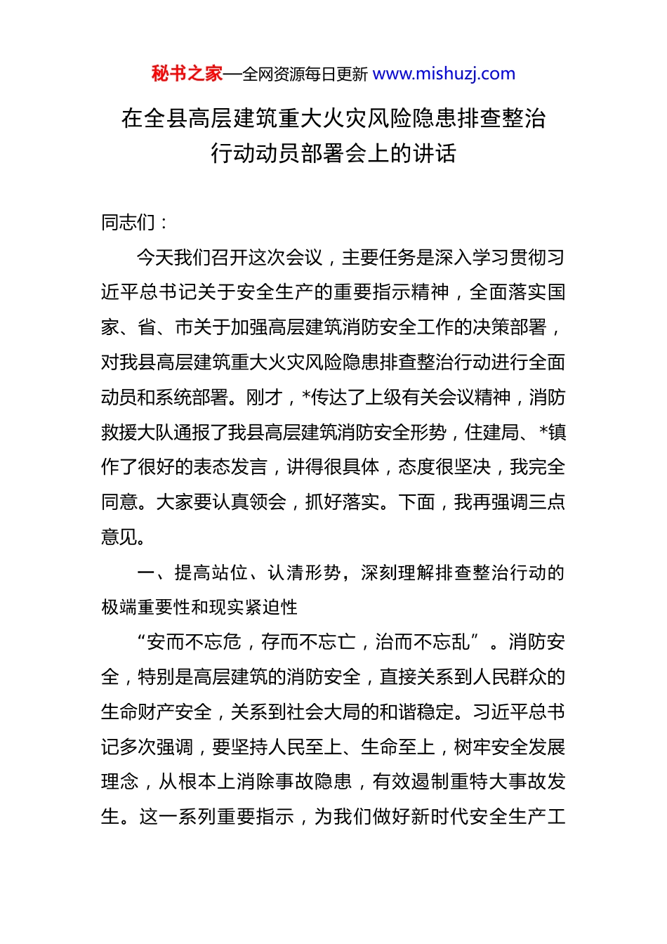 秘书之家—全网资源每日更新 www.mishuzj.com在全县高层建筑重大火灾风险隐患排查整治行动动员部署会上的讲话 同志们:今天我们召开这次会议,主要任务是深入学习贯彻习近平总书记关于安全生产的重要指示精神,全面落实国家、省、市关于加强高层建筑消防安全工作的决策部署,对我县高层建筑重大火灾风险隐患排查整治行动进行全面动员和系统部署。刚才,*传达了上级有关会议精神,消防救援大队通报了我县高层建筑消防安全形势,住建局、*镇作了很好的表态发言,讲得很具体,态度很坚决,我完全同意。大家要认真领会,抓好落实。下面,我再强调三点意见。一、提高站位、认清形势,深刻理解排查整治行动的极端重要性和现实紧迫性“安而不忘危,存而不忘亡,治而不忘乱”。消防安全,特别是高层建筑的消防安全,直接关系到人民群众的生命财产安全,关系到社会大局的和谐稳定。习近平总书记多次强调,要坚持人民至上、生命至上,树牢安全发展理念,从根本上消除事故隐患,有效遏制重特大事故发生。这一系列重要指示,为我们做好新时代安全生产工秘书之家—全网资源每日更新 www.mishuzj.com作,特别是抓好高层建筑消防安全,提供了根本遵循和行动指南。近年来,随着我县城镇化进程的加速推进,高层建筑如雨后春笋般涌现,已经成为我们城市景观的重要组成部分和人民群众生产生活的重要空间。据初步统计,我县现有高层建筑 180 余栋,其中已建成投用的超过 165 栋,这些建筑高度集中了人口、财富和各类社会活动,极大地节约了土地资源,提升了城市品位。但我们必须清醒地看到,高楼林立的背后,是消防安全风险的急剧叠加。高层建筑结构复杂、功能多样、人员密集,一旦发生火灾,具有火势蔓延快、人员疏散难、外部救援难、扑救难度大等特点,极易造成群死群伤的恶性事故。从全国范围看,高层建筑火灾事故教训极为深刻。近十年来,全国共发生高层建筑火灾 3.1 万起,造成 474 人死亡,直接财产损失高达 15.6 亿元。仅去年一年,全国就发生高层建筑火灾 3.6万起,导致 203 人不幸遇难。这些冰冷的数字背后,是一个个破碎的家庭和无法挽回的生命悲剧,每一次警钟都敲击着我们的心灵,警示我们消防安全工作绝不能有丝毫松懈。反观我县,形势同样不容乐观。部分老旧高层建筑消防设施老化损坏、维护保养不到位;一些新建高层建筑在外墙施工和内部装修中,违规使用易燃可燃保温材料和装秘书之家—全网资源每日更新 www.mishuzj.com饰材料,留下了“先天性”火患;在日常管理中,消防车通道被占用、疏散楼梯间被堵塞、常闭式防火门敞开、电动自行车违规停放充电等“后天性”问题屡见不鲜。这些问题就像一颗颗埋在我们身边的“定时炸弹”,随时可能引爆。我们必须以“时时放心不下”的责任感和“事事落实到位”的执行力,深刻认识到开展此次排查整治行动,既是贯彻上级决策部署的政治任务,也是回应群众安全关切的民生工程,更是保障我县高质量发展的底线要求。全县各级各部门必须坚决摒弃麻痹思想、侥幸心理和松劲心态,把思想和行动统一到县委、县政府的决策部署上来,以最坚决的态度、最严格的要求、最扎实的举措,迅速投入到这场攻坚战中,坚决守住消防安全的红线和底线。二、聚焦重点、精准发力,以铁的措施全面彻底排查整治风险隐患本次排查整治行动时间紧、任务重、要求高,绝不能搞形式、走过场。必须坚持问题导向、目标导向、结果导向,突出重点领域和关键环节,做到全覆盖、无死角、动真格、求实效。(一)要紧盯“两个重点”,做到排查整治全覆盖。此次行动的核心任务,就是聚焦两大类重点对象。一是聚焦在建项目。重点排查正在进行外墙施工和内部装修的高秘书之家—全网资源每日更新 www.mishuzj.com层建筑。住建、消防等部门要联合执法,对施工现场消防安全责任制是否落实、外墙保温和室内装饰材料防火性能是否符合《建筑设计防火规范》和《建筑防火通用规范》等国家标准、动火动焊等特殊作业审批和现场监护措施是否到位、临时消防设施是否按规定设置等情况进行“过筛式”检查。凡是发现使用不合格材料的,一律责令停工整改,并依法追究相关单位和人员的责任。二是聚...