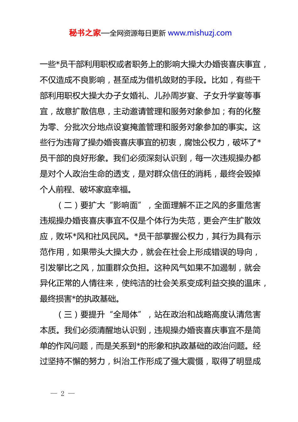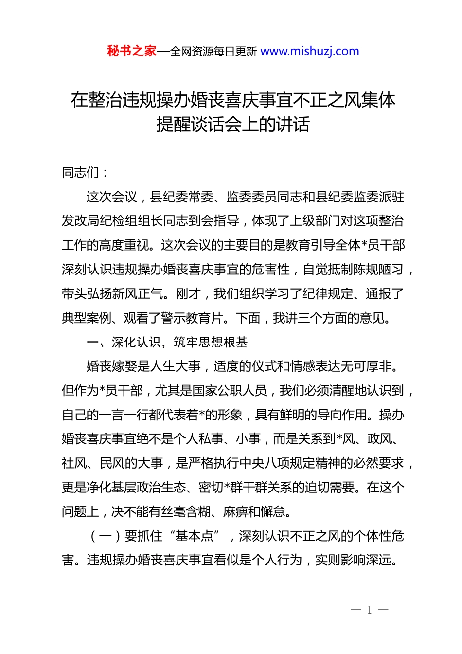 秘书之家—全网资源每日更新 www.mishuzj.com在整治违规操办婚丧喜庆事宜不正之风集体提醒谈话会上的讲话同志们:这次会议,县纪委常委、监委委员同志和县纪委监委派驻发改局纪检组组长同志到会指导,体现了上级部门对这项整治工作的高度重视。这次会议的主要目的是教育引导全体*员干部深刻认识违规操办婚丧喜庆事宜的危害性,自觉抵制陈规陋习,带头弘扬新风正气。刚才,我们组织学习了纪律规定、通报了典型案例、观看了警示教育片。下面,我讲三个方面的意见。一、深化认识,筑牢思想根基婚丧嫁娶是人生大事,适度的仪式和情感表达无可厚非。但作为*员干部,尤其是国家公职人员,我们必须清醒地认识到,自己的一言一行都代表着*的形象,具有鲜明的导向作用。操办婚丧喜庆事宜绝不是个人私事、小事,而是关系到*风、政风、社风、民风的大事,是严格执行中央八项规定精神的必然要求,更是净化基层政治生态、密切*群干群关系的迫切需要。在这个问题上,决不能有丝毫含糊、麻痹和懈怠。(一)要抓住“基本点”,深刻认识不正之风的个体性危害。违规操办婚丧喜庆事宜看似是个人行为,实则影响深远。— 1 —秘书之家—全网资源每日更新 www.mishuzj.com一些*员干部利用职权或者职务上的影响大操大办婚丧喜庆事宜,不仅造成不良影响,甚至成为借机敛财的手段。比如,有些干部利用职权大操大办子女婚礼、儿孙周岁宴、子女升学宴等事宜,故意扩散信息,主动邀请管理和服务对象参加;有的化整为零、分批次分地点设宴掩盖管理和服务对象参加的事实。这些行为违背了操办婚丧喜庆事宜的初衷,腐蚀公权力,破坏了*员干部的良好形象。我们必须深刻认识到,每一次违规操办都是对个人政治生命的透支,是对群众信任的消耗,最终会毁掉个人前程、破坏家庭幸福。(二)要扩大“影响面”,全面理解不正之风的多重危害违规操办婚丧喜庆事宜不仅是个体行为失范,更会产生扩散效应,败坏*风和社风民风。*员干部掌握公权力,其行为具有示范作用,如果带头大操大办,就会在社会上形成错误的导向,引发攀比之风,加重群众负担。这种风气如果不加遏制,就会异化正常的人情往来,使纯洁的社会关系变成利益交换的温床,最终损害*的执政基础。(三)要提升“全局体”,站在政治和战略高度认清危害本质。我们必须清醒地认识到,违规操办婚丧喜庆事宜不是简单的作风问题,而是关系到*的形象和执政基础的政治问题。经过坚持不懈的努力,纠治工作形成了强大震慑,取得了明显成— 2 —秘书之家—全网资源每日更新 www.mishuzj.com效。但也要看到,*员干部违规操办婚丧喜庆问题顽固复杂、树倒根存,背后的“面子文化”、利益驱动依然存在。比如,昆明市政协原保留副厅级待遇干部李河流在任多个职务期间,先后违规操办儿子婚宴、孙女“百日宴”,收受多名管理和服务对象所送礼金,借机敛财。这种案件不仅影响当地政治生态,更给*的事业造成严重损害。因此,我们必须站在维护*的形象、巩固*的执政基础的高度,坚决刹住这股不正之风。二、严守规矩,划清行为边界没有规矩,不成方圆。整治违规操办婚丧喜庆事宜,必须坚持制度先行,明确政策界限,让*员干部知道什么可为、什么不可为。各地区各部门结合实际建立健全了相关制度,对*员干部操办婚丧喜庆事项的规模、范围、报备程序等作出规定。这些规定对*员干部既是约束,也是保护,为*员干部操办婚丧喜庆事宜划出了“硬杠杠”。(一)要筑牢“预防线”,严格执行事前报备事后报告制度。事前申报、事后报告是规范婚丧喜庆事宜的第一道关口。领导干部组织或参与操办本人及直系亲属的喜庆事宜,以及办理丧事时,必须带头移风易俗、倡导文明新风,坚持从简节约、反对铺张浪费,严格控制规模和范围。操办喜庆事宜,要根据当地要求提前申报,说明办理事由、时间、地点、规模、标准— 3 —秘书之家—全网资源每日更新 www.mishuzj.com和邀请对象,事后要及时报告。对结婚宴请事项男女双方合并办理、分开办理或按家乡习俗分批宴请情况,需如实报告办理总桌数。办理丧事应根据当地要求在办理前以适当形式向所在单位报告。绝不允许隐瞒不报、先办后报或虚假报告。(二)要设...