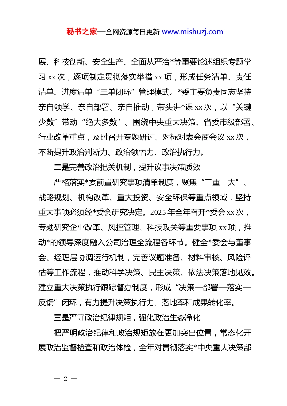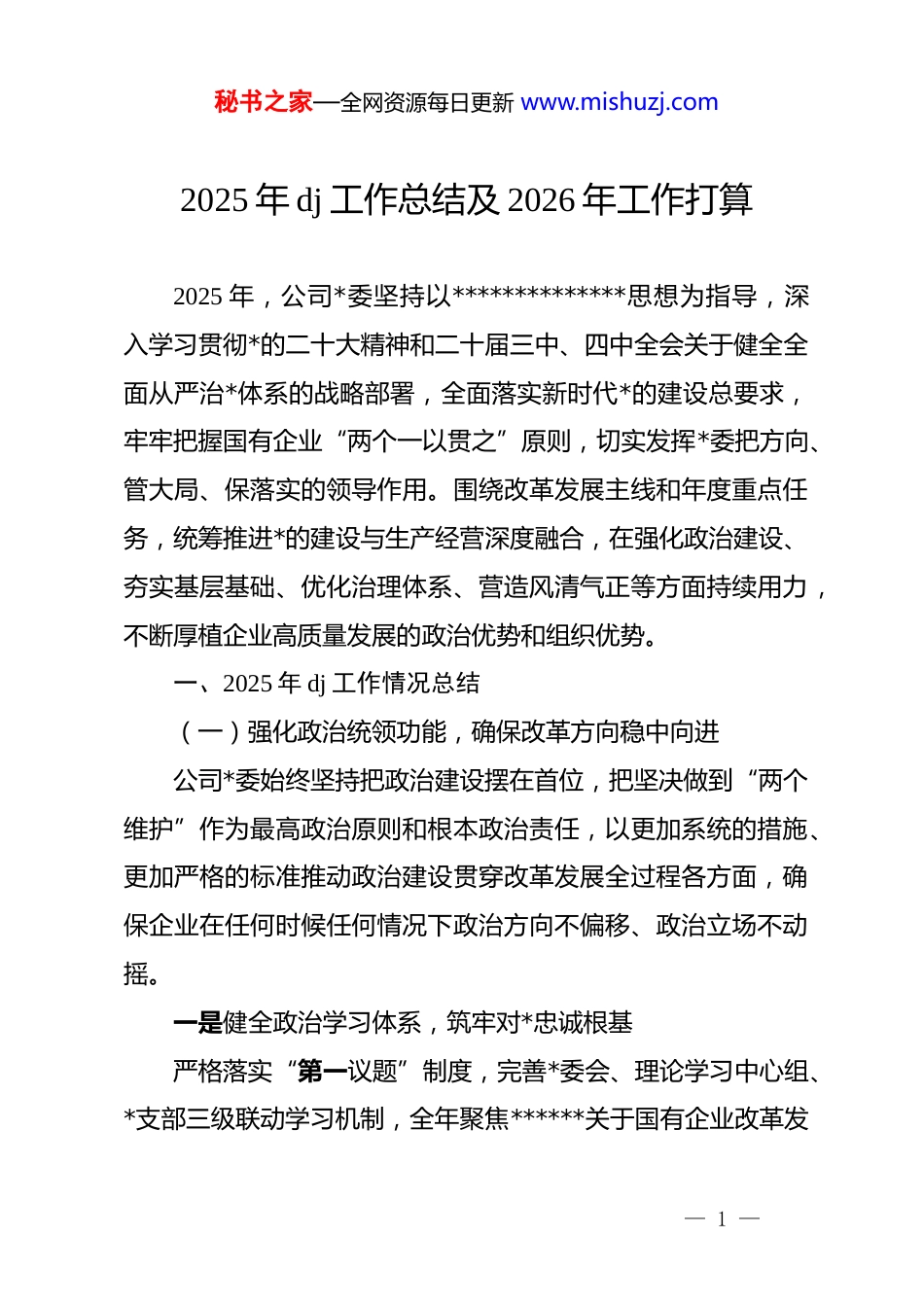 秘书之家—全网资源每日更新 www.mishuzj.com2025 年 dj 工作总结及 2026 年工作打算2025 年,公司*委坚持以**************思想为指导,深入学习贯彻*的二十大精神和二十届三中、四中全会关于健全全面从严治*体系的战略部署,全面落实新时代*的建设总要求,牢牢把握国有企业“两个一以贯之”原则,切实发挥*委把方向、管大局、保落实的领导作用。围绕改革发展主线和年度重点任务,统筹推进*的建设与生产经营深度融合,在强化政治建设、夯实基层基础、优化治理体系、营造风清气正等方面持续用力,不断厚植企业高质量发展的政治优势和组织优势。一、2025 年 dj 工作情况总结(一)强化政治统领功能,确保改革方向稳中向进公司*委始终坚持把政治建设摆在首位,把坚决做到“两个维护”作为最高政治原则和根本政治责任,以更加系统的措施、更加严格的标准推动政治建设贯穿改革发展全过程各方面,确保企业在任何时候任何情况下政治方向不偏移、政治立场不动摇。一是健全政治学习体系,筑牢对*忠诚根基严格落实“第一议题”制度,完善*委会、理论学习中心组、*支部三级联动学习机制,全年聚焦******关于国有企业改革发— 1 —秘书之家—全网资源每日更新 www.mishuzj.com展、科技创新、安全生产、全面从严治*等重要论述组织专题学习 xx 次,逐项制定贯彻落实举措 xx 项,形成任务清单、责任清单、进度清单“三单闭环”管理模式。*委主要负责同志坚持亲自领学、亲自部署、亲自推动,带头讲*课 xx 次,以“关键少数”带动“绝大多数”。围绕中央重大决策、省委市级部署、行业改革重点,及时召开专题研讨、对标对表会商会议 xx 次,不断提升政治判断力、政治领悟力、政治执行力。二是完善政治把关机制,提升议事决策质效严格落实*委前置研究事项清单制度,聚焦“三重一大”、战略规划、机构改革、重大投资、安全环保等重点领域,坚持重大事项必须经*委会研究决定。2025 年全年召开*委会 xx 次,专题研究企业改革、风控管理、科技攻关等重要事项 xx 项,推动*的领导深度融入公司治理全流程各环节。健全*委会与董事会、经理层协调运行机制,完善议题准备、材料审核、风险评估等工作流程,推动科学决策、民主决策、依法决策落地见效。建立重大决策执行跟踪督办制度,形成“决策—部署—落实—反馈”闭环,有力提升决策执行力、落地率和成果转化率。三是严守政治纪律规矩,强化政治生态净化把严明政治纪律和政治规矩放在更加突出位置,常态化开展政治监督检查和政治体检,全年对贯彻落实*中央重大决策部— 2 —秘书之家—全网资源每日更新 www.mishuzj.com署、落实企业改革政策、防范化解重大风险等情况开展专项监督 xx 次,向*委会报告政治监督情况 xx 次。开展政治纪律教育、警示教育、专题辅导 xx 场,覆盖*员干部 xx 人次,通过典型案例剖析、以案促改、以案促治,督促*员干部始终守住政治红线。严格落实民主生活会、组织生活会制度,对班子成员和基层书记抓好政治建设情况开展“双述双评”,不断增强各级*组织政治功能、组织功能,使政治生态持续向上向好。(二)深化思想理论淬炼,汇聚改革发展奋进力量公司*委把牢抓思想理论武装作为根本性、基础性、长远性工作,坚持不懈用**************思想凝心铸魂,把深化学习、深化理解、深化转化贯穿全年,持续强化理论引领、精神引领、方向引领,为企业改革攻坚、转型发展提供强有力的思想动力和精神支撑。一是抓实理论学习示范,提升思想政治能力严格落实*委理论学习中心组学习制度,紧扣国资国企改革深化提升行动、新质生产力培育、科技创新体系构建、能源资源安全等重大课题,全年开展集体学习 xx 次、交流研讨 xx 次;紧密结合企业发展实际,形成高质量调研报告 xx 篇、对策建议xx 条。创新“中心组+专家辅导+现场观摩”联动学习机制,邀请行业专家、科研院所学者作专题辅导 xx 场,提升各级领导— 3 —秘书之家—全网资源每日更新 www.mishuzj.com干部理论思维、战略思维、底线思维能力。对基层*组织开展学习质量督导抽查 xx 轮次,推动理论学习从“学了没有”向“学得如何”转变、从“...