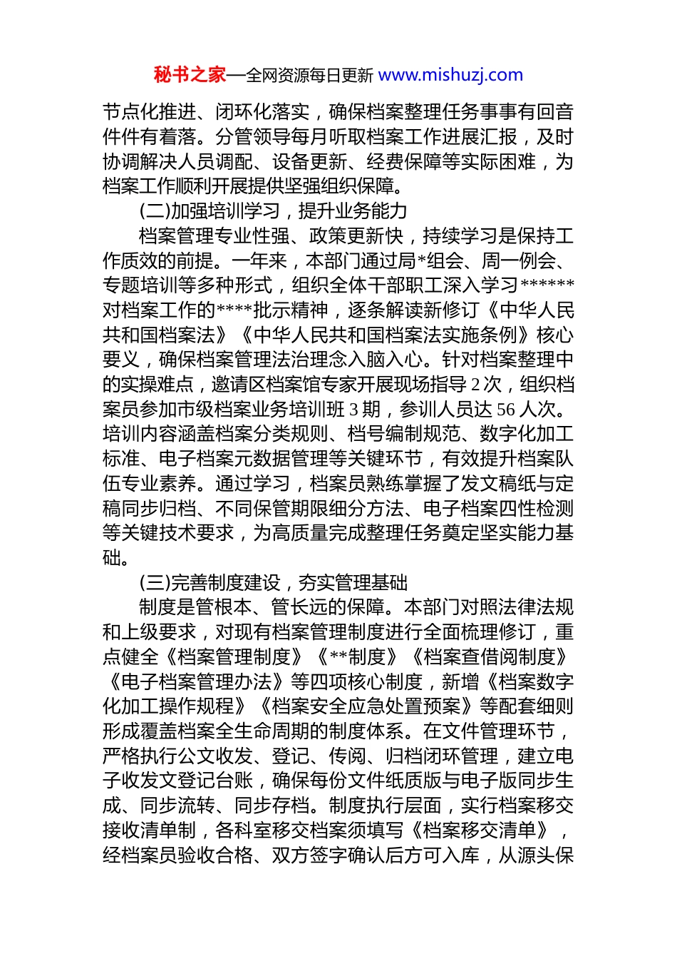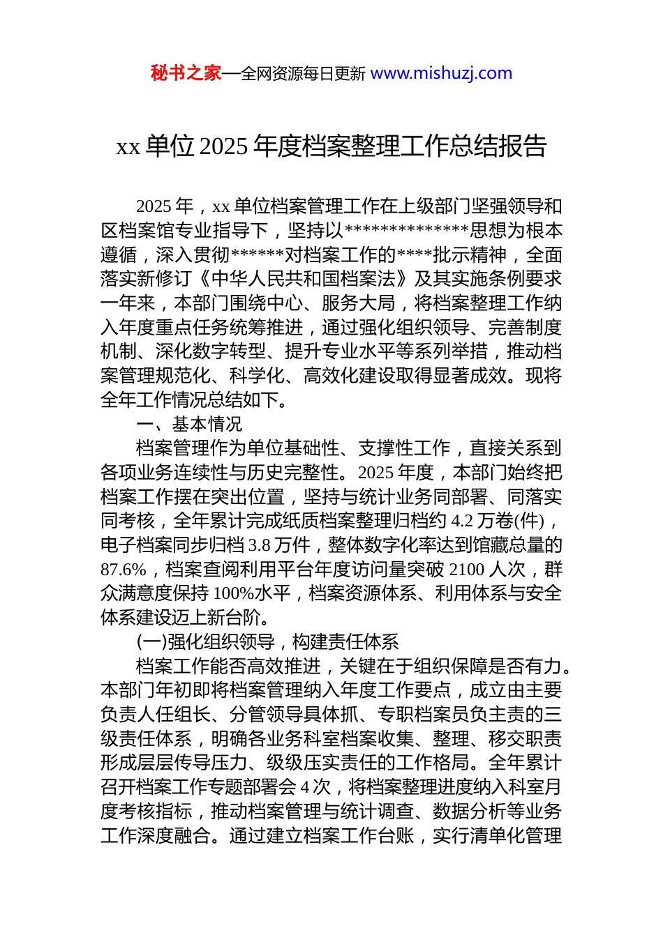 秘书之家—全网资源每日更新 www.mishuzj.comxx 单位 2025 年度档案整理工作总结报告2025 年,xx 单位档案管理工作在上级部门坚强领导和区档案馆专业指导下,坚持以**************思想为根本遵循,深入贯彻******对档案工作的****批示精神,全面落实新修订《中华人民共和国档案法》及其实施条例要求一年来,本部门围绕中心、服务大局,将档案整理工作纳入年度重点任务统筹推进,通过强化组织领导、完善制度机制、深化数字转型、提升专业水平等系列举措,推动档案管理规范化、科学化、高效化建设取得显著成效。现将全年工作情况总结如下。一、基本情况档案管理作为单位基础性、支撑性工作,直接关系到各项业务连续性与历史完整性。2025 年度,本部门始终把档案工作摆在突出位置,坚持与统计业务同部署、同落实同考核,全年累计完成纸质档案整理归档约 4.2 万卷(件),电子档案同步归档 3.8 万件,整体数字化率达到馆藏总量的87.6%,档案查阅利用平台年度访问量突破 2100 人次,群众满意度保持 100%水平,档案资源体系、利用体系与安全体系建设迈上新台阶。(一)强化组织领导,构建责任体系档案工作能否高效推进,关键在于组织保障是否有力。本部门年初即将档案管理纳入年度工作要点,成立由主要负责人任组长、分管领导具体抓、专职档案员负主责的三级责任体系,明确各业务科室档案收集、整理、移交职责形成层层传导压力、级级压实责任的工作格局。全年累计召开档案工作专题部署会 4 次,将档案整理进度纳入科室月度考核指标,推动档案管理与统计调查、数据分析等业务工作深度融合。通过建立档案工作台账,实行清单化管理秘书之家—全网资源每日更新 www.mishuzj.com节点化推进、闭环化落实,确保档案整理任务事事有回音件件有着落。分管领导每月听取档案工作进展汇报,及时协调解决人员调配、设备更新、经费保障等实际困难,为档案工作顺利开展提供坚强组织保障。(二)加强培训学习,提升业务能力档案管理专业性强、政策更新快,持续学习是保持工作质效的前提。一年来,本部门通过局*组会、周一例会、专题培训等多种形式,组织全体干部职工深入学习******对档案工作的****批示精神,逐条解读新修订《中华人民共和国档案法》《中华人民共和国档案法实施条例》核心要义,确保档案管理法治理念入脑入心。针对档案整理中的实操难点,邀请区档案馆专家开展现场指导 2 次,组织档案员参加市级档案业务培训班 3 期,参训人员达 56 人次。培训内容涵盖档案分类规则、档号编制规范、数字化加工标准、电子档案元数据管理等关键环节,有效提升档案队伍专业素养。通过学习,档案员熟练掌握了发文稿纸与定稿同步归档、不同保管期限细分方法、电子档案四性检测等关键技术要求,为高质量完成整理任务奠定坚实能力基础。(三)完善制度建设,夯实管理基础制度是管根本、管长远的保障。本部门对照法律法规和上级要求,对现有档案管理制度进行全面梳理修订,重点健全《档案管理制度》《**制度》《档案查借阅制度》《电子档案管理办法》等四项核心制度,新增《档案数字化加工操作规程》《档案安全应急处置预案》等配套细则形成覆盖档案全生命周期的制度体系。在文件管理环节,严格执行公文收发、登记、传阅、归档闭环管理,建立电子收发文登记台账,确保每份文件纸质版与电子版同步生成、同步流转、同步存档。制度执行层面,实行档案移交接收清单制,各科室移交档案须填写《档案移交清单》,经档案员验收合格、双方签字确认后方可入库,从源头保秘书之家—全网资源每日更新 www.mishuzj.com证归档资料完整性。全年累计修订制度条款 23 条,新增操作规范 5 项,档案工作制度化、规范化水平显著提升。(四)推进数字化转型,提升管理效能数字化是档案工作高质量发展的必由之路。2025 年,本部门将档案数字化作为“一把手”工程,投入专项经费45 万元,采购高速扫描仪、档案管理软件、服务器等设备,建成独立档案数字加工室,配备 3 名专职人员负责数字化加工。截至 2025 年 11 月底,累计完成纸质档案数字化扫描3.2 万卷又 8.5 万件,生成高清图像 236 万页,占馆藏档...