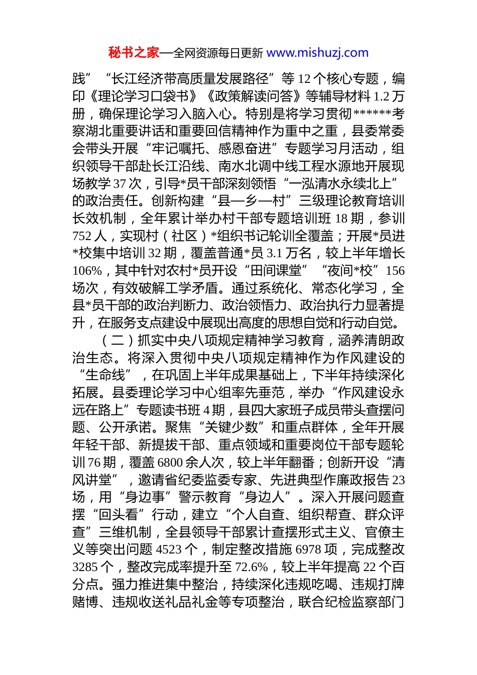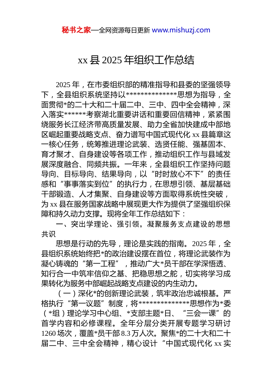 秘书之家—全网资源每日更新 www.mishuzj.comxx 县 2025 年组织工作总结2025 年,在市委组织部的精准指导和县委的坚强领导下,全县组织系统坚持以**************思想为指导,全面贯彻*的二十大和二十届二中、三中、四中全会精神,深入落实******考察湖北重要讲话和重要回信精神,紧紧围绕服务长江经济带高质量发展、助力全省加快建成中部地区崛起重要战略支点、奋力谱写中国式现代化 xx 县篇章这一核心任务,统筹推进理论武装、选贤任能、强基固本、育才聚才、自身建设等各项工作,推动组织工作与县域发展深度融合、同频共振。一年来,全县组织工作坚持问题导向、目标导向、结果导向,以“时时放心不下”的责任感和“事事落实到位”的执行力,在思想引领、基层基础干部锻造、人才集聚、自身建设等方面取得系统性突破,为 xx 县在服务国家战略中展现更大作为提供了坚强组织保障和持久动力支撑。现将全年工作总结如下:一、突出学理论、强引领,凝聚服务支点建设的思想共识思想是行动的先导,理论是实践的指南。2025 年,全县组织系统始终把*的政治建设摆在首位,将理论武装作为凝心铸魂的“第一工程”,推动广大*员干部在学深悟透、知行合一中筑牢信仰之基、把稳思想之舵,切实将学习成果转化为服务中部崛起战略支点建设的内生动力。(一)深化*的创新理论武装,筑牢政治忠诚根基。严格执行“第一议题”制度,将**************思想作为*委(*组)理论学习中心组、*支部主题*日、“三会一课”的首学内容和必修课程。全年分层分类开展专题学习研讨1260 场次,覆盖*员干部 8.3 万人次。聚焦*的二十大和二十届二中、三中全会精神,精心设计“中国式现代化 xx 实秘书之家—全网资源每日更新 www.mishuzj.com践”“长江经济带高质量发展路径”等 12 个核心专题,编印《理论学习口袋书》《政策解读问答》等辅导材料 1.2 万册,确保理论学习入脑入心。特别是将学习贯彻******考察湖北重要讲话和重要回信精神作为重中之重,县委常委会带头开展“牢记嘱托、感恩奋进”专题学习月活动,组织领导干部赴长江沿线、南水北调中线工程水源地开展现场教学 37 次,引导*员干部深刻领悟“一泓清水永续北上”的政治责任。创新构建“县—乡—村”三级理论教育培训长效机制,全年累计举办村干部专题培训班 18 期,参训752 人,实现村(社区)*组织书记轮训全覆盖;开展*员进*校集中培训 32 期,覆盖普通*员 3.1 万名,较上半年增长106%,其中针对农村*员开设“田间课堂”“夜间*校”156场次,有效破解工学矛盾。通过系统化、常态化学习,全县*员干部的政治判断力、政治领悟力、政治执行力显著提升,在服务支点建设中展现出高度的思想自觉和行动自觉。(二)抓实中央八项规定精神学习教育,涵养清朗政治生态。将深入贯彻中央八项规定精神作为作风建设的“生命线”,在巩固上半年成果基础上,下半年持续深化拓展。县委理论学习中心组率先垂范,举办“作风建设永远在路上”专题读书班 4 期,县四大家班子成员带头查摆问题、公开承诺。聚焦“关键少数”和重点群体,全年开展年轻干部、新提拔干部、重点领域和重要岗位干部专题轮训 76 期,覆盖 6800 余人次,较上半年翻番;创新开设“清风讲堂”,邀请省纪委监委专家、先进典型作廉政报告 23场,用“身边事”警示教育“身边人”。深入开展问题查摆“回头看”行动,建立“个人自查、组织帮查、群众评查”三维机制,全县领导干部累计查摆形式主义、官僚主义等突出问题 4523 个,制定整改措施 6978 项,完成整改3285 个,整改完成率提升至 72.6%,较上半年提高 22 个百分点。强力推进集中整治,持续深化违规吃喝、违规打牌赌博、违规收送礼品礼金等专项整治,联合纪检监察部门秘书之家—全网资源每日更新 www.mishuzj.com开展明察暗访 48 次,查处问题线索 31 件,处理干部 27 人;推动各级*组织常态化开展廉政谈话 2.4 万余人次,实现科级以上干部全覆盖。全年信访举报量同比下降 34%,群众对干部作风满意度达 96.7%,风清气正的政治生态为服务支点建设提供了坚实保障。(三)深化“干部素质提升年”活动...