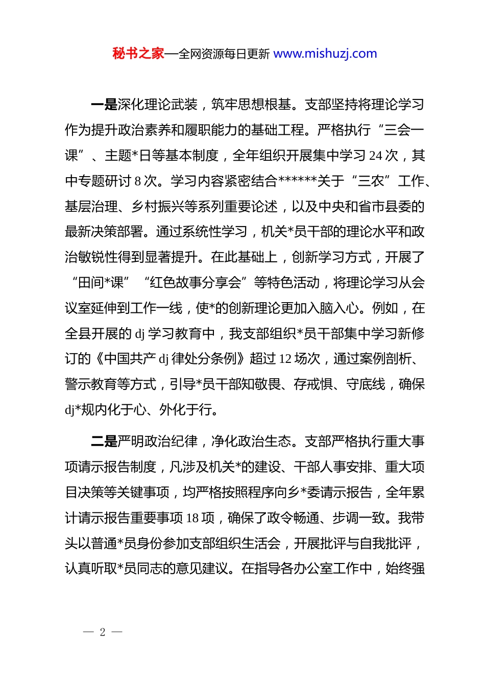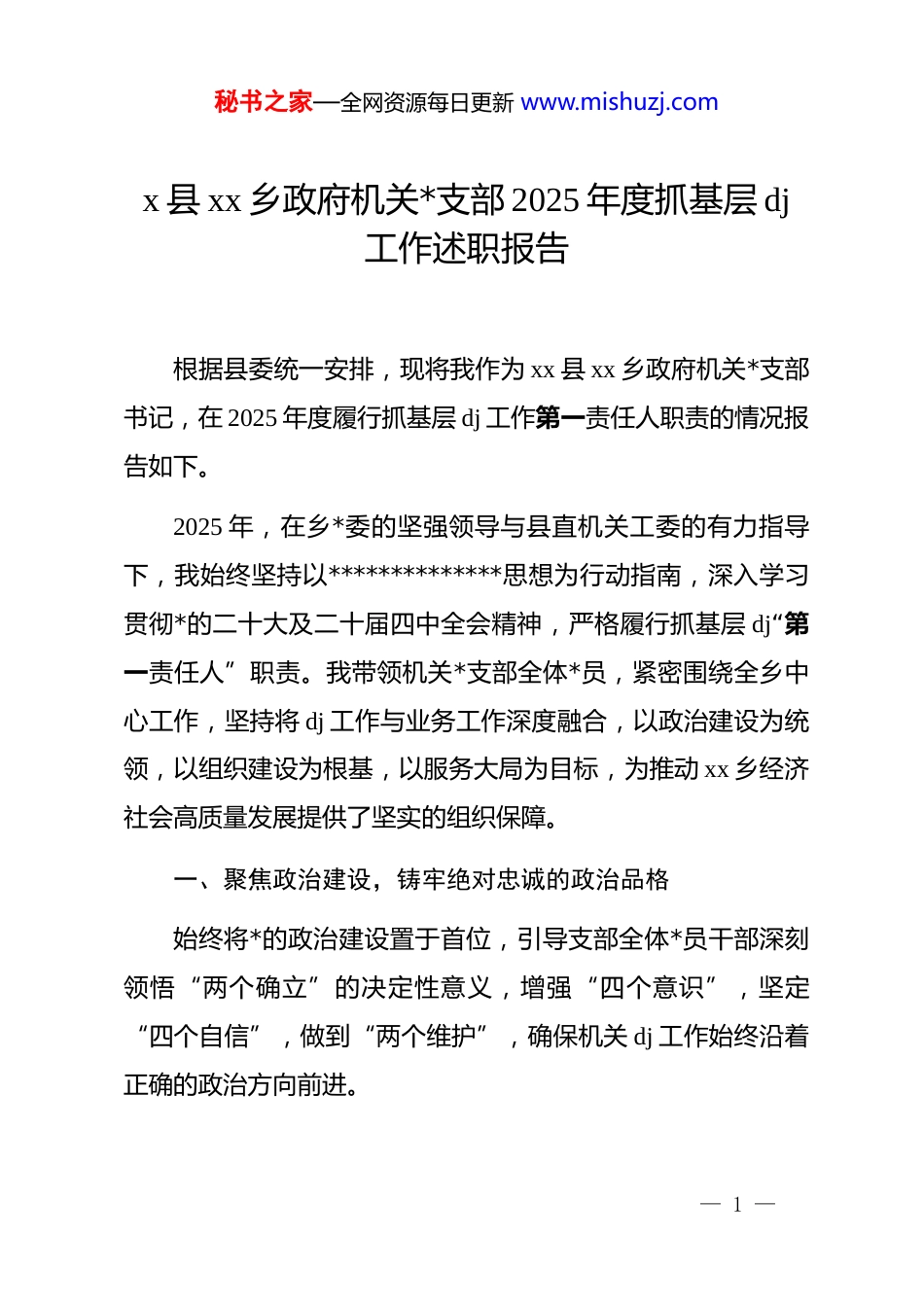 秘书之家—全网资源每日更新 www.mishuzj.comx 县 xx 乡政府机关*支部 2025 年度抓基层 dj工作述职报告根据县委统一安排,现将我作为 xx 县 xx 乡政府机关*支部书记,在 2025 年度履行抓基层 dj 工作第一责任人职责的情况报告如下。2025 年,在乡*委的坚强领导与县直机关工委的有力指导下,我始终坚持以**************思想为行动指南,深入学习贯彻*的二十大及二十届四中全会精神,严格履行抓基层 dj“第一责任人”职责。我带领机关*支部全体*员,紧密围绕全乡中心工作,坚持将 dj 工作与业务工作深度融合,以政治建设为统领,以组织建设为根基,以服务大局为目标,为推动 xx 乡经济社会高质量发展提供了坚实的组织保障。一、聚焦政治建设,铸牢绝对忠诚的政治品格始终将*的政治建设置于首位,引导支部全体*员干部深刻领悟“两个确立”的决定性意义,增强“四个意识”,坚定“四个自信”,做到“两个维护”,确保机关 dj 工作始终沿着正确的政治方向前进。— 1 —秘书之家—全网资源每日更新 www.mishuzj.com一是深化理论武装,筑牢思想根基。支部坚持将理论学习作为提升政治素养和履职能力的基础工程。严格执行“三会一课”、主题*日等基本制度,全年组织开展集中学习 24 次,其中专题研讨 8 次。学习内容紧密结合******关于“三农”工作、基层治理、乡村振兴等系列重要论述,以及中央和省市县委的最新决策部署。通过系统性学习,机关*员干部的理论水平和政治敏锐性得到显著提升。在此基础上,创新学习方式,开展了“田间*课”“红色故事分享会”等特色活动,将理论学习从会议室延伸到工作一线,使*的创新理论更加入脑入心。例如,在全县开展的 dj 学习教育中,我支部组织*员干部集中学习新修订的《中国共产 dj 律处分条例》超过 12 场次,通过案例剖析、警示教育等方式,引导*员干部知敬畏、存戒惧、守底线,确保dj*规内化于心、外化于行。二是严明政治纪律,净化政治生态。支部严格执行重大事项请示报告制度,凡涉及机关*的建设、干部人事安排、重大项目决策等关键事项,均严格按照程序向乡*委请示报告,全年累计请示报告重要事项 18 项,确保了政令畅通、步调一致。我带头以普通*员身份参加支部组织生活会,开展批评与自我批评,认真听取*员同志的意见建议。在指导各办公室工作中,始终强— 2 —秘书之家—全网资源每日更新 www.mishuzj.com调政治纪律和政治规矩,确保机关各项工作都体现*的要求、贯彻*的意图。通过常态化的政治体检和*性锻炼,机关内部形成了讲政治、顾大局、守纪律的浓厚氛围。三是强化政治引领,服务中心工作。支部自觉将 dj 工作融入全乡发展大局,充分发挥在重大任务中的政治引领和保障作用。在推进农村集体产权制度改革、人居环境整治、重点项目建设等关键工作中,组织机关*员成立攻坚小组,冲锋在前。特别是在规范村级重大事务决策方面,我支部*员干部积极下沉到村,指导各村严格落实“四议两公开”制度。根据不完全统计,2025 年,机关*员干部指导和参与审核备案的村级重大事务决策事项超过 80 件,有效确保了村级权力在阳光下运行,维护了群众的切身利益,从源头上预防了基层“微腐败”的发生,巩固了*在农村的执政根基。二、聚焦组织建设,夯实坚强有力的战斗堡垒坚持大抓基层的鲜明导向,以提升组织力为重点,持续推进*支部标准化、规范化建设,着力锻造一支政治过硬、本领高强的*员队伍。一是夯实组织基础,提升规范化水平。对照基层*组织标准— 3 —秘书之家—全网资源每日更新 www.mishuzj.com化建设评估指标体系,我支部逐项开展自查自纠,针对组织生活不规范、*员教育管理不够精细等问题,制定了详细的整改清单,并已全部整改销号。优化支部组织设置,根据机关各办公室的工作职能,建立了 3 个*小组,明确*小组长职责,使*的工作能够更有效地覆盖到每个业务单元和每名*员。全年,我支部对标对表完成了县直机关工委部署的各项任务,在年度基层*组织标准化评估中取得了优异成绩。二是建强*员队伍,激发干事活力。坚持把政治标准放在首位,严把发展*员“入口关”。2025 年,支部新发展*员 ...