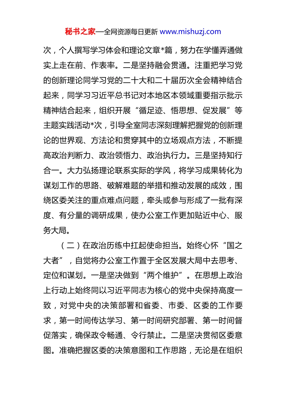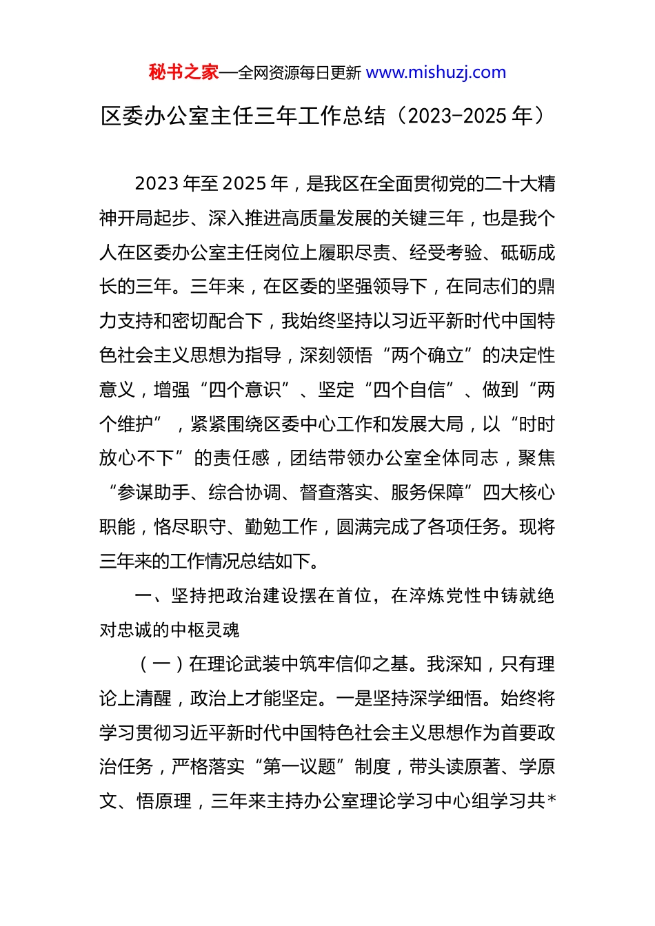 秘书之家—全网资源每日更新 www.mishuzj.com区委办公室主任三年工作总结(2023-2025 年) 2023 年至 2025 年,是我区在全面贯彻党的二十大精神开局起步、深入推进高质量发展的关键三年,也是我个人在区委办公室主任岗位上履职尽责、经受考验、砥砺成长的三年。三年来,在区委的坚强领导下,在同志们的鼎力支持和密切配合下,我始终坚持以习近平新时代中国特色社会主义思想为指导,深刻领悟“两个确立”的决定性意义,增强“四个意识”、坚定“四个自信”、做到“两个维护”,紧紧围绕区委中心工作和发展大局,以“时时放心不下”的责任感,团结带领办公室全体同志,聚焦“参谋助手、综合协调、督查落实、服务保障”四大核心职能,恪尽职守、勤勉工作,圆满完成了各项任务。现将三年来的工作情况总结如下。一、坚持把政治建设摆在首位,在淬炼党性中铸就绝对忠诚的中枢灵魂(一)在理论武装中筑牢信仰之基。我深知,只有理论上清醒,政治上才能坚定。一是坚持深学细悟。始终将学习贯彻习近平新时代中国特色社会主义思想作为首要政治任务,严格落实“第一议题”制度,带头读原著、学原文、悟原理,三年来主持办公室理论学习中心组学习共*秘书之家—全网资源每日更新 www.mishuzj.com次,个人撰写学习体会和理论文章*篇,努力在学懂弄通做实上走在前、作表率。二是坚持融会贯通。注重把学习党的创新理论同学习党的二十大和二十届历次全会精神结合起来,同学习习近平总书记对本地区本领域重要指示批示精神结合起来,组织开展“循足迹、悟思想、促发展”等主题实践活动*次,引导全室同志深刻理解把握党的创新理论的世界观、方法论和贯穿其中的立场观点方法,不断提高政治判断力、政治领悟力、政治执行力。三是坚持知行合一。大力弘扬理论联系实际的学风,将学习成果转化为谋划工作的思路、破解难题的举措和推动发展的成效,围绕区委关注的重点难点问题,牵头或参与形成了一批有深度、有分量的调研成果,使办公室工作更加贴近中心、服务大局。(二)在政治历练中扛起使命担当。始终心怀“国之大者”,自觉将办公室工作置于全区发展大局中去思考、定位和谋划。一是坚决做到“两个维护”。在思想上政治上行动上始终同以习近平同志为核心的党中央保持高度一致,对党中央的决策部署和省委、市委、区委的工作要求,第一时间传达学习、第一时间研究部署、第一时间督促落实,确保政令畅通、令行禁止。二是坚决贯彻区委意图。准确把握区委的决策意图和工作思路,无论是在组织秘书之家—全网资源每日更新 www.mishuzj.com重大会议、起草重要文稿,还是在办理日常事务中,都自觉对标对表,确保办公室各项工作始终与区委中心工作同频共振、同向发力。三是坚决严守纪律规矩。带头严格遵守党的政治纪律和政治规矩,教育引导全室同志深刻认识“五个必须”、坚决防止“七个有之”,强化保密意识,严格执行保密规定,三年来未发生任何失泄密事件,营造了风清气正的良好政治生态。二、坚持把服务大局作为核心,在出谋划策中贡献精准高效的参谋智慧(一)大兴调查研究,力求“谋”之有据。没有调查,就没有发言权,更没有决策权。一是坚持问题导向。紧扣全区产业转型、城市更新、乡村振兴、民生改善等中心工作,牵头制定年度调研计划,带领或协同相关同志深入基层一线、田间地头、工厂车间,解剖麻雀、摸清实情。三年来,累计开展专题调研*余次,形成高质量调研报告*篇,其中*篇报告得到区委主要领导批示肯定,相关建议被转化为具体政策举措。二是创新方式方法。积极运用座谈访谈、问卷调查、统计分析、“四不两直”等多种方式,广泛听取各方意见,确保掌握的情况真实、全面、客观。特别是针对群众反映强烈的急难愁盼问题,我们建立民情直报点*个,让“沾着泥土、带着露珠、冒着热气”的秘书之家—全网资源每日更新 www.mishuzj.com一线声音直达区委。三是注重成果转化。加强对调研成果的综合提炼和深度加工,不仅提出问题,更注重提出切实可行、操作性强的对策建议,真正把调研成果转化为推动工作的“金点子”和解决问题的“金钥匙”。(二)精耕以文辅政,力求“文”之有效。文稿起草是办公室服...