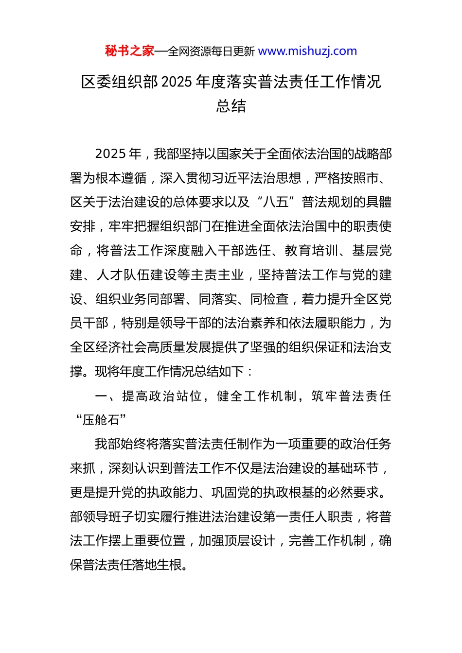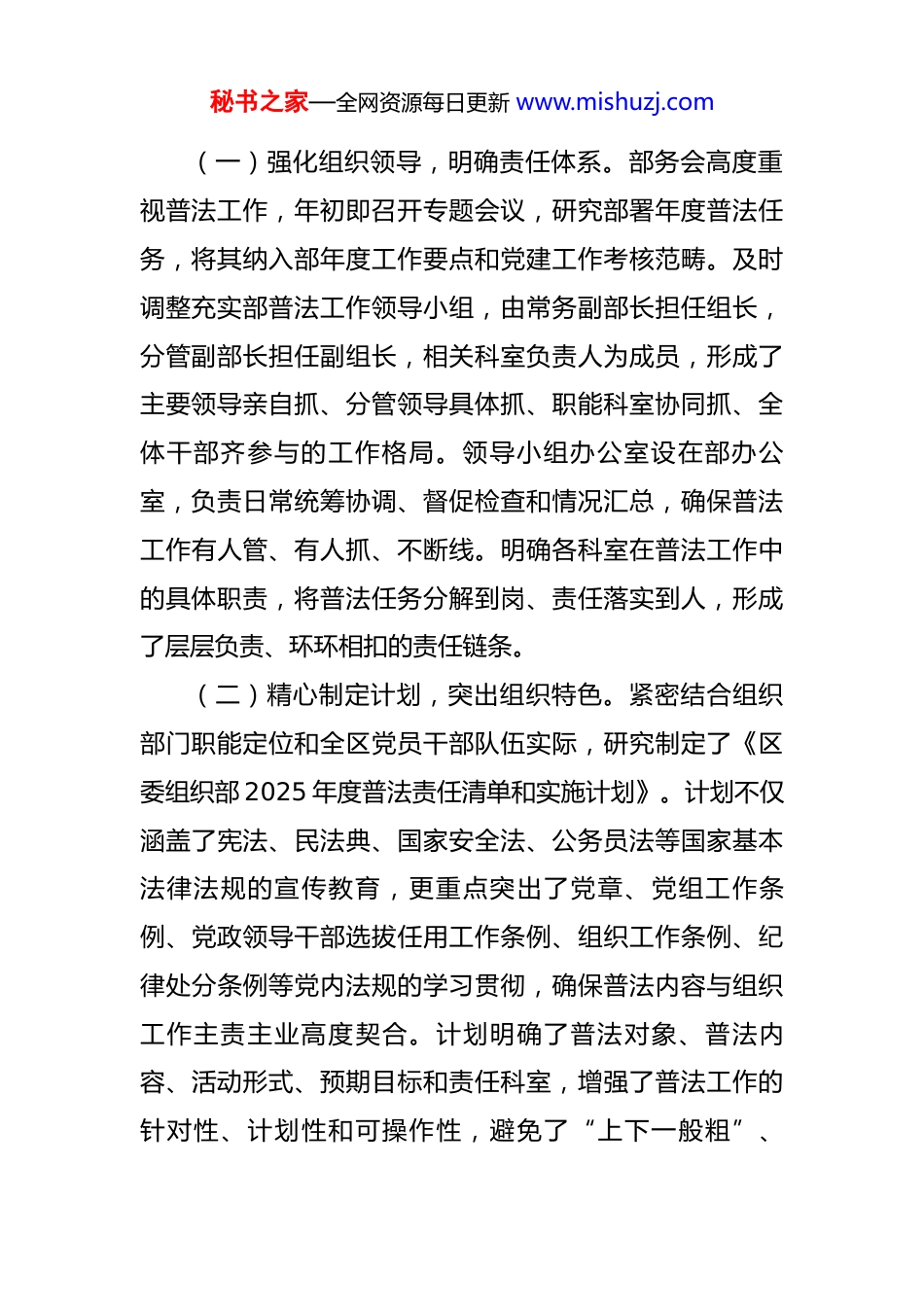 秘书之家—全网资源每日更新 www.mishuzj.com区委组织部 2025 年度落实普法责任工作情况总结 2025 年,我部坚持以国家关于全面依法治国的战略部署为根本遵循,深入贯彻习近平法治思想,严格按照市、区关于法治建设的总体要求以及“八五”普法规划的具體安排,牢牢把握组织部门在推进全面依法治国中的职责使命,将普法工作深度融入干部选任、教育培训、基层党建、人才队伍建设等主责主业,坚持普法工作与党的建设、组织业务同部署、同落实、同检查,着力提升全区党员干部,特别是领导干部的法治素养和依法履职能力,为全区经济社会高质量发展提供了坚强的组织保证和法治支撑。现将年度工作情况总结如下:一、提高政治站位,健全工作机制,筑牢普法责任“压舱石”我部始终将落实普法责任制作为一项重要的政治任务来抓,深刻认识到普法工作不仅是法治建设的基础环节,更是提升党的执政能力、巩固党的执政根基的必然要求。部领导班子切实履行推进法治建设第一责任人职责,将普法工作摆上重要位置,加强顶层设计,完善工作机制,确保普法责任落地生根。秘书之家—全网资源每日更新 www.mishuzj.com(一)强化组织领导,明确责任体系。部务会高度重视普法工作,年初即召开专题会议,研究部署年度普法任务,将其纳入部年度工作要点和党建工作考核范畴。及时调整充实部普法工作领导小组,由常务副部长担任组长,分管副部长担任副组长,相关科室负责人为成员,形成了主要领导亲自抓、分管领导具体抓、职能科室协同抓、全体干部齐参与的工作格局。领导小组办公室设在部办公室,负责日常统筹协调、督促检查和情况汇总,确保普法工作有人管、有人抓、不断线。明确各科室在普法工作中的具体职责,将普法任务分解到岗、责任落实到人,形成了层层负责、环环相扣的责任链条。(二)精心制定计划,突出组织特色。紧密结合组织部门职能定位和全区党员干部队伍实际,研究制定了《区委组织部 2025 年度普法责任清单和实施计划》。计划不仅涵盖了宪法、民法典、国家安全法、公务员法等国家基本法律法规的宣传教育,更重点突出了党章、党组工作条例、党政领导干部选拔任用工作条例、组织工作条例、纪律处分条例等党内法规的学习贯彻,确保普法内容与组织工作主责主业高度契合。计划明确了普法对象、普法内容、活动形式、预期目标和责任科室,增强了普法工作的针对性、计划性和可操作性,避免了“上下一般粗”、秘书之家—全网资源每日更新 www.mishuzj.com“大水漫灌”现象。(三)健全保障机制,注重常态长效。将普法工作经费纳入部年度预算,为购买学习资料、开展普法活动、建设宣传阵地等提供必要的资金保障。建立健全普法工作学习制度、考核评估制度和信息报送制度,将普法工作成效纳入科室及个人年度考核评价体系,作为评优评先的重要参考,激发内生动力。定期召开普法工作例会,听取进展情况汇报,研究解决存在问题,部署下一阶段任务,确保普法工作有计划、有步骤、有成效地持续推进。同时,加强与区委依法治区办、区司法局等部门的沟通协调,主动接受指导和监督,形成工作联动、信息共享的普法合力。二、聚焦关键对象,创新载体形式,提升普法宣传“精准度”我部坚持分类指导、按需施教的原则,紧紧抓住领导干部这个“关键少数”、新录用公务员和青年党员这个“新生力量”、广大基层党组织和党员这个“绝大多数”,不断创新普法载体和形式,努力提升普法的吸引力、感染力和实效性。(一)紧盯“关键少数”,强化领导干部法治思维。一是将法治教育作为领导干部学习的“必修课”。坚持把宪法法律和党内法规纳入党委(党组)理论学习中心组学秘书之家—全网资源每日更新 www.mishuzj.com习重要内容,部领导班子带头学习,每年至少举办 2 期法治专题学习。在全区区管干部进修班、中青年干部培训班等主体班次中,法治教育课时比重均超过 10%,邀请法学专家、纪委监委同志、司法实务工作者进行专题授课,重点解读与履职密切相关的法律法规,增强其运用法治思维和法治方式深化改革、推动发展、化解矛盾、维护稳定的能力。二是将法治素养作为干部选任的“硬标尺”。在干部选拔任用、职级晋升...