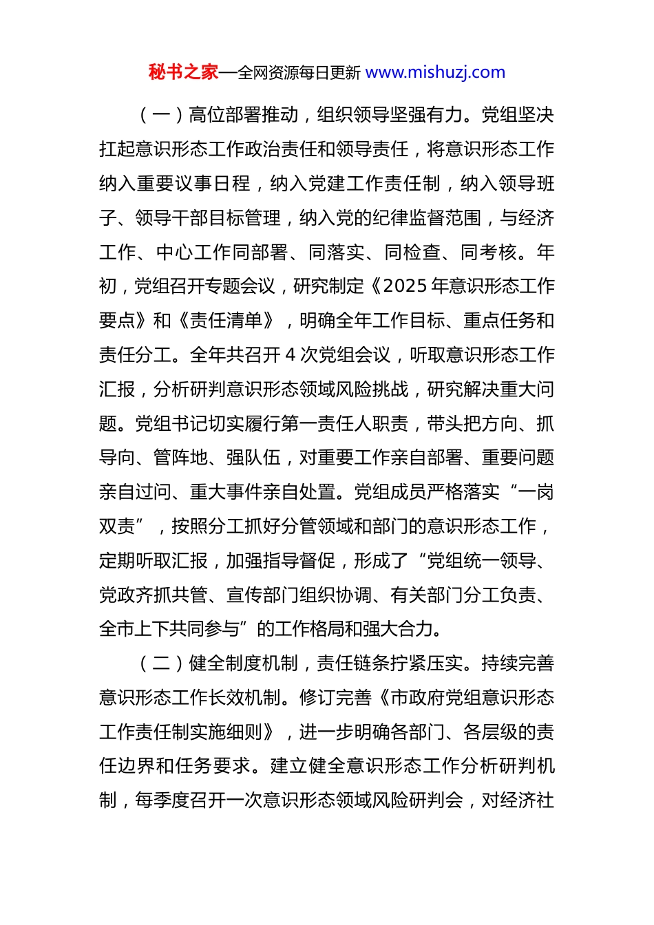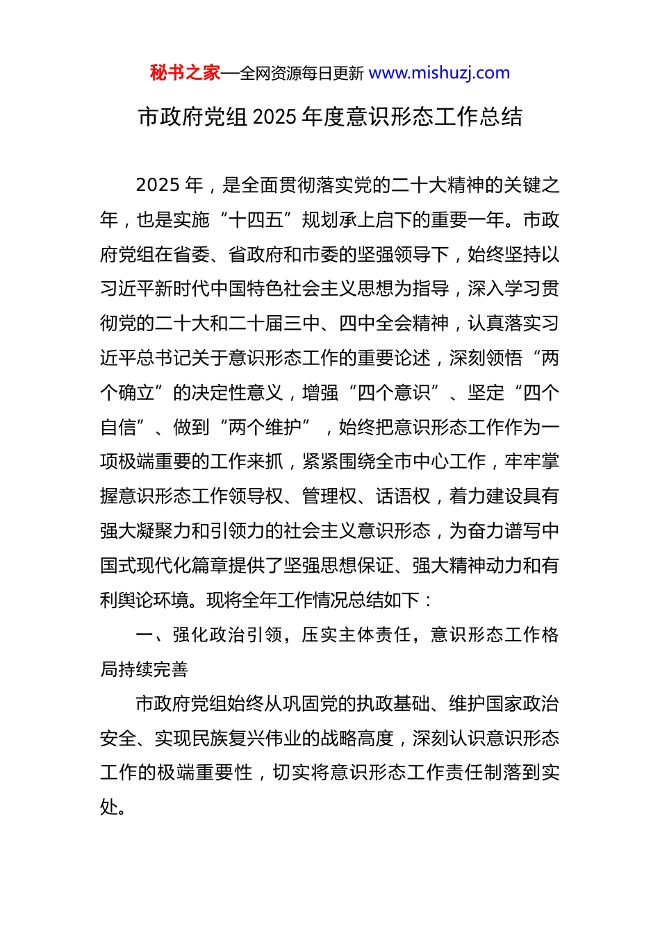 秘书之家—全网资源每日更新 www.mishuzj.com市政府党组 2025 年度意识形态工作总结 2025 年,是全面贯彻落实党的二十大精神的关键之年,也是实施“十四五”规划承上启下的重要一年。市政府党组在省委、省政府和市委的坚强领导下,始终坚持以习近平新时代中国特色社会主义思想为指导,深入学习贯彻党的二十大和二十届三中、四中全会精神,认真落实习近平总书记关于意识形态工作的重要论述,深刻领悟“两个确立”的决定性意义,增强“四个意识”、坚定“四个自信”、做到“两个维护”,始终把意识形态工作作为一项极端重要的工作来抓,紧紧围绕全市中心工作,牢牢掌握意识形态工作领导权、管理权、话语权,着力建设具有强大凝聚力和引领力的社会主义意识形态,为奋力谱写中国式现代化篇章提供了坚强思想保证、强大精神动力和有利舆论环境。现将全年工作情况总结如下:一、强化政治引领,压实主体责任,意识形态工作格局持续完善市政府党组始终从巩固党的执政基础、维护国家政治安全、实现民族复兴伟业的战略高度,深刻认识意识形态工作的极端重要性,切实将意识形态工作责任制落到实处。秘书之家—全网资源每日更新 www.mishuzj.com(一)高位部署推动,组织领导坚强有力。党组坚决扛起意识形态工作政治责任和领导责任,将意识形态工作纳入重要议事日程,纳入党建工作责任制,纳入领导班子、领导干部目标管理,纳入党的纪律监督范围,与经济工作、中心工作同部署、同落实、同检查、同考核。年初,党组召开专题会议,研究制定《2025 年意识形态工作要点》和《责任清单》,明确全年工作目标、重点任务和责任分工。全年共召开 4 次党组会议,听取意识形态工作汇报,分析研判意识形态领域风险挑战,研究解决重大问题。党组书记切实履行第一责任人职责,带头把方向、抓导向、管阵地、强队伍,对重要工作亲自部署、重要问题亲自过问、重大事件亲自处置。党组成员严格落实“一岗双责”,按照分工抓好分管领域和部门的意识形态工作,定期听取汇报,加强指导督促,形成了“党组统一领导、党政齐抓共管、宣传部门组织协调、有关部门分工负责、全市上下共同参与”的工作格局和强大合力。(二)健全制度机制,责任链条拧紧压实。持续完善意识形态工作长效机制。修订完善《市政府党组意识形态工作责任制实施细则》,进一步明确各部门、各层级的责任边界和任务要求。建立健全意识形态工作分析研判机制,每季度召开一次意识形态领域风险研判会,对经济社秘书之家—全网资源每日更新 www.mishuzj.com会热点、网络舆情动态、思想理论动向等进行深入分析,提前预警,有效防范。强化督查考核,将意识形态工作纳入年度绩效考核和干部考察内容,制定科学合理的考核指标,对落实不力的单位和个人进行严肃问责,确保压力传导到位、责任落实到位。完善信息报送和共享机制,要求各部门及时报送意识形态领域重要情况,确保信息畅通、反应迅速。(三)强化协同联动,工作合力显著增强。加强政府系统内部以及与市委宣传部、网信办等部门的横向联系与协作,定期沟通情况,协调步骤,形成工作合力。指导督促各县(市、区)政府、市政府各部门党组(党委)建立健全相应的工作机制,将意识形态工作要求贯穿于行政决策、政策制定、行业管理、公共服务等各项工作中,实现了意识形态工作与业务工作深度融合、同频共振。二、深化理论武装,筑牢思想根基,理想信念教育走深走实坚持把理论学习作为首要任务,持续推动习近平新时代中国特色社会主义思想入脑入心,夯实团结奋斗的共同思想基础。(一)抓实中心组学习,发挥示范效应。制定并严格执行《2025 年市政府党组理论学习中心组学习计划》,将秘书之家—全网资源每日更新 www.mishuzj.com学习贯彻习近平新时代中国特色社会主义思想作为主线,重点围绕党的二十大精神、习近平总书记关于当前各项工作的最新重要讲话和指示批示精神、党史国史、宪法法律、党章党规党纪、意识形态理论等专题,采取集体学习研讨、个人自学、专家辅导、现场教学等多种形式,深学细悟,交流互鉴。全年组织中心组学习 12 次,其中专题研讨 6 次,邀请知名专家学者作辅导报告 4...