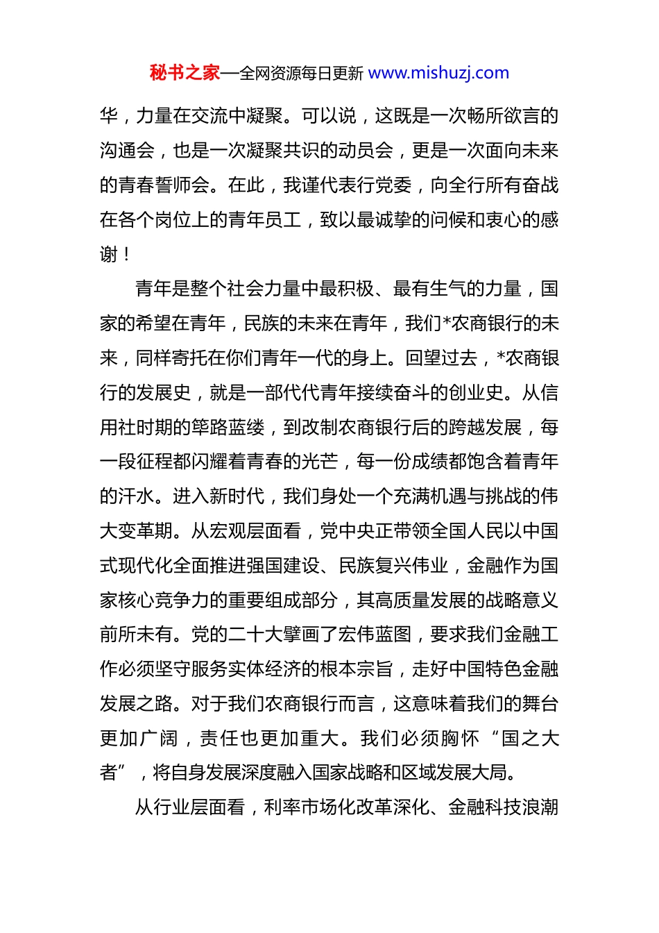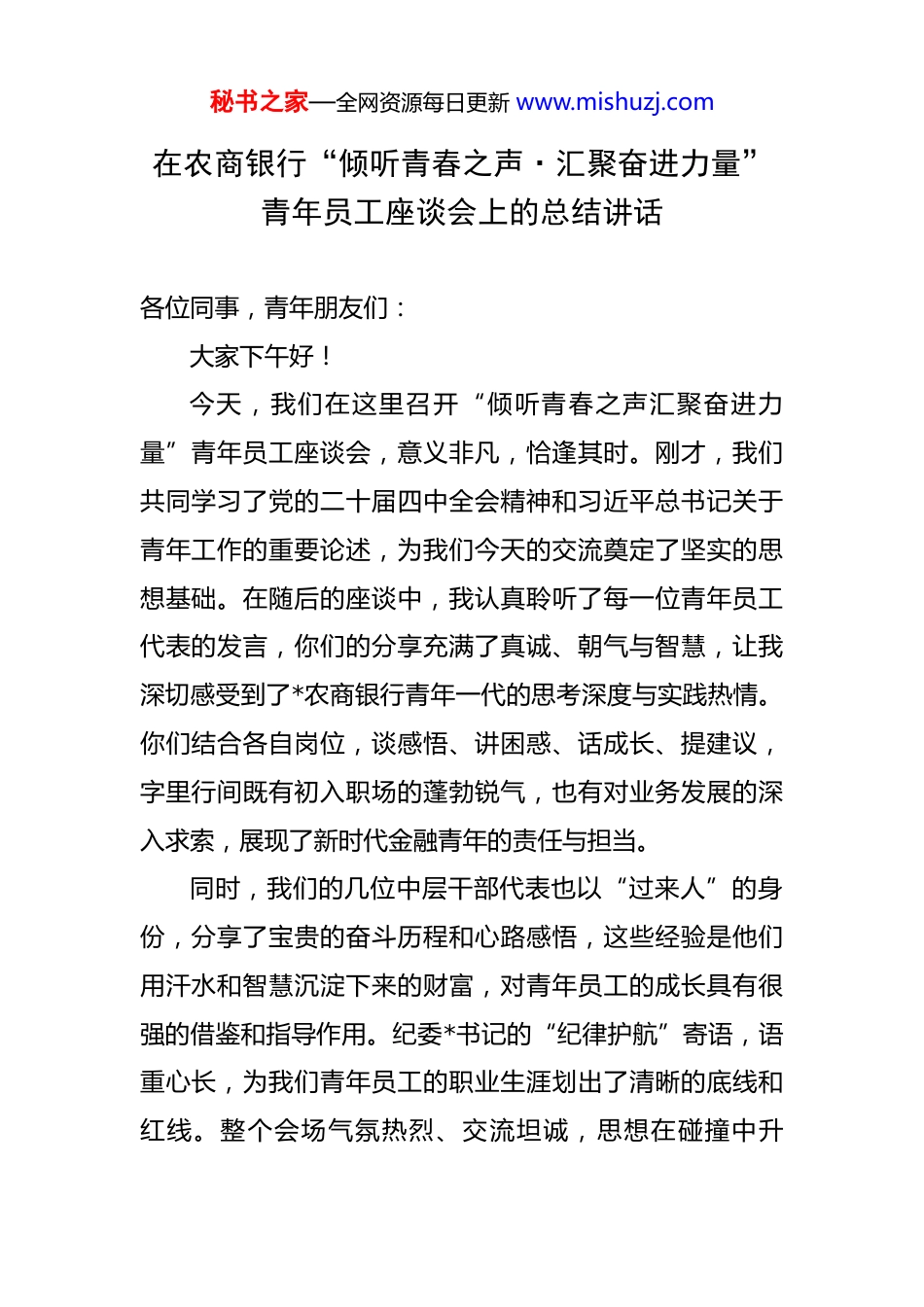 秘书之家—全网资源每日更新 www.mishuzj.com在农商银行“倾听青春之声·汇聚奋进力量”青年员工座谈会上的总结讲话 各位同事,青年朋友们:大家下午好!今天,我们在这里召开“倾听青春之声汇聚奋进力量”青年员工座谈会,意义非凡,恰逢其时。刚才,我们共同学习了党的二十届四中全会精神和习近平总书记关于青年工作的重要论述,为我们今天的交流奠定了坚实的思想基础。在随后的座谈中,我认真聆听了每一位青年员工代表的发言,你们的分享充满了真诚、朝气与智慧,让我深切感受到了*农商银行青年一代的思考深度与实践热情。你们结合各自岗位,谈感悟、讲困惑、话成长、提建议,字里行间既有初入职场的蓬勃锐气,也有对业务发展的深入求索,展现了新时代金融青年的责任与担当。同时,我们的几位中层干部代表也以“过来人”的身份,分享了宝贵的奋斗历程和心路感悟,这些经验是他们用汗水和智慧沉淀下来的财富,对青年员工的成长具有很强的借鉴和指导作用。纪委*书记的“纪律护航”寄语,语重心长,为我们青年员工的职业生涯划出了清晰的底线和红线。整个会场气氛热烈、交流坦诚,思想在碰撞中升秘书之家—全网资源每日更新 www.mishuzj.com华,力量在交流中凝聚。可以说,这既是一次畅所欲言的沟通会,也是一次凝聚共识的动员会,更是一次面向未来的青春誓师会。在此,我谨代表行党委,向全行所有奋战在各个岗位上的青年员工,致以最诚挚的问候和衷心的感谢!青年是整个社会力量中最积极、最有生气的力量,国家的希望在青年,民族的未来在青年,我们*农商银行的未来,同样寄托在你们青年一代的身上。回望过去,*农商银行的发展史,就是一部代代青年接续奋斗的创业史。从信用社时期的筚路蓝缕,到改制农商银行后的跨越发展,每一段征程都闪耀着青春的光芒,每一份成绩都饱含着青年的汗水。进入新时代,我们身处一个充满机遇与挑战的伟大变革期。从宏观层面看,党中央正带领全国人民以中国式现代化全面推进强国建设、民族复兴伟业,金融作为国家核心竞争力的重要组成部分,其高质量发展的战略意义前所未有。党的二十大擘画了宏伟蓝图,要求我们金融工作必须坚守服务实体经济的根本宗旨,走好中国特色金融发展之路。对于我们农商银行而言,这意味着我们的舞台更加广阔,责任也更加重大。我们必须胸怀“国之大者”,将自身发展深度融入国家战略和区域发展大局。从行业层面看,利率市场化改革深化、金融科技浪潮秘书之家—全网资源每日更新 www.mishuzj.com奔涌、同业竞争日趋激烈,这些都对我们的经营管理、风险控制、产品创新提出了前所未有的新要求。变局之中,唯有改革者进,唯有创新者强,唯有改革创新者胜。而青年员工思想最活跃、观念最新颖、接受新事物最快,你们正是我们应对挑战、推动创新、赢得未来的关键力量。从我行自身发展来看,我们正处在转型升级、提质增效的关键阶段。截至 2024 年末,我行总资产规模已突破*亿元大关,各项存款余额达到*亿元,各项贷款余额攀升至*亿元,存贷款规模和增量均位居区域同业前列,不良贷款率控制在 1.5%以下,实现了规模、效益、质量的协同发展。这些成绩的取得,离不开全行上下的共同努力,更凝聚着广大青年员工的智慧和汗水。你们有的在营销一线,不畏艰难,走街串巷,用脚步丈量责任,用真诚赢得客户,为业务拓展立下了汗马功劳,比如我们*支行的青年客户经理团队,通过创新的线上社群营销模式,在短短一个季度内成功拓展了超过 3000 个有效数字人民币钱包客户,为我行的数字化转型提供了鲜活的实践样本。有的在运营后台,一丝不苟,精准操作,用严谨守护资金安全,用高效保障业务运转,成为我们风险防线上的坚固基石。有的在科技部门,锐意创新,攻坚克难,推动着我行信贷系统、手机银行等核心应用的迭代升级,为业务发展提供了强大的科秘书之家—全网资源每日更新 www.mishuzj.com技支撑。你们在平凡的岗位上创造了不平凡的业绩,你们是*农商银行最宝贵的财富,是推动我行事业航船乘风破浪、行稳致远最蓬勃的青春动能。借此机会,结合大家的发言和我的思考,我向全行青年员工提出四点希望,与大家共勉:第一,要坚定理想...