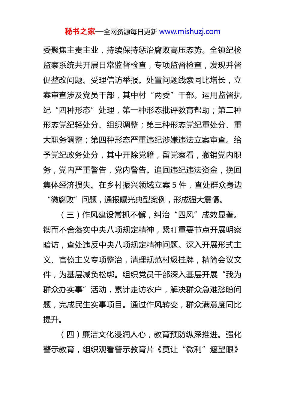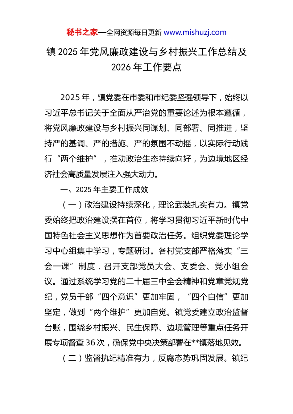 秘书之家—全网资源每日更新 www.mishuzj.com镇 2025 年党风廉政建设与乡村振兴工作总结及2026 年工作要点 2025 年,镇党委在市委和市纪委坚强领导下,始终以习近平总书记关于全面从严治党的重要论述为根本遵循,将党风廉政建设与乡村振兴同谋划、同部署、同推进,坚持严的基调、严的措施、严的氛围不动摇,以实际行动践行“两个维护”,推动政治生态持续向好,为边境地区经济社会高质量发展注入强大动力。一、2025 年主要工作成效(一)政治建设持续深化,理论武装扎实有力。镇党委始终把政治建设摆在首位,将学习贯彻习近平新时代中国特色社会主义思想作为首要政治任务。组织党委理论学习中心组集中学习,专题研讨。各村党支部严格落实“三会一课”制度,召开支部党员大会、支委会、党小组会议。通过系统学习党的二十届三中全会精神和党章党规党纪,党员干部“四个意识”更加牢固,“四个自信”更加坚定,做到“两个维护”更加自觉。镇党委建立政治监督台账,围绕乡村振兴、民生保障、边境管理等重点任务开展专项督查 36 次,确保党中央决策部署在**镇落地见效。(二)监督执纪精准有力,反腐态势巩固发展。镇纪秘书之家—全网资源每日更新 www.mishuzj.com委聚焦主责主业,持续保持惩治腐败高压态势。全镇纪检监察系统共开展日常监督检查,专项监督检查,发现并督促整改问题。受理信访举报。处置问题线索同比增长,立案审查涉及党员干部,其中村“两委”干部。运用监督执纪“四种形态”处理,第一种形态批评教育帮助;第二种形态党纪轻处分、组织调整;第三种形态党纪重处分、重大职务调整;第四种形态严重违纪涉嫌违法立案审查。给予党纪政务处分,其中开除党籍,留党察看,撤销党内职务,党内严重警告,党内警告。追回违纪违法资金,挽回集体经济损失。在乡村振兴领域立案 5 件,查处群众身边“微腐败”问题,通报曝光典型案例,形成强大震慑。(三)作风建设常抓不懈,纠治“四风”成效显著。锲而不舍落实中央八项规定精神,紧盯重要节点开展明察暗访,查处违反中央八项规定精神问题。深入开展形式主义、官僚主义专项整治,清理规范村级挂牌,精简会议文件,为基层减负松绑。组织党员干部深入基层开展“我为群众办实事”活动,累计走访农户,解决群众急难愁盼问题,完成民生实事项目。通过作风转变,群众满意度同比提升。(四)廉洁文化浸润人心,教育预防纵深推进。强化警示教育,组织观看警示教育片《莫让“微利”遮望眼》秘书之家—全网资源每日更新 www.mishuzj.com等专题片。开展党纪党规专题培训,培训党员干部,组织党纪知识测试。打造镇级廉洁文化长廊,村级廉洁文化阵地,开展廉洁文化活动。建立新任村干部任前廉政谈话制度,对新任村干部开展廉政谈话和廉政知识测试。通过常态化教育,党员干部纪律规矩意识显著增强,筑牢拒腐防变思想防线。(五)融合乡村振兴大局,廉洁护航发展提速。坚持将党风廉政建设嵌入乡村振兴全过程,确保项目资金安全、干部廉洁。2025 年,全镇实施乡村振兴项目,其中基础设施项目、产业发展项目、民生保障项目。在项目推进中,镇纪委实施“嵌入式”监督,开展项目专项督查,发现并纠正问题,确保项目廉洁高效。完成农村公路硬化、新建桥梁、改造供水管网、升级电力线路。发展边境特色养殖产业,建成生态养殖基地。推动农旅融合发展,村集体平均增收。通过廉洁护航,乡村振兴项目资金使用合规。(六)边境管理有力有效,安全防线坚实稳固。充分发挥**镇地处边境的特殊属性,将党风廉政建设与边境管理深度融合。开展边境管控专项监督检查 18 次,查处越界捕捞等违规行为 2。加强安全生产监督检查 24 次,排查整改安全隐患 87 处,全年未发生安全生产责任事故。组织党秘书之家—全网资源每日更新 www.mishuzj.com员干部参与边境巡逻 96 人次,筑牢边境安全屏障。通过严明纪律,确保边境管理各项措施落实到位,坚决守住国家安全底线。二、存在的主要问题在肯定成绩的同时,必须清醒认识到工作中存在的不足:一是政治监督精准度仍需提升,对乡村振兴政策落实的深层次问题发现能力有待加强;二是案件查办质效存在短板...