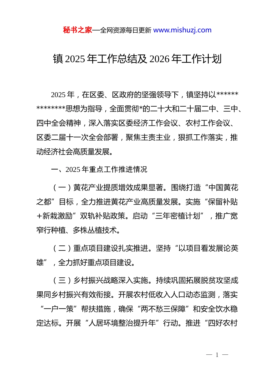 秘书之家—全网资源每日更新 www.mishuzj.com镇 2025 年工作总结及 2026 年工作计划2025 年,在区委、区政府的坚强领导下,镇坚持以**************思想为指导,全面贯彻*的二十大和二十届二中、三中、四中全会精神,深入落实区委经济工作会议、农村工作会议、区委二届十一次全会部署,聚焦主责主业,狠抓工作落实,推动经济社会高质量发展。一、2025 年重点工作推进情况(一)黄花产业提质增效成果显著。围绕打造“中国黄花之都”目标,全力推进黄花产业高质量发展。实施“保留补贴+新栽激励”双轨补贴政策。启动“三年密植计划”,推广宽窄行种植、多株丛植技术。(二)重点项目建设扎实推进。坚持“以项目看发展论英雄”,全力抓好重点项目建设。(三)乡村振兴战略深入实施。持续巩固拓展脱贫攻坚成果同乡村振兴有效衔接。开展农村低收入人口动态监测,落实“一户一策”帮扶措施,确保“两不愁三保障”和安全饮水稳定达标。开展“人居环境整治提升年”行动。推进“四好农村— 1 —秘书之家—全网资源每日更新 www.mishuzj.com路”建设。(四)基层 dj 全面加强。持续巩固 dj 学习教育成果,组织专题学习。扎实开展深入贯彻中央八项规定精神学习教育,通过专题学习、查摆问题、集中整治,建立健全作风建设长效机制。严格落实“三会一课”制度,开展“主题*日+”活动 156次。推进*支部标准化规范化建设,村*支部全部达标。培养入*积极分子,发展*员,为*组织注入新鲜血液。开展“我为群众办实事”实践活动,收集群众意见建议,解决实际问题。(五)社会治理持续优化。坚持和发展新时代“枫桥经验”,深入开展“抓源促治、强基固本”行动。建立领导接访、干部下访、包案化解机制。完善网格化管理,村配齐配强网格员,排查化解各类矛盾纠纷。常态化开展扫黑除恶斗争,破获各类案件。强化安全生产监管,全年未发生较大以上安全事故。做好森林防火工作,设置护林防火点,实现连续 23 年无重大森林火灾。二、一般性常规工作开展情况民生保障扎实有力。落实各类惠民政策,发放低保金、特困供养金、残疾人补贴等各类救助资金。生态环境持续改善。— 2 —秘书之家—全网资源每日更新 www.mishuzj.com深入打好污染防治攻坚战,完成秸秆禁烧监管任务。加强河道巡查管护河长制工作考核位居全区前列。公共服务不断完善。改造提升村级综合文化服务中心,开展文化惠民演出,丰富群众精神文化生活。三、存在的主要问题一是产业发展质效有待提高。黄花产业仍以初级产品为主,精深加工比重偏低,产业链条还需延伸。项目谋划储备不足,缺乏引领性、支撑性重大项目。二是基础设施建设存在短板。部分村道路硬化标准不高,排水设施不完善。农村人居环境整治长效机制不健全,存在反弹现象。三是集体经济实力较弱。村级集体经济发展不平衡,部分村集体收入来源单一,自我发展能力不强。四是干部队伍能力需要提升。少数干部对新形势新要求把握不准,推动工作创新性不够,担当意识和执行力有待增强。四、2026 年工作要点2026 年是“十五五”规划开局之年。工作总体思路是:坚持以**************思想为指导,全面贯彻*的二十大和二十届二中、三中、四中全会精神,认真落实中央和省市区各项决策— 3 —秘书之家—全网资源每日更新 www.mishuzj.com部署,聚焦“十五五”规划目标任务,以高质量发展为主题,以改革创新为动力,以乡村振兴为主线,推动经济社会发展再上新台阶。(一)做强黄花特色产业。(二)加快重点项目建设。(三)全面推进乡村振兴。(四)提升基层治理效能。(五)强化 dj 引领保障。2026 年,我们将在区委、区政府的坚强领导下,踔厉奋发、笃行不怠,以更加昂扬的斗志、更加务实的作风、更加有力的举措,推动镇经济社会高质量发展,为实现“十五五”良好开局作出新的更大贡献!— 4 —