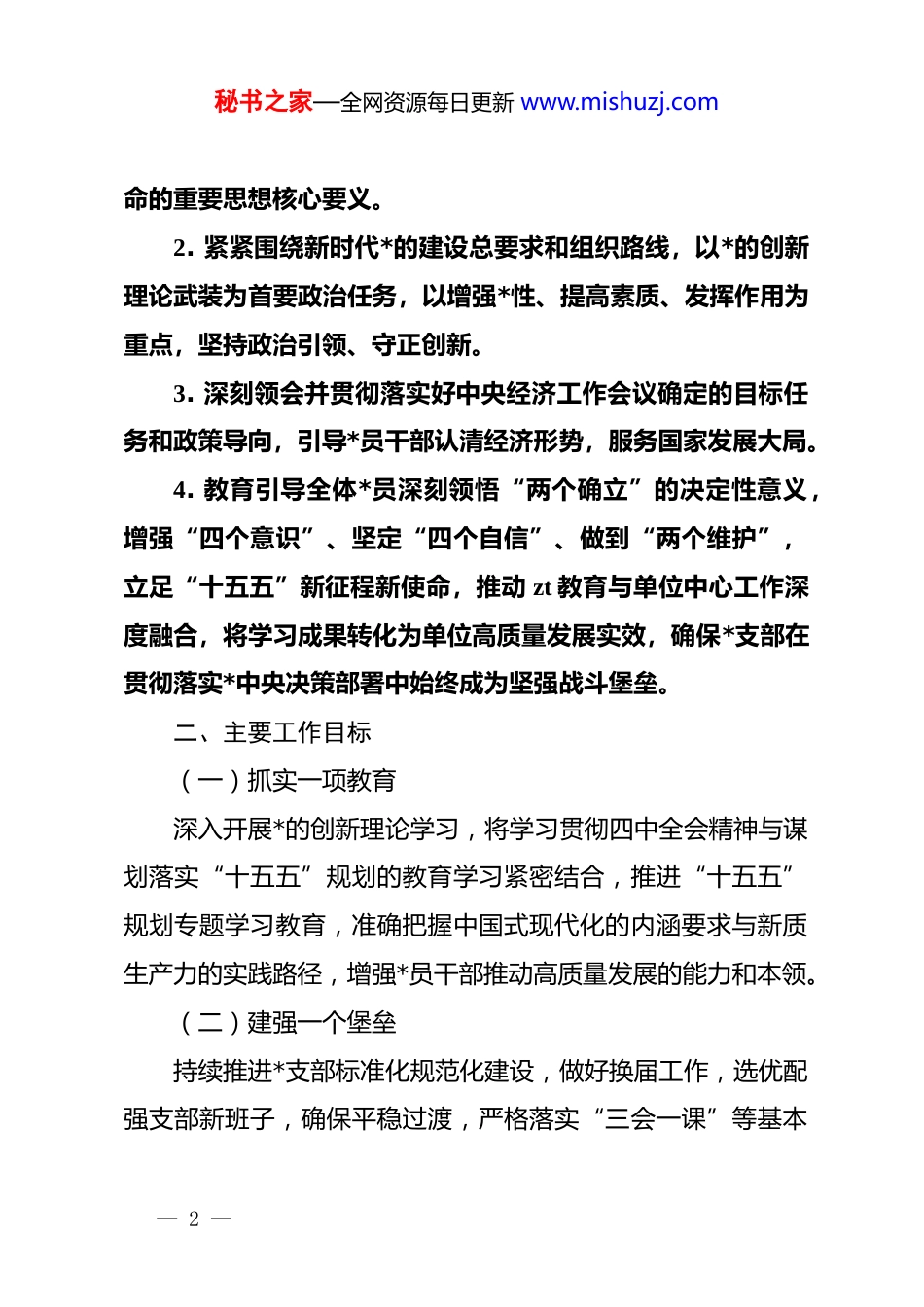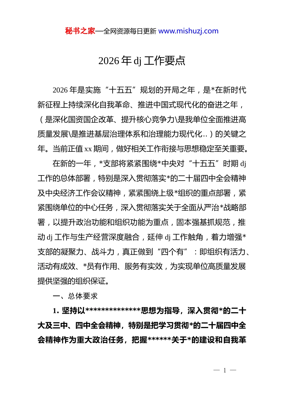 秘书之家—全网资源每日更新 www.mishuzj.com2026 年 dj 工作要点2026 年是实施“十五五”规划的开局之年,是*在新时代新征程上持续深化自我革命、推进中国式现代化的奋进之年,(是深化国资国企改革、提升核心竞争力\是我单位全面推进高质量发展\是推进基层治理体系和治理能力现代化..)的关键之年。当前正值 xx 期间,做好相关工作衔接与思想稳定至关重要。在新的一年,*支部将紧紧围绕*中央对“十五五”时期 dj工作的总体部署,特别是深入贯彻落实*的二十届四中全会精神及中央经济工作会议精神,紧紧围绕上级*组织的重点部署,紧紧围绕单位的中心任务,深入贯彻落实关于全面从严治*战略部署,以提升政治功能和组织功能为重点,固本强基抓规范,推动 dj 工作与生产经营深度融合,延伸 dj 工作触角,着力增强*支部的凝聚力、战斗力,真正做到“四个有”:即组织有活力、活动有成效、*员有作用、服务有实效,为实现单位高质量发展提供坚强的组织保证。一、总体要求1. 坚持以**************思想为指导,深入贯彻*的二十大及三中、四中全会精神,特别是把学习贯彻*的二十届四中全会精神作为重大政治任务,把握******关于*的建设和自我革— 1 —秘书之家—全网资源每日更新 www.mishuzj.com命的重要思想核心要义。2. 紧紧围绕新时代*的建设总要求和组织路线,以*的创新理论武装为首要政治任务,以增强*性、提高素质、发挥作用为重点,坚持政治引领、守正创新。3. 深刻领会并贯彻落实好中央经济工作会议确定的目标任务和政策导向,引导*员干部认清经济形势,服务国家发展大局。4. 教育引导全体*员深刻领悟“两个确立”的决定性意义,增强“四个意识”、坚定“四个自信”、做到“两个维护”,立足“十五五”新征程新使命,推动 zt 教育与单位中心工作深度融合,将学习成果转化为单位高质量发展实效,确保*支部在贯彻落实*中央决策部署中始终成为坚强战斗堡垒。二、主要工作目标(一)抓实一项教育深入开展*的创新理论学习,将学习贯彻四中全会精神与谋划落实“十五五”规划的教育学习紧密结合,推进“十五五”规划专题学习教育,准确把握中国式现代化的内涵要求与新质生产力的实践路径,增强*员干部推动高质量发展的能力和本领。(二)建强一个堡垒持续推进*支部标准化规范化建设,做好换届工作,选优配强支部新班子,确保平稳过渡,严格落实“三会一课”等基本— 2 —秘书之家—全网资源每日更新 www.mishuzj.com制度,打造具有辨识度的 dj 品牌,全面提升*支部组织力。(三)锻造一支队伍加强*员教育管理监督,完善*员作用发挥机制,着力建设政治坚定、业务精湛、作风过硬、敢于斗争的*员队伍,让*员骨干成为推动发展的核心力量。(四)完善一套机制健全 dj 工作与业务工作深度融合机制,建立“我为群众办实事”长效机制,完善急难险重任务应对机制,形成责任明确、运转高效的 dj 工作格局。(五)营造一方清风深化*风廉政建设和反腐败工作,加强廉洁文化建设,将廉政监督嵌入关键环节,营造风清气正的政治生态。三、七项重点任务(一)深化政治建设,筑牢忠诚根基1. 强化政治忠诚教育:落实“第一议题”制度,常态化开展忠诚教育实践活动,通过专题*课、先进事迹宣讲、红色教育基地现场教学等形式,推动*员干部把政治忠诚融入履职全过程。2. 严明政治纪律规矩:加强《中国共产 dj 律处分条例》等*内法规学习,聚焦政治纪律、组织纪律等重点,开展专项监督检查,及时纠正贯彻落实*中央决策部署中的偏差,对违反纪律— 3 —秘书之家—全网资源每日更新 www.mishuzj.com规矩的行为严肃追责问责。3. 确保政令畅通无阻:建立*中央决策部署及上级*组织工作要求落实台账,将“十五五”规划重点任务分解到岗、责任到人,实行清单化管理、项目化推进,定期开展督查督办,确保各项部署落地见效。(二)强化理论武装,夯实思想之基1. 系统学习*的创新理论:构建“集中学习+个人自学+专题研讨+线上课堂”四位一体学习体系,把**************思想、******关于*的建设和自我革命的重要思想作为*员学习的核心内容,每月开展 1 次集中学习研讨,每季度组织...